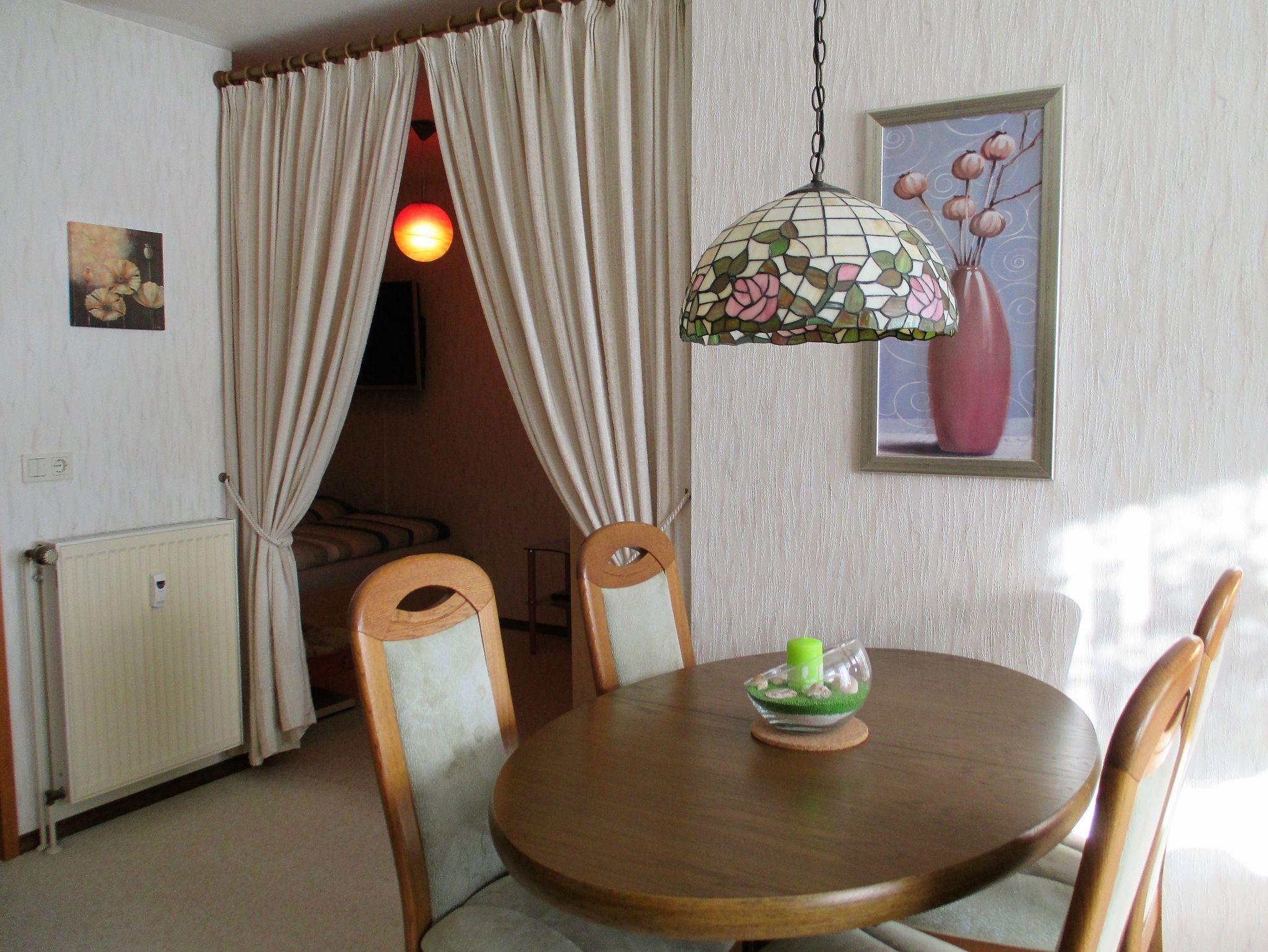 Unsere Wohnung Ginger wurde nach unserem Jungpferd, welches bei uns auf der Finkenmühle geboren wurde, benannt. Die Wohnung befindet sich in der zweiten Etage und hat einen Balkon, auf dem man schon zum Frühstück die Sonne genießen kann. Die Wohnung verfügt über einen Flur mit Schrank, einen großen Wohn-Essbereich mit Flachbildfernseher, eine große Einbauküche, ausgestattet mit Kühl-Gefrierschrank, Toaster, Kaffeemaschine etc., ein Schlafzimmer mit Doppelbett (140cm x 200cm) und Flachbildfernseher, einen zweiten Schlafraum mit zwei Einzelbetten (90cm x 200cm) und ein Bad mit Dusche, Waschtisch, Spiegelschrank mit Beleuchtung, WC und Waschmaschine( zusätzliche Kosten durch Benutzung der Waschmaschine, da diese durch einen Münzautomat betrieben wird).