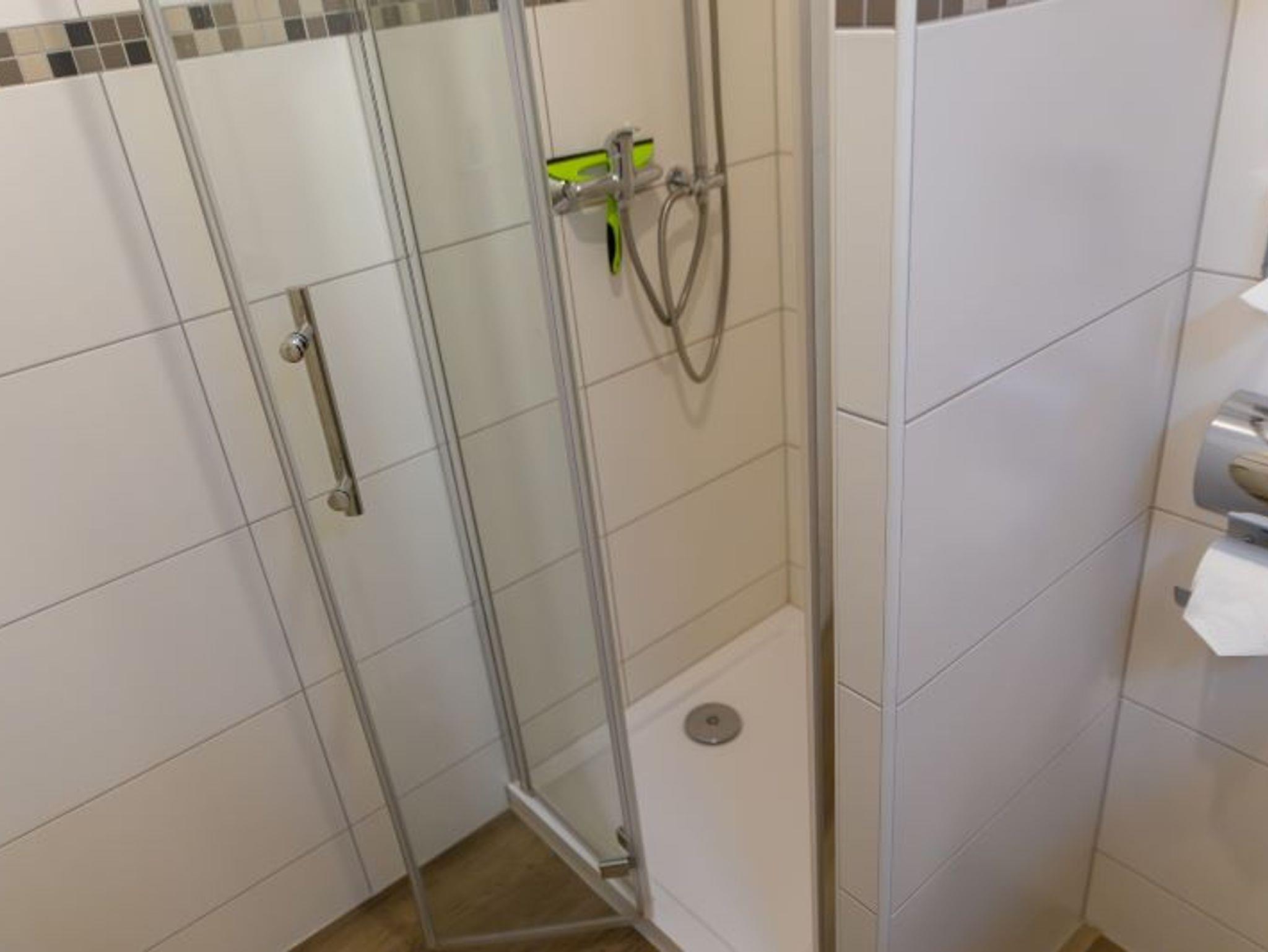 Das Bad verfügt über einen Waschtisch mit beleuchtetem Spiegelschrank, eine Dusche und WC.