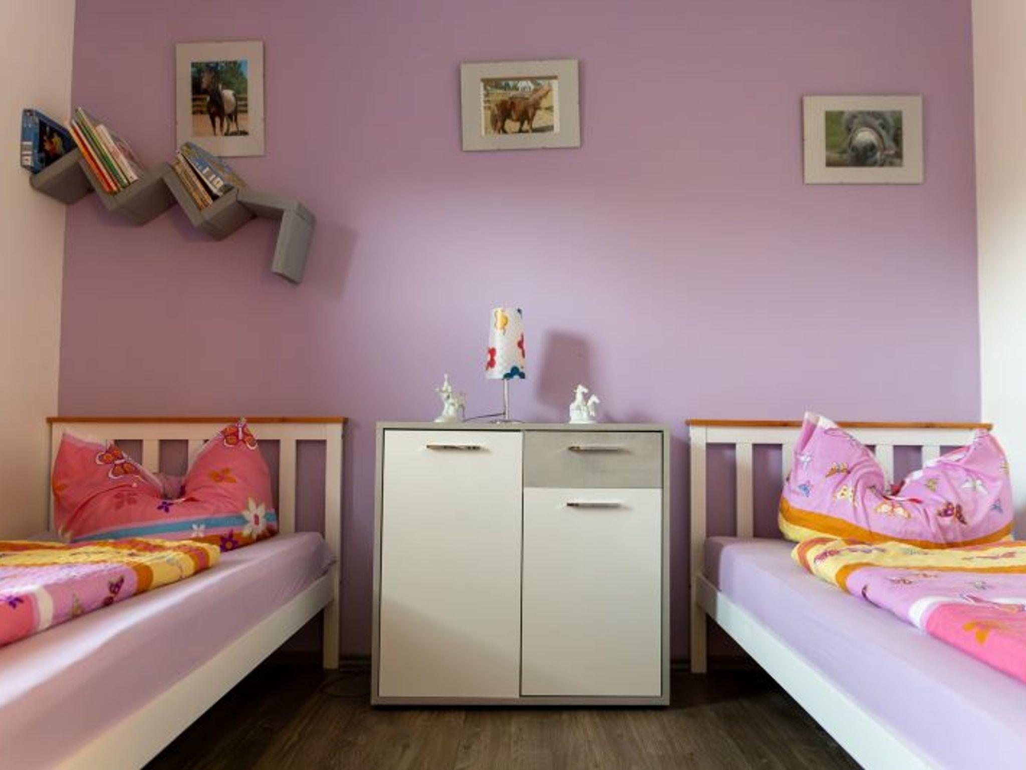 Im zweiten Schlafzimmer/Kinderzimmer befinden sich ein Ausziehbett mit bis zu zwei Schlafplätzen (je 80cm x 200cm), ein Nachtschränkchen und eine kleine Kommode.