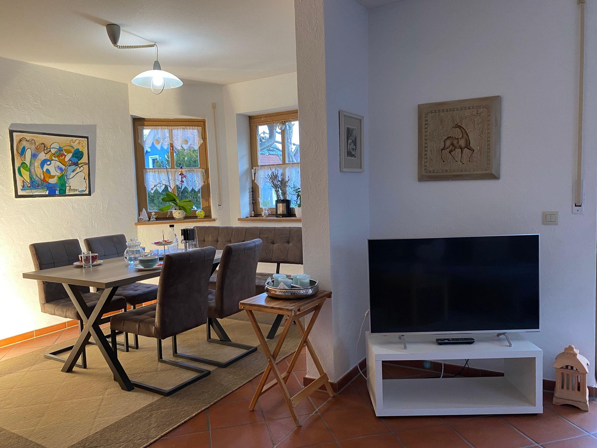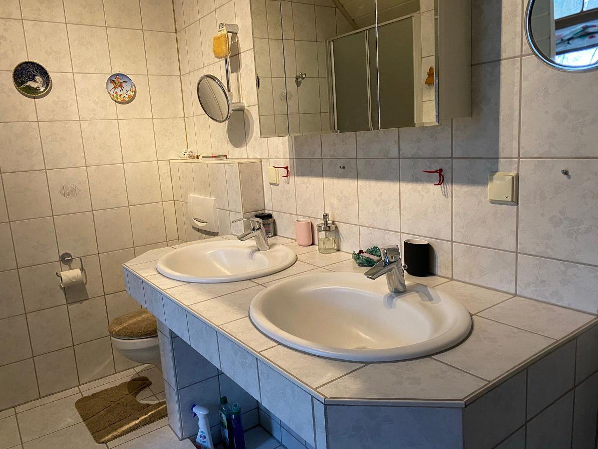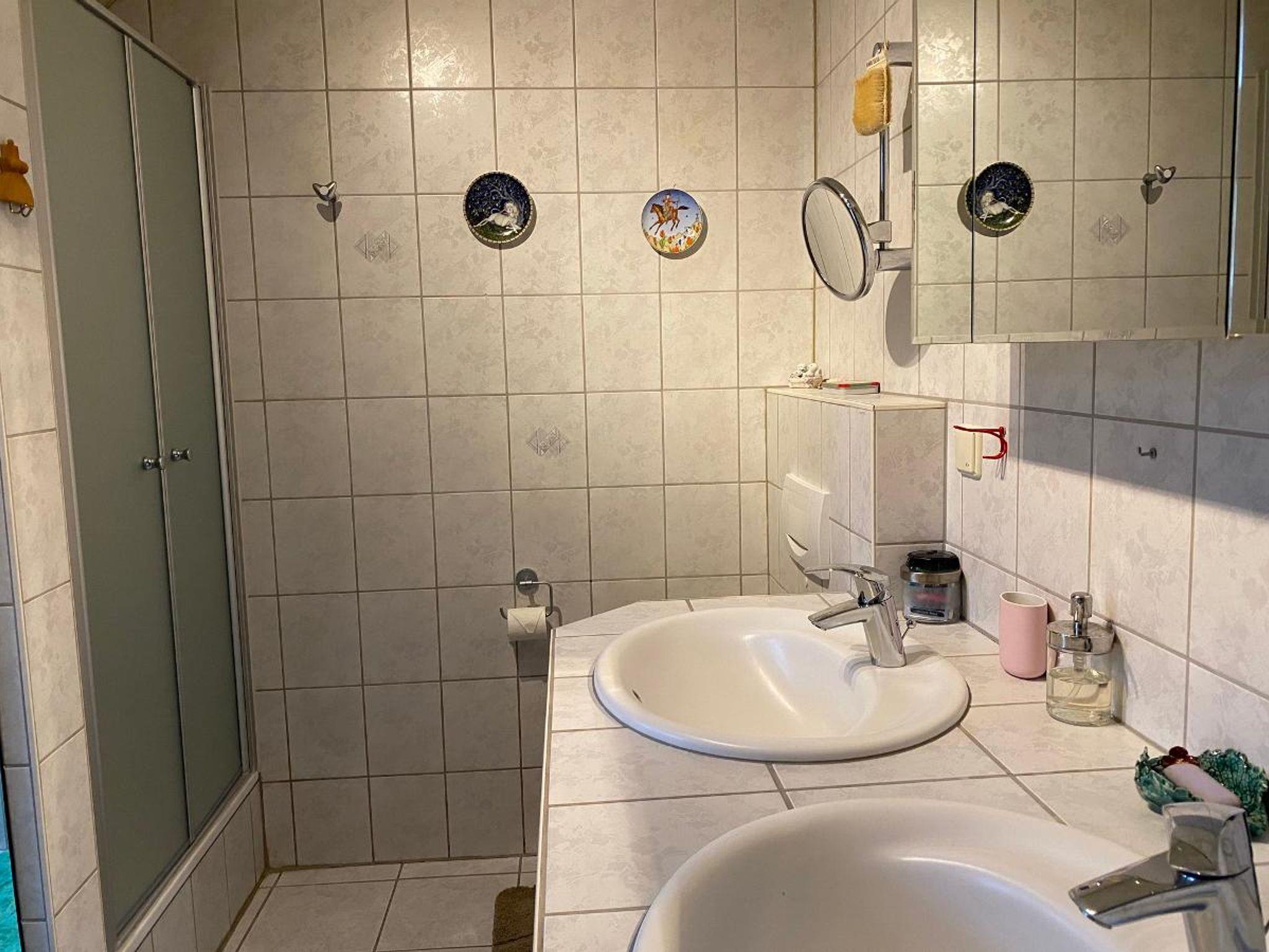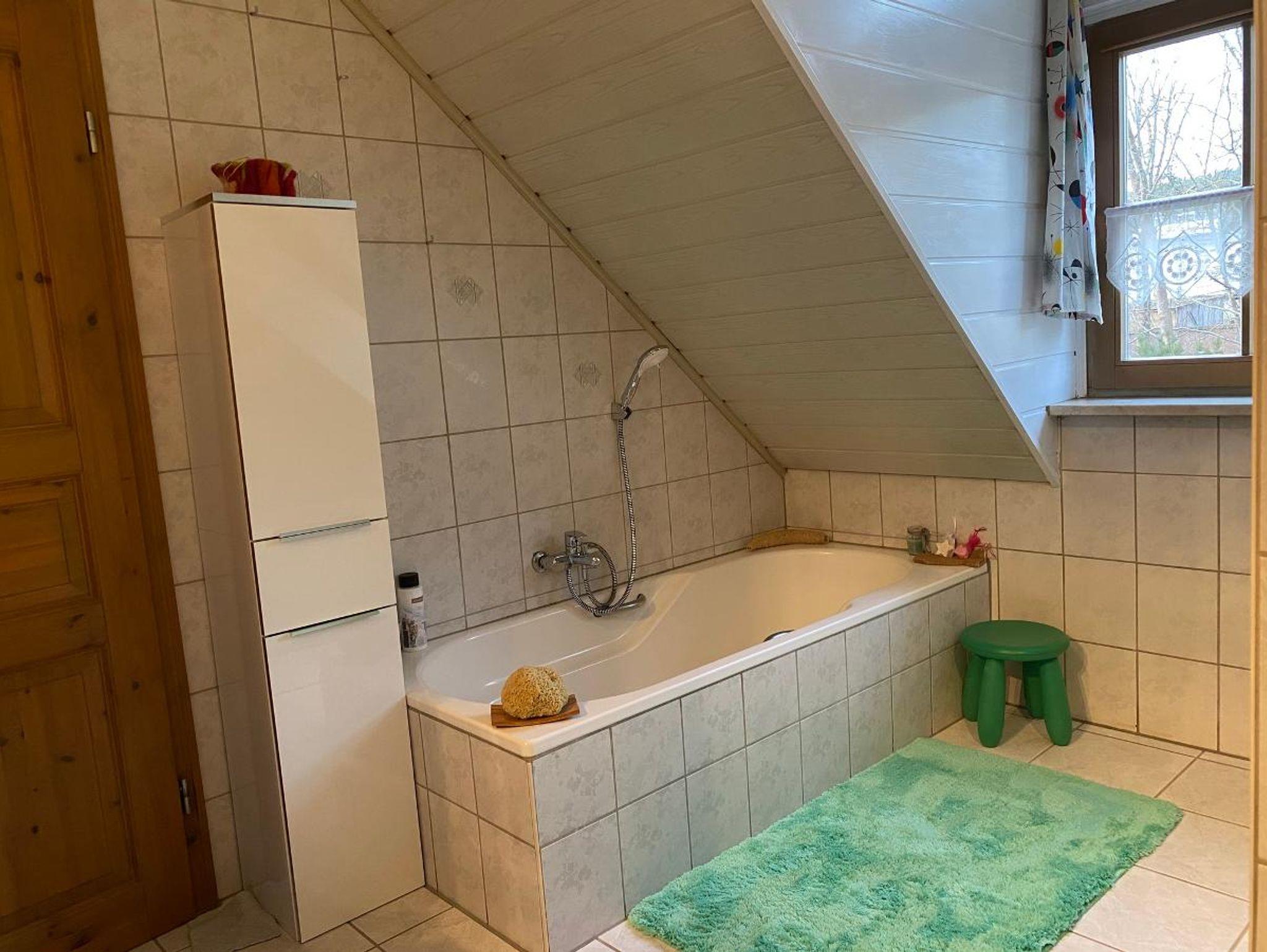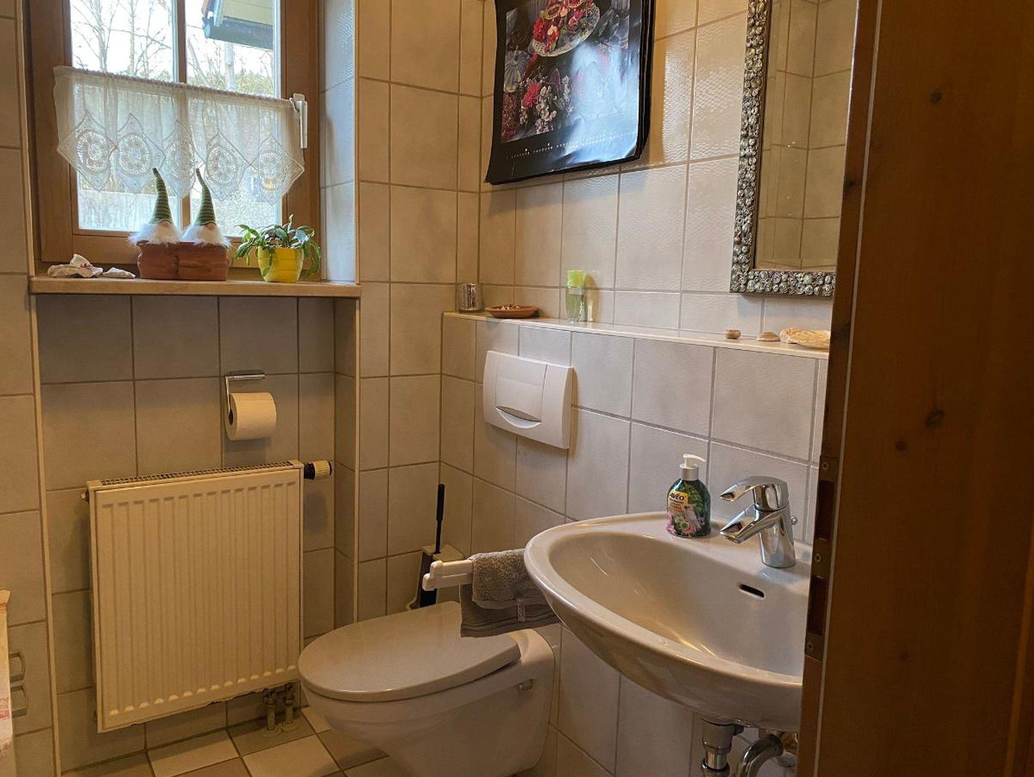 Das Bad verfügt über Dusche, Badewanne, WC, doppeltenm Waschbeckenund Ganzkörperspiegel. Es ist ebenfalls ein zusätzliches Gäste-WC (Sparspülung an der Wand) mit Waschbecken vorhanden. Der Garten eignet sich für Ballspiele, Grillmöglichkeit mit Holzkohlegrill; die Südterrasse mit Wasserquellstein und Biergarnitur laden zum Relaxen und Brotzeit machen ein. Zustellkinderbett und Spielzeug sind auf Anfrage möglich. Diverse Spiele(Spielzeugkiste) und Bücher sind vorhanden. Trockenraum mit Waschmaschine zum pfleglichen Gebrauch vorhanden. Handtücher, Küchentücher und Bettwäsche werden gestellt.