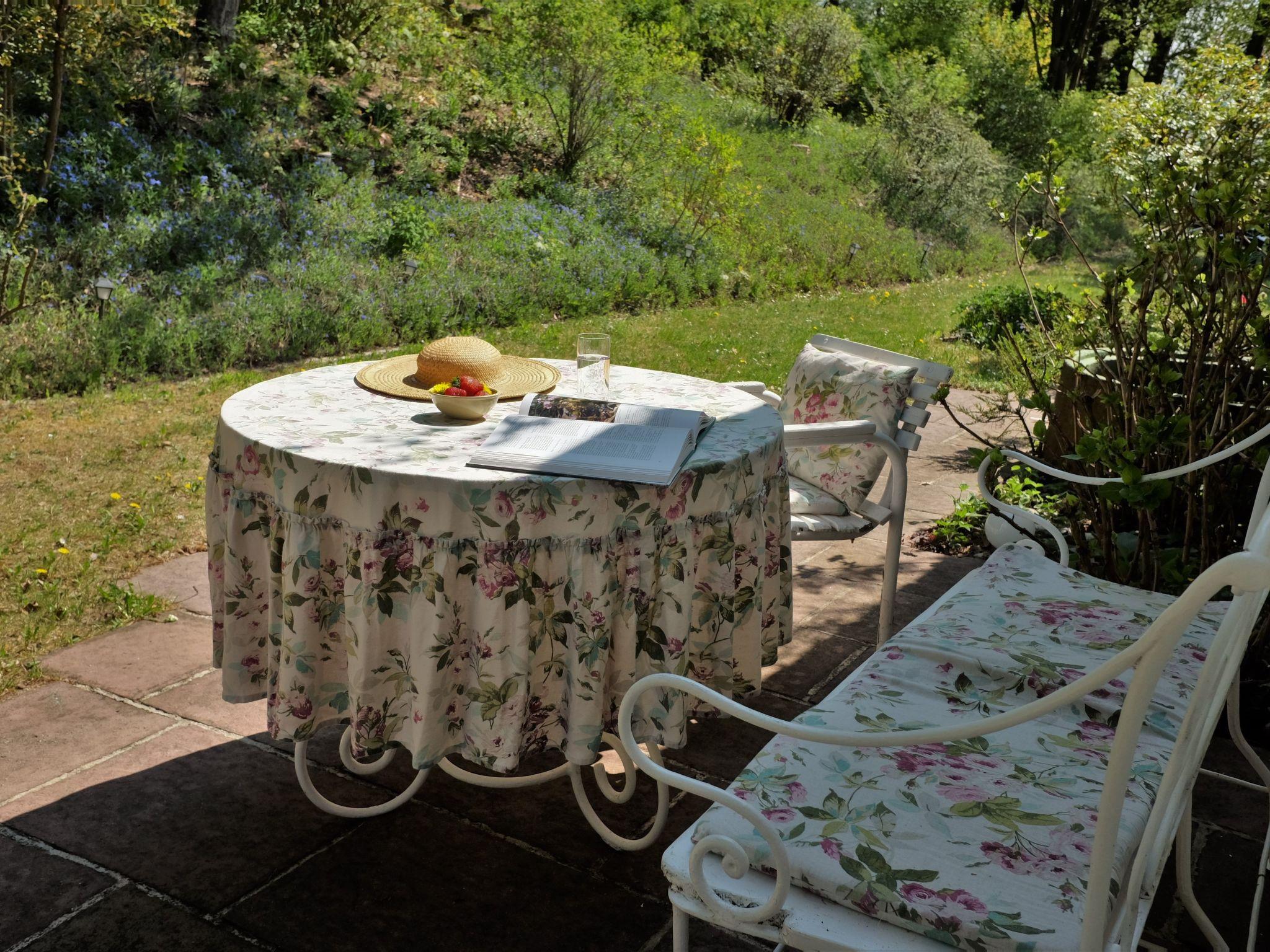 When you open the front door you step into a cosy hallway. A glass door leads into the living room, so already from here you can see the fabulous view through the big panoramic window as far as Bayreuth and Franconian Switzerland. The very homely living room has a cosy sitting corner, a rustic dining corner, a desk and a fireplace stove, a new LCD TV, a radio, two telephones, a CD player and Internet access. The latter are good for entertainment if it happens to be raining. The TV, CD player and seating are all brand new. A big sliding wooden door leads from the living room into the bedroom with a double bed 140cm wide. By opening this sliding door you can turn the two separate rooms into one big living and sleeping room. The romantic little bathroom with a toilet, washbasin and bath with a shower is very inviting. Next to the bedroom and bathroom there is a smaller room with a big cupboard wall and another bed (100 x 200cm). The pretty kitchen with blue-painted wooden cupboards is equipped with a dishwasher, gas stove, fridge (no freezer compartment), microwave and cookware, a Nespresso machine, coffee machine and toaster. There is not oven. The kitchen and the living room open onto the roofed terrace with very beautiful seating and electric lighting. There is a heater for cooler evenings.