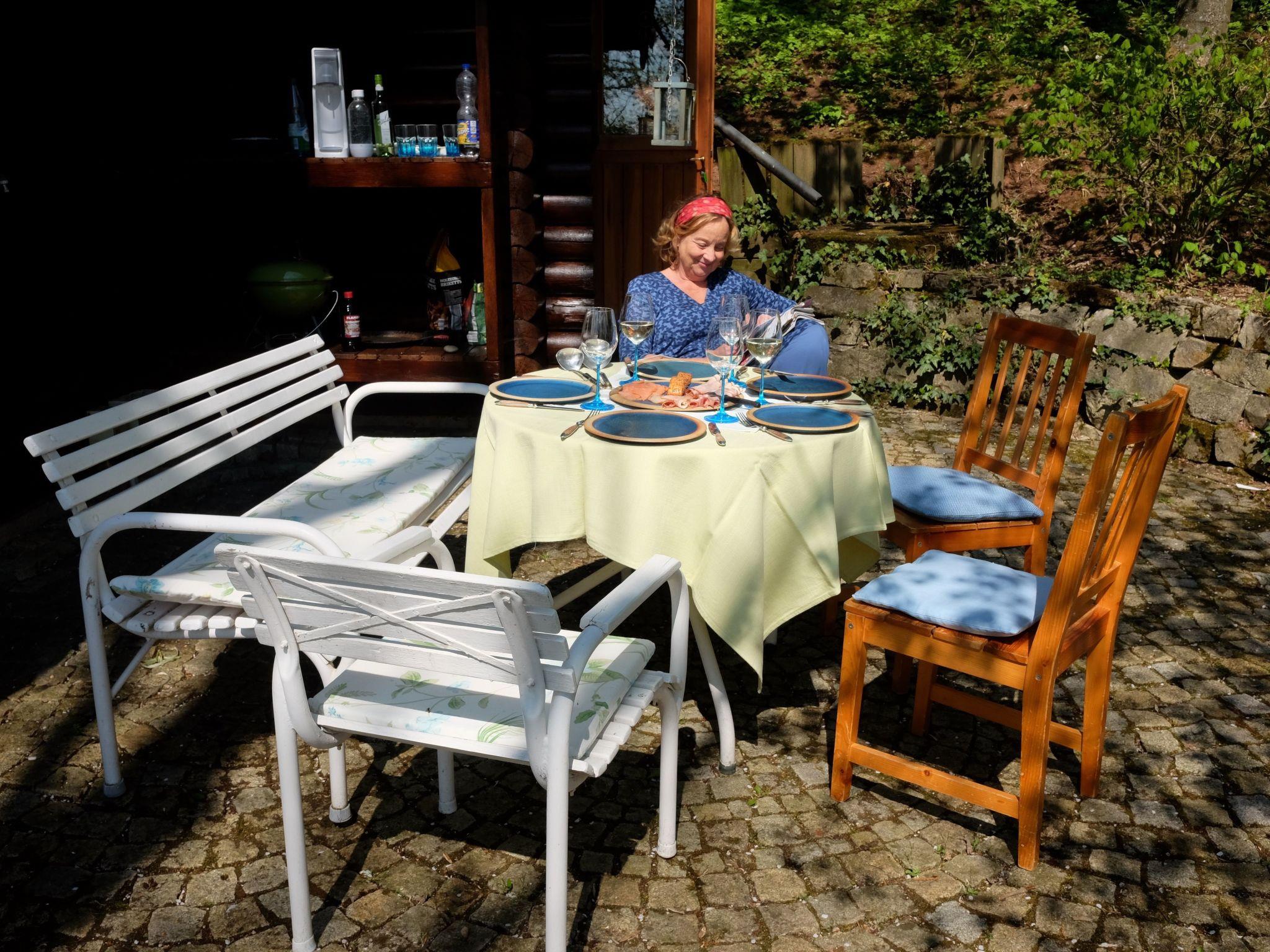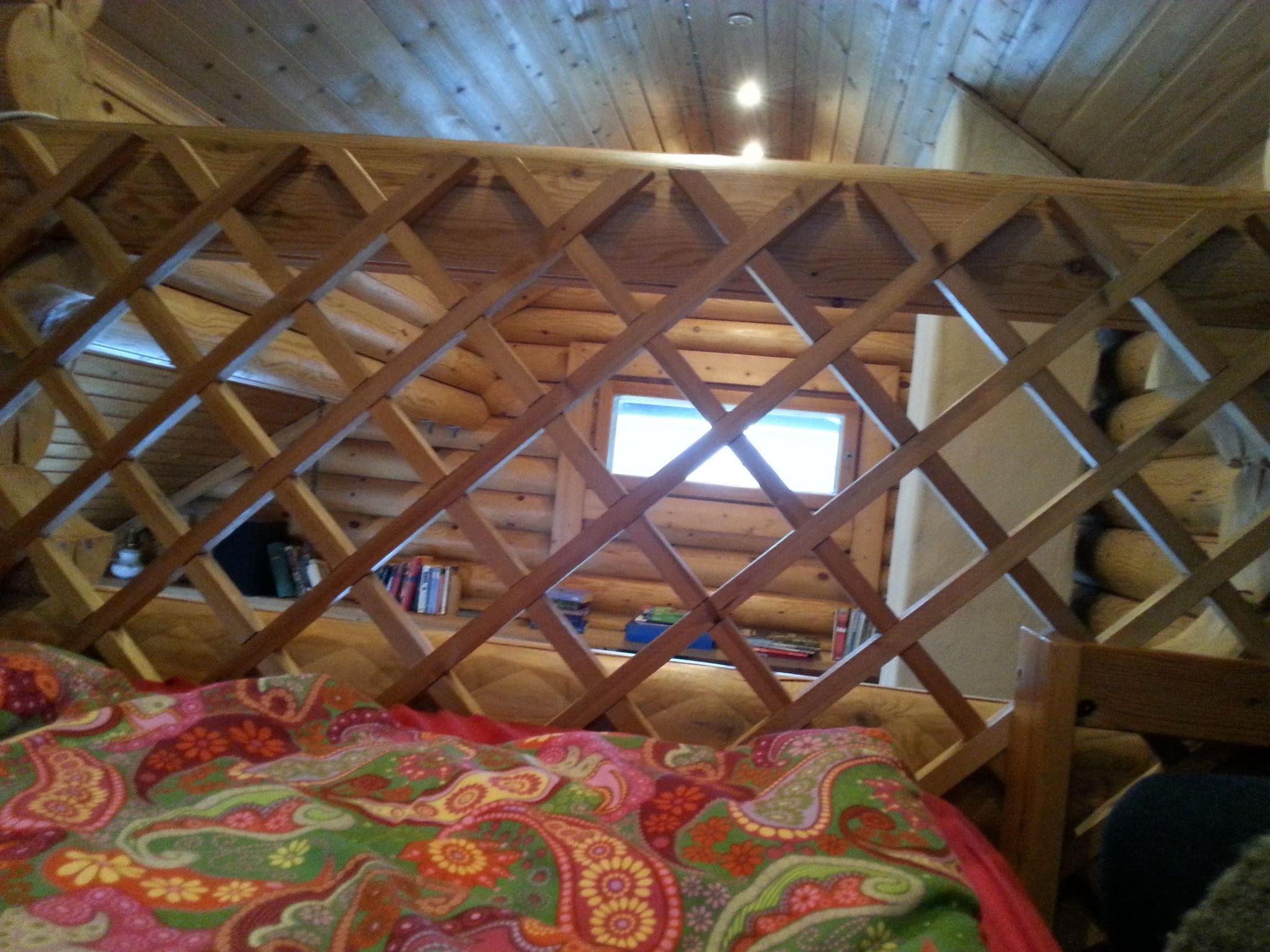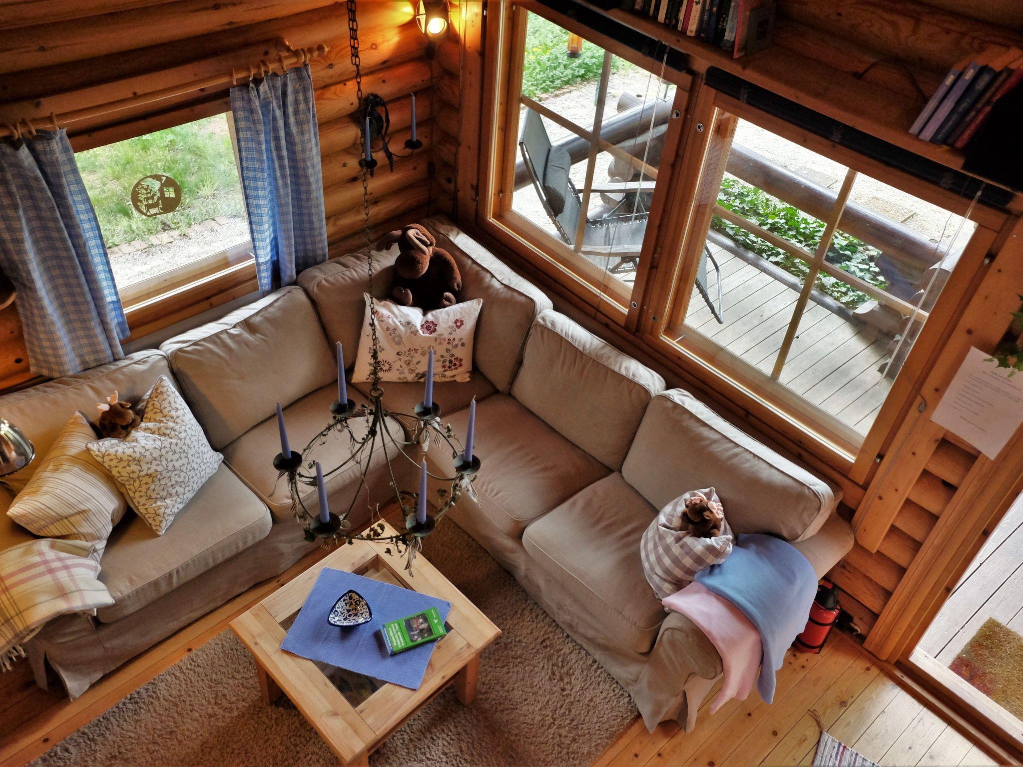 The cottage has a very cosy living room with sofa (new), sitting area and wood-burning stove, new LHD TV, radio, telephone, CD player, DVD player and Internet connection are available, but can be switched off or removed if required. The parvi can be reached via a rung ladder. There is a sleeping area with a new mattress for two people under the roof of the cottage. The living room leads to a small bedroom with bunk beds for two people and a desk: all made of wood. A passageway connects the living room with the kitchen at the other end. The kitchen is fully equipped except for a dishwasher and oven. It offers space and tools for successful and idyllic cooking and barbecue evenings. The bathroom with shower, WC and washbasin can also be accessed from here. The shower - like the cottage itself - is Finnish-style: there is no shower tray as is standard here: the water falls directly onto the bathroom floor, which initially seems unusual to us. However, we can report from our own experience that you get used to it very quickly. The bathroom itself then provides the door to the cosy seating area behind the hut. The view of the ancient jungle can quickly put the hectic pace of everyday life into perspective.