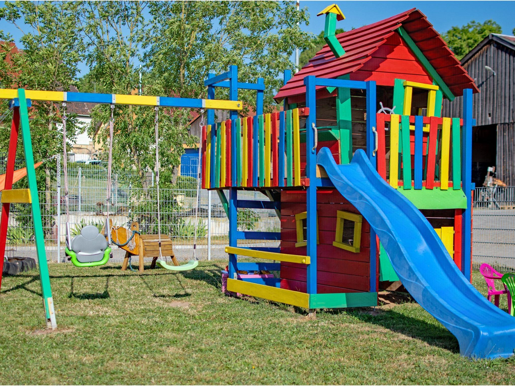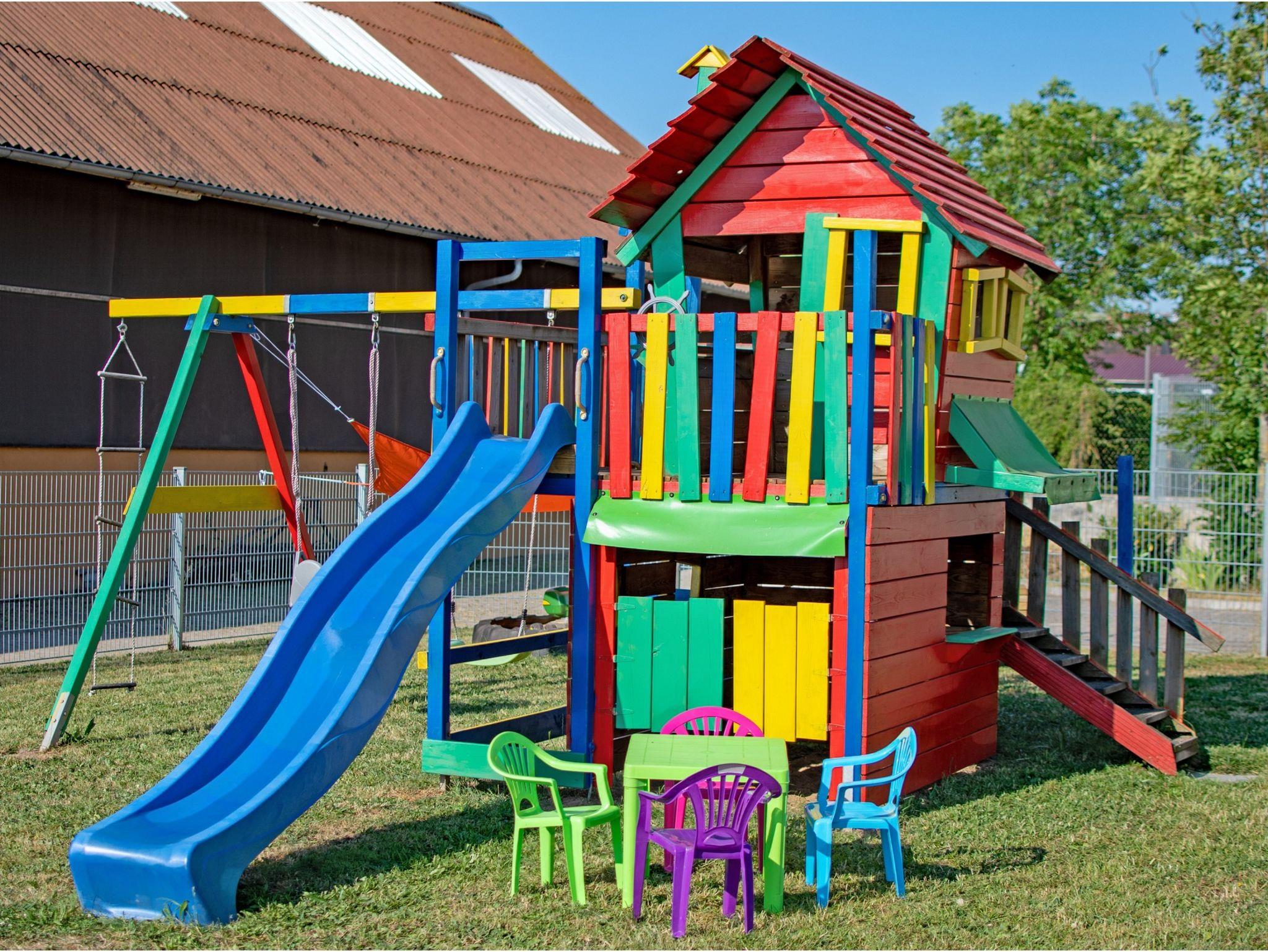 Für die Kinder bieten wir auf unserem Hof einen umzäunten Spielplatz mit Schaukel und Rutsche an. Ein Pony und zwei Esel freuen sich auf Spaziergänge.