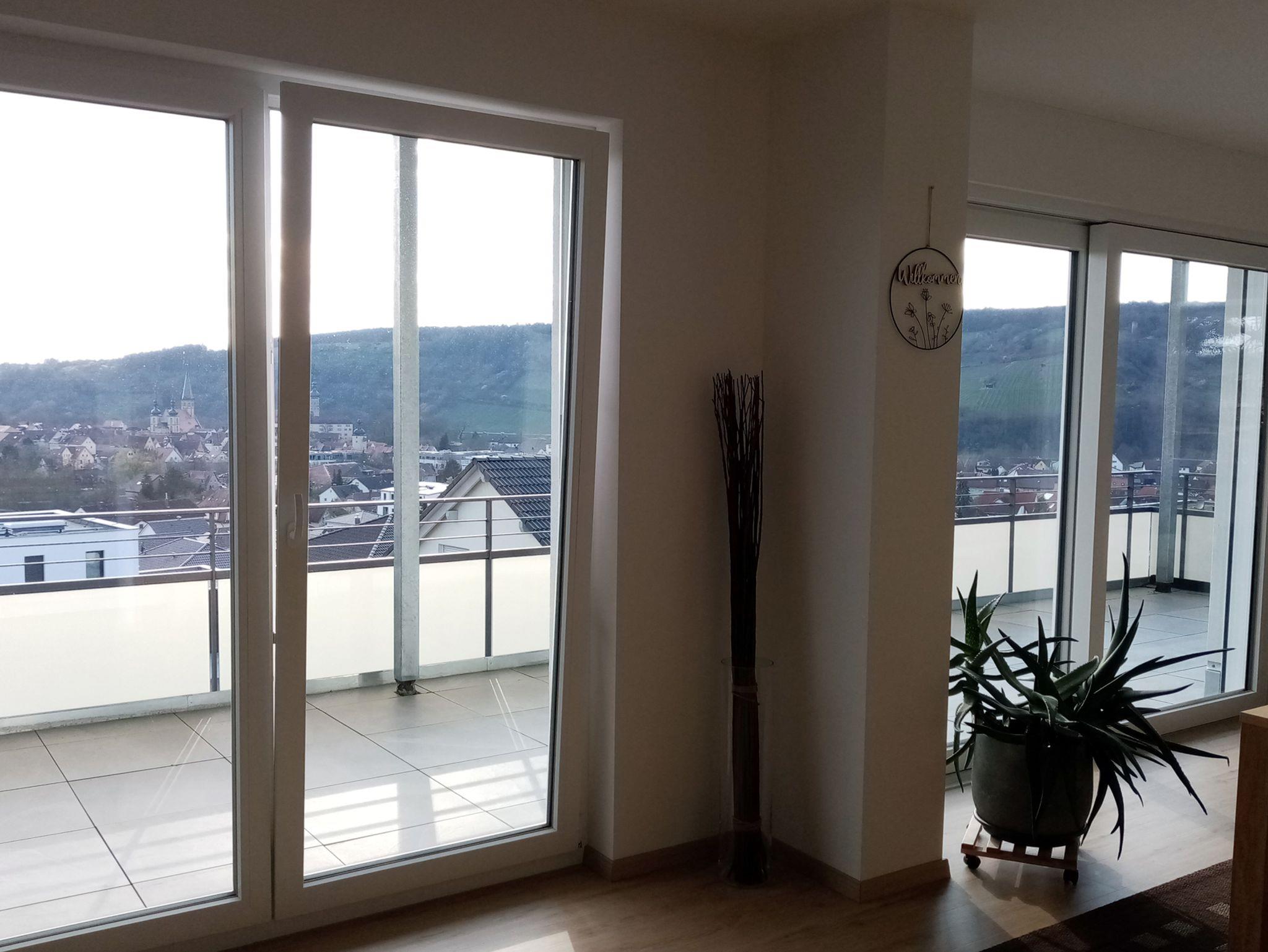 Der offene Wohnbereich mit einer modernen Küche und einer 25 qm großen Terrasse lädt zum Verweilen, Genießen und Beisammensein ein. Die großflächigen Panoramafenster ermöglichen zu jeder Jahreszeit einen traumhaften Blick über das wundervoll gelegene Tal der Tauber.