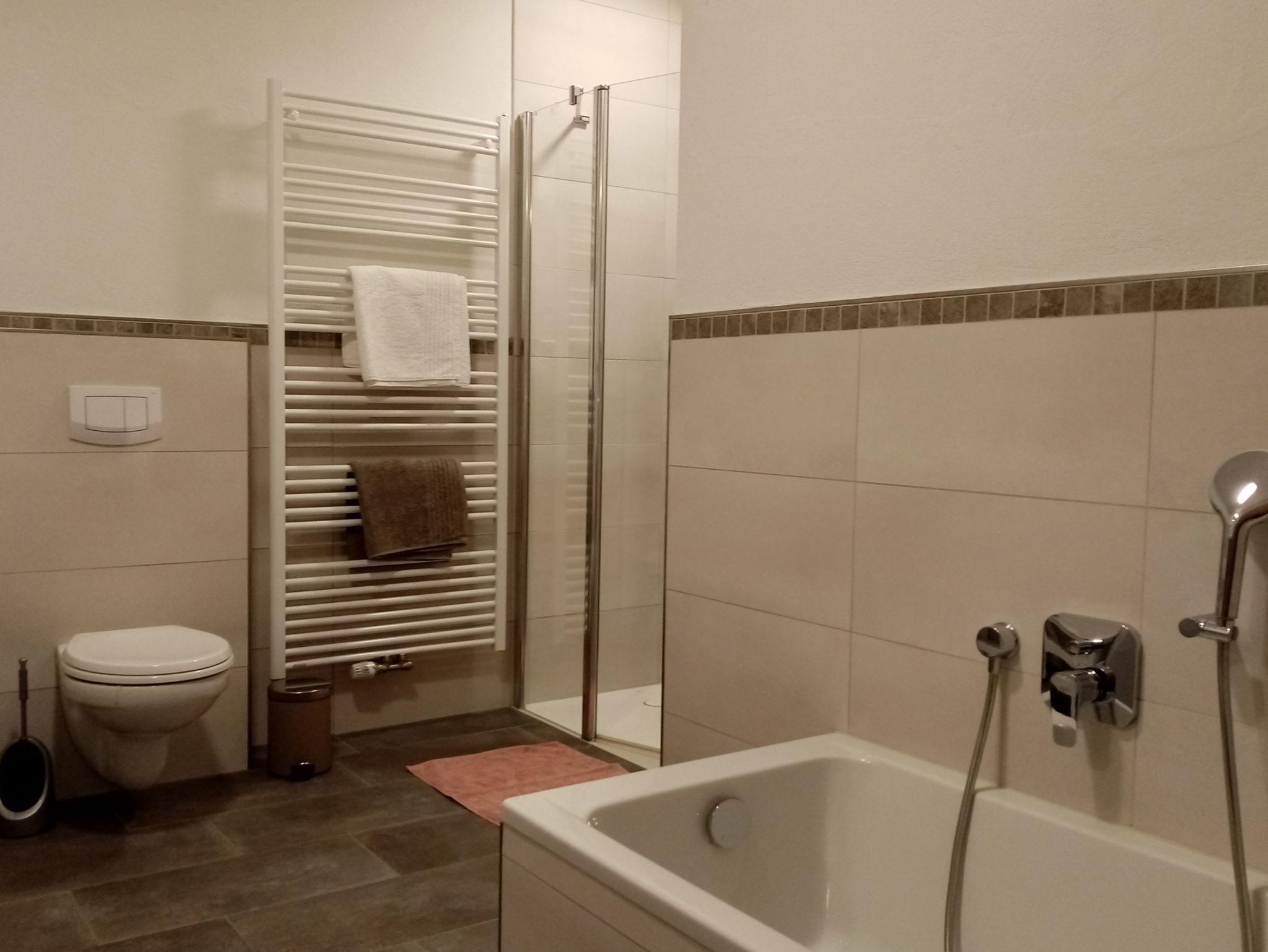 Das Badezimmer ist mit einer bodentiefen Dusche, WC, Fön, Handtuchheizkörper und separater Badewanne ausgestattet.