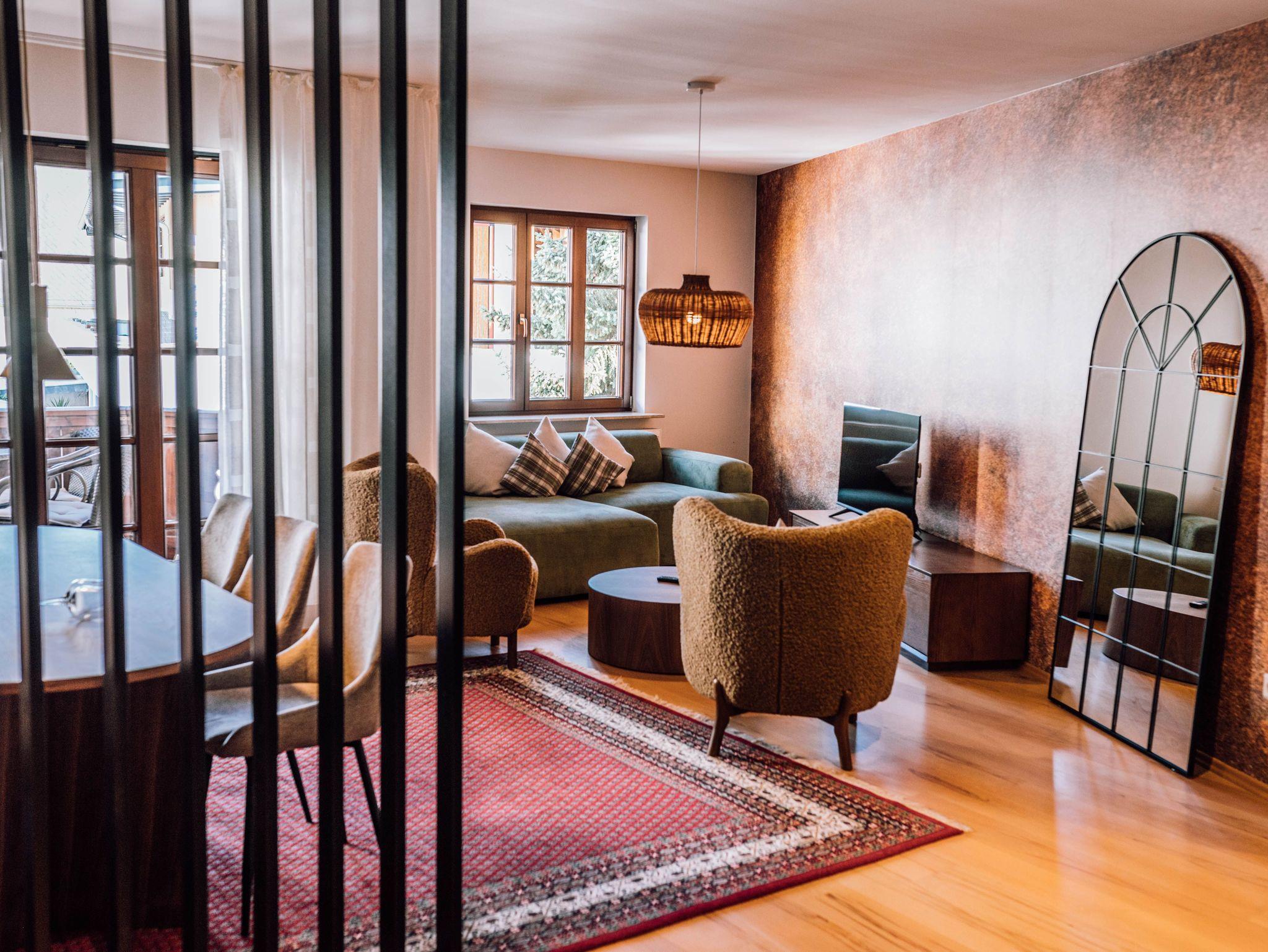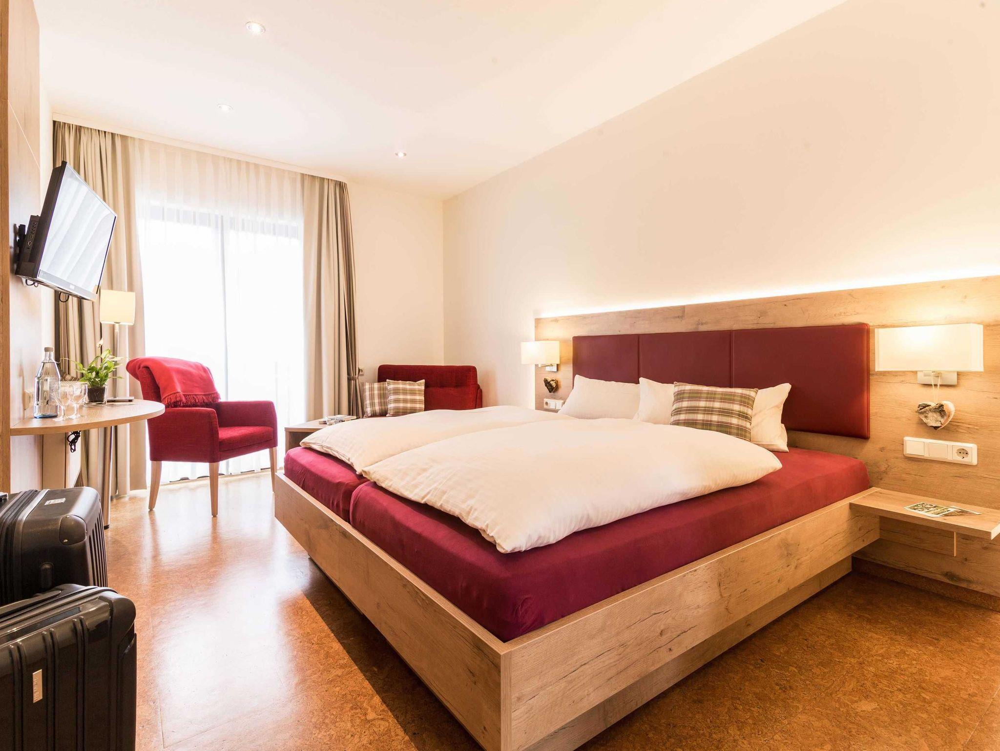 Ein Familienzimmer zum „Dahinschmelzen“. Warme Rottöne, edle Materialien und viel Platz zum Wohnen.