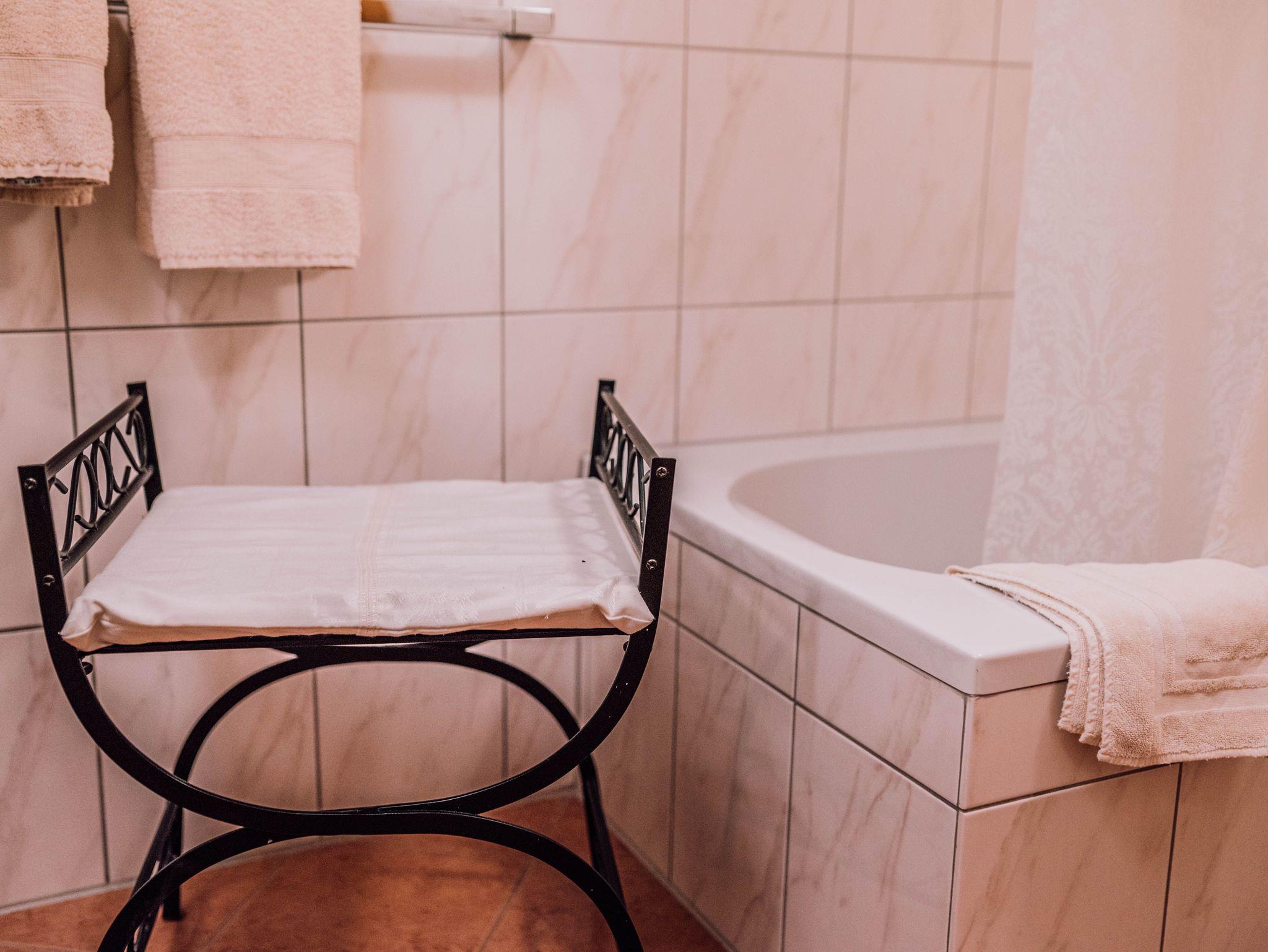 Unsere Suite verfügt über: 70qm, ein Schlafzimmer, ein französisches Bett im Wohnbereich (seperat ), 1 Etagenbett im Durchgangsbereich zum Bad, Balkon, Kaffeemaschine, Kühlschrank (nicht bestückt), Esstisch, W-LAN, Flatscreen TV, Badewanne, Föhn, Duschlotionen, Flasche Wasser