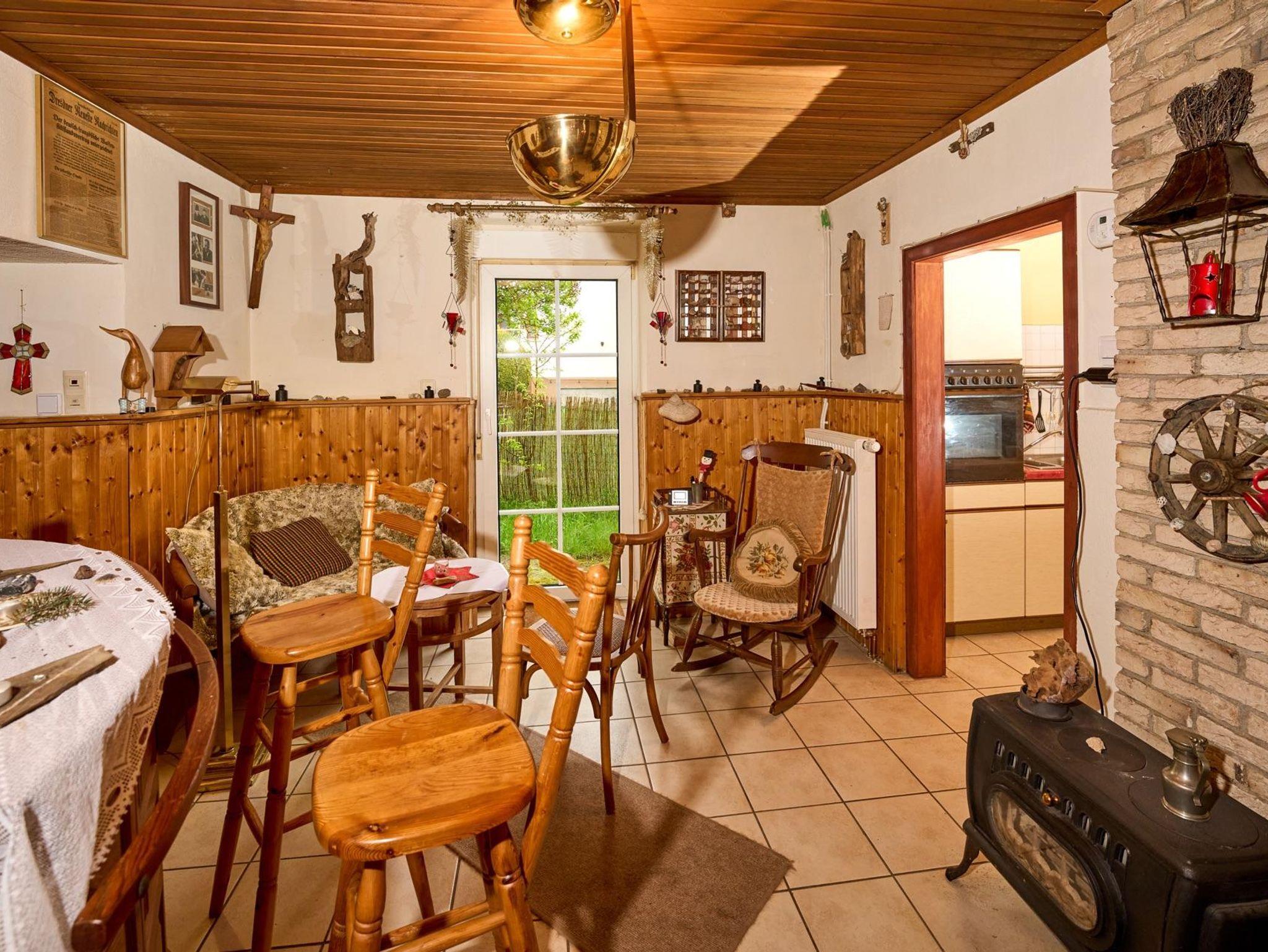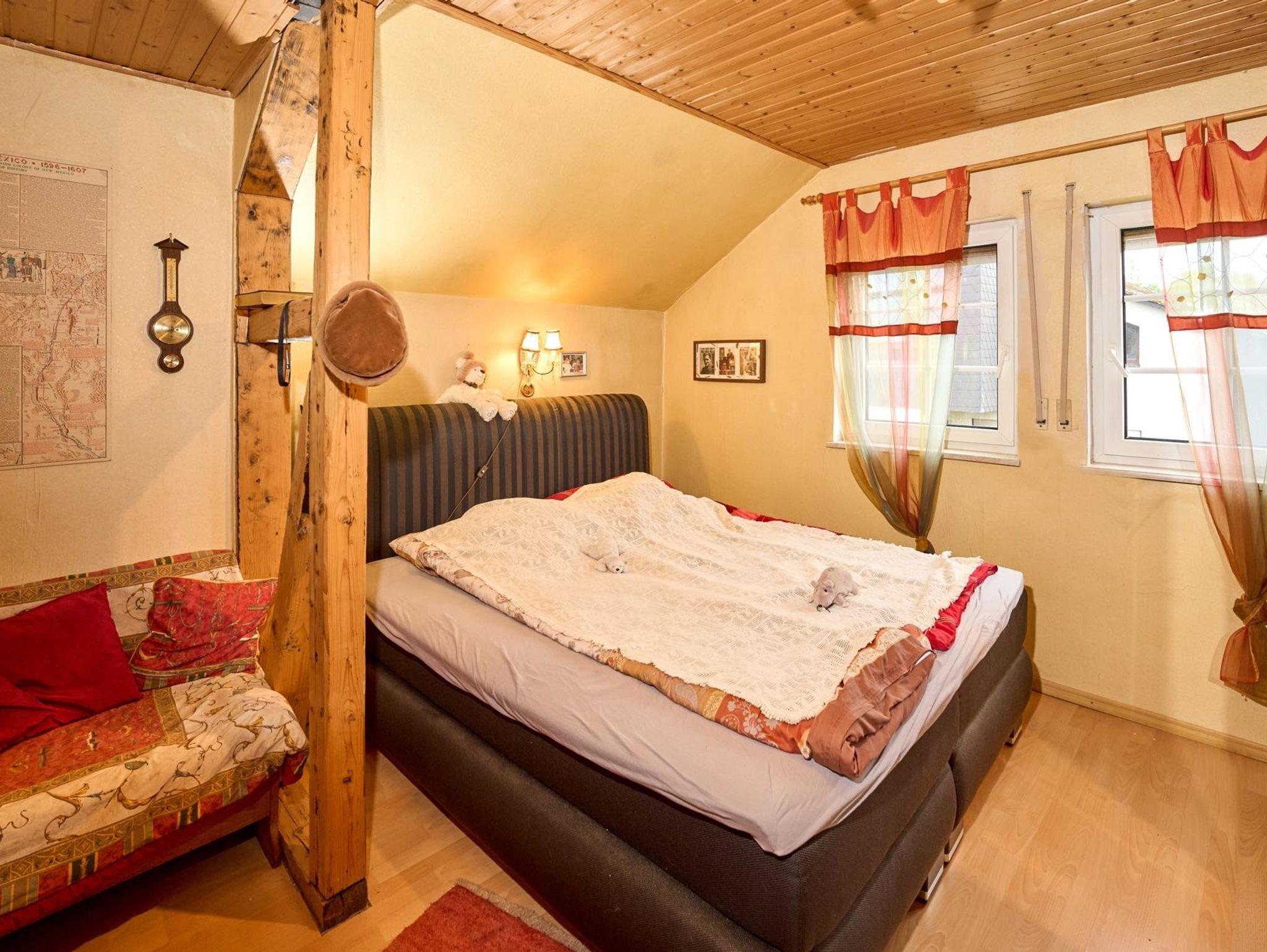 Das malerische Teilfachwerkhaus aus dem frühen 20. Jahrhundert mit moderner Ausstattung und einer Wohnfläche von insgesamt 92 qm bietet nicht nur durch seine Holzvertäfelungen eine ausgesprochen gemütliche Atmosphäre. Eine Bar sowie direkt daneben eine Sitzecke, umgeben von einer ansprechenden Dekoration, schaffen eine Verweilstimmung. Im Untergeschoss befinden sich neben dem Wohnzimmer auch die Küche und das Bad mit Toilette und Badewanne. Im Obergeschoss finden Sie drei Schlafzimmer mit Schlafgelegenheiten für insgesamt 6 Personen. Eine Gastwirtschaft - direkt gegenüber - bietet kulinarische Genüsse für jeden Gaumen mit nationaler sowie auch internationaler Küche (auf Bestellung). Eine weitläufige Terrasse im Obergeschoss (mit Sonne rund um die Uhr) sowie ein Garten hinter dem Haus lädt Sie ein, im Freien zu verweilen und die reine Luft der Eifel zu genießen. Gartenmöbel stehen zur Verfügung. Ein Parkplatz befindet sich hinter dem Haus.