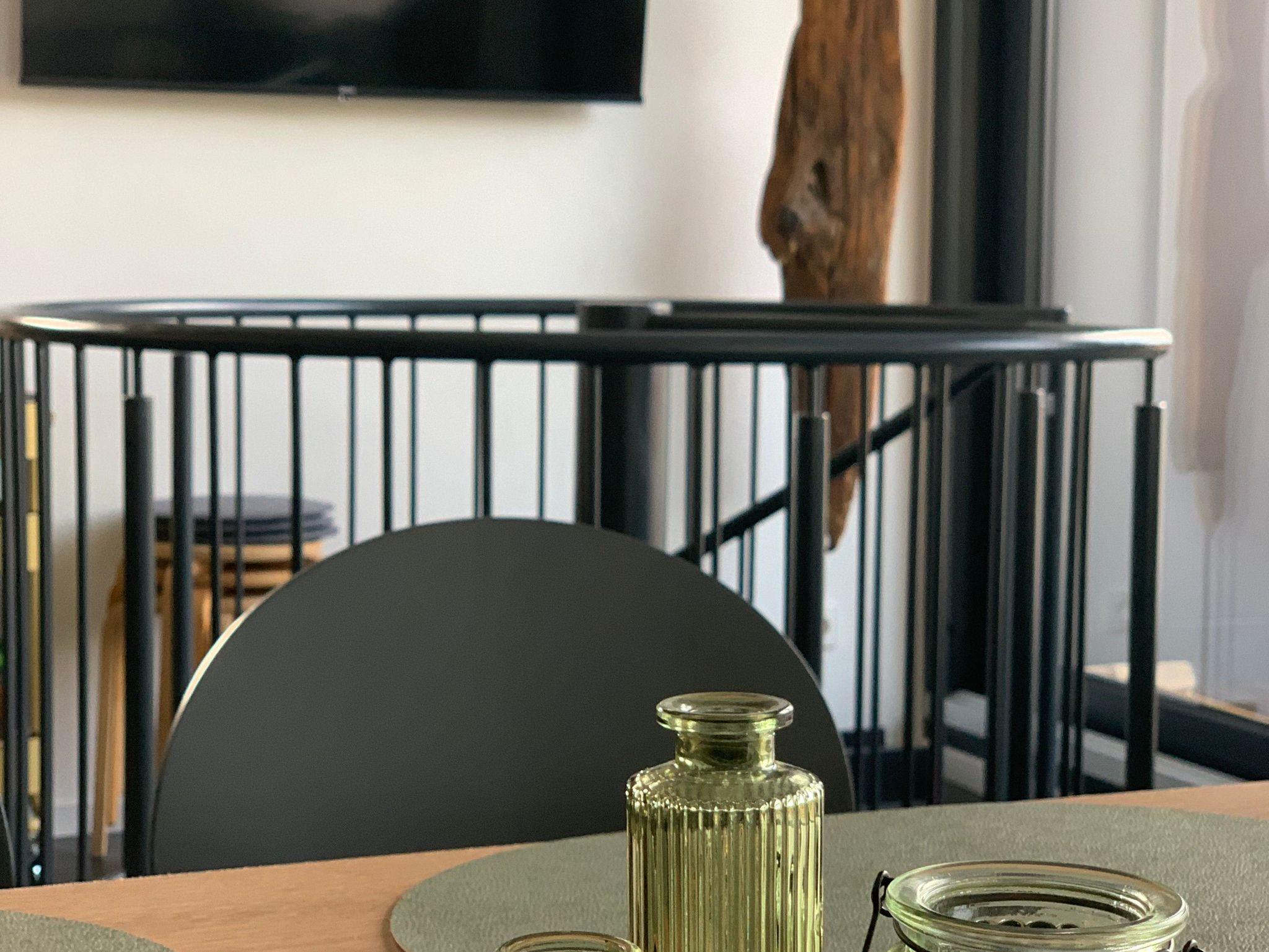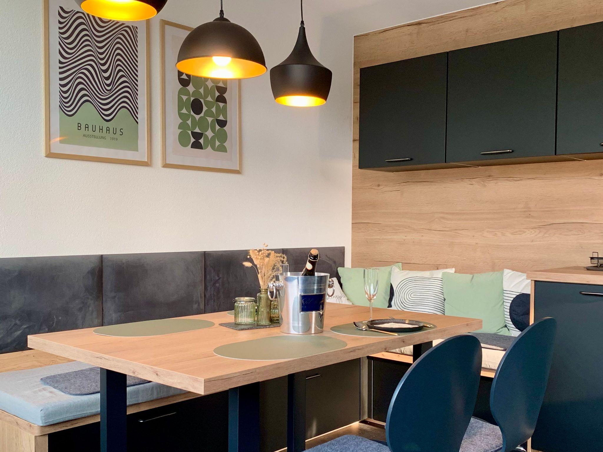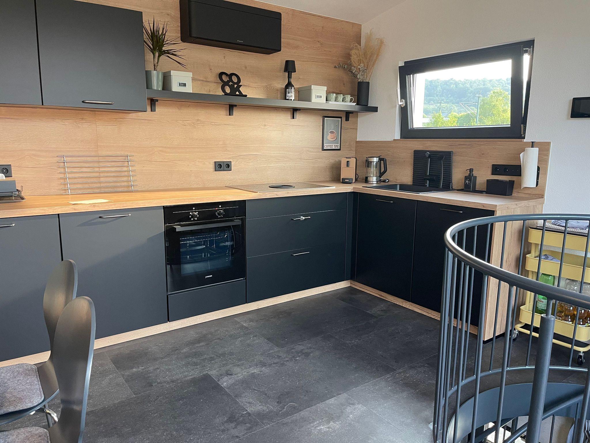 Im 3. Obergeschoss liegt das Herzstück des Turms: eine voll ausgestattete Designerküche mit Bora-Kochfeld, Backofen, Mikrowelle, Spülmaschine, Kühlschrank, Kapsel- & Filterkaffeemaschine, Toaster, Wasserkocher, Eierkocher und Heißluftfritteuse. Der Essplatz mit LAN-Anschluss und das Liegefenster mit Aussicht machen diesen Raum zum Wohlfühlort. Ein großer Smart-TV ergänzt den Wohnkomfort.