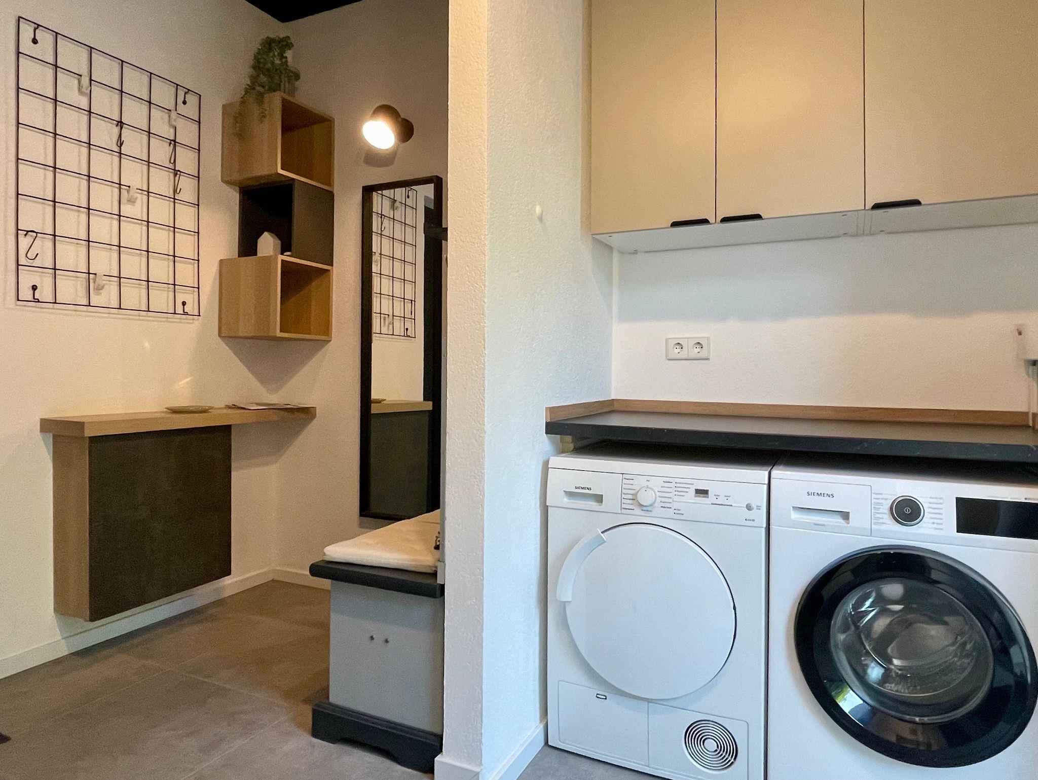 Im Erdgeschoss lädt ein funktionaler Eingangsbereich mit Garderobe und Infomaterial zur Region zum Ankommen ein. Ein separater Hauswirtschaftsraum mit Waschmaschine, Trockner, Bügelutensilien und Stauraum bietet idealen Komfort besonders für längere Aufenthalte. Die kleine Südterrasse dient gleichzeitig als Fahrradabstellplatz.