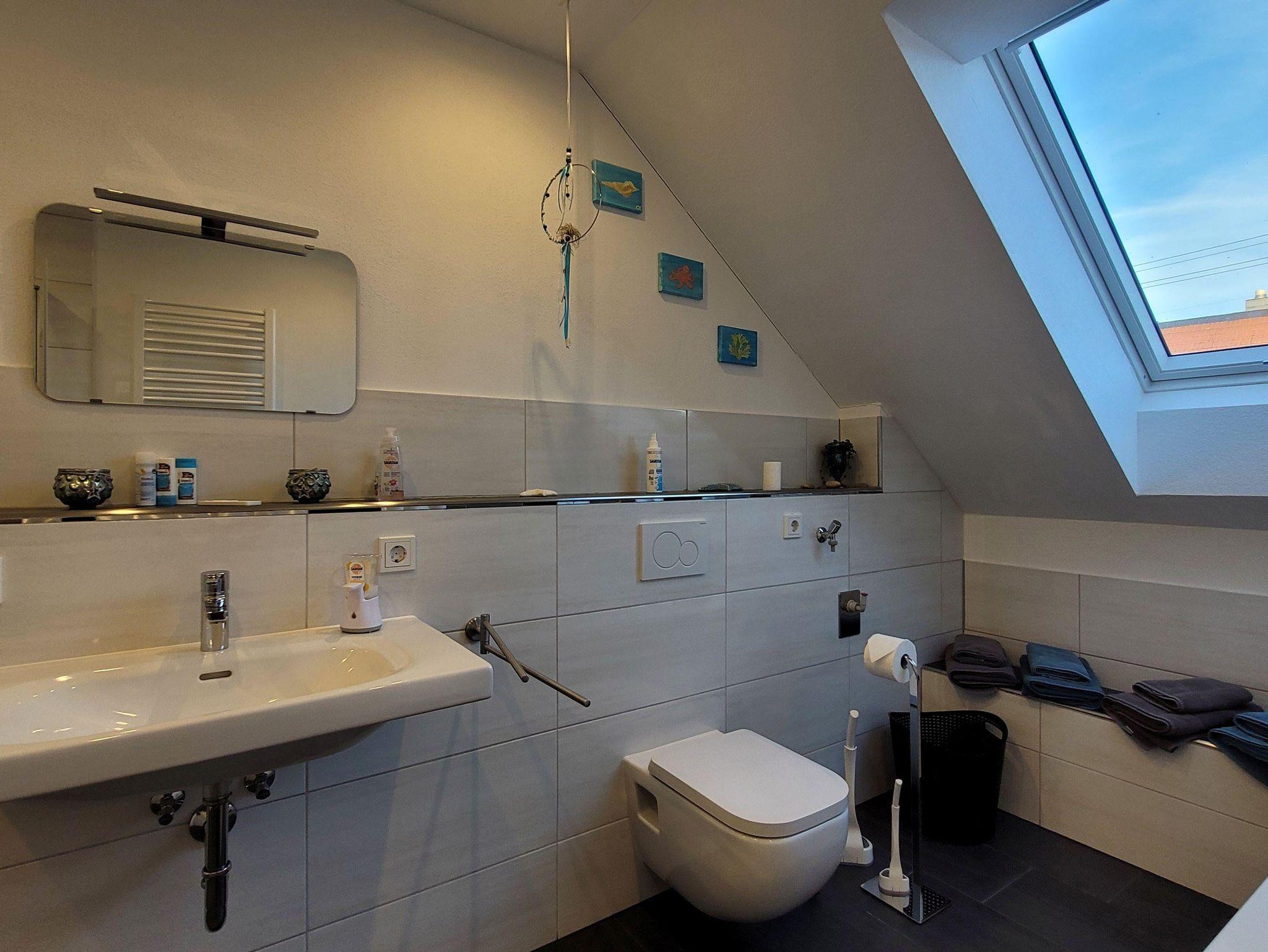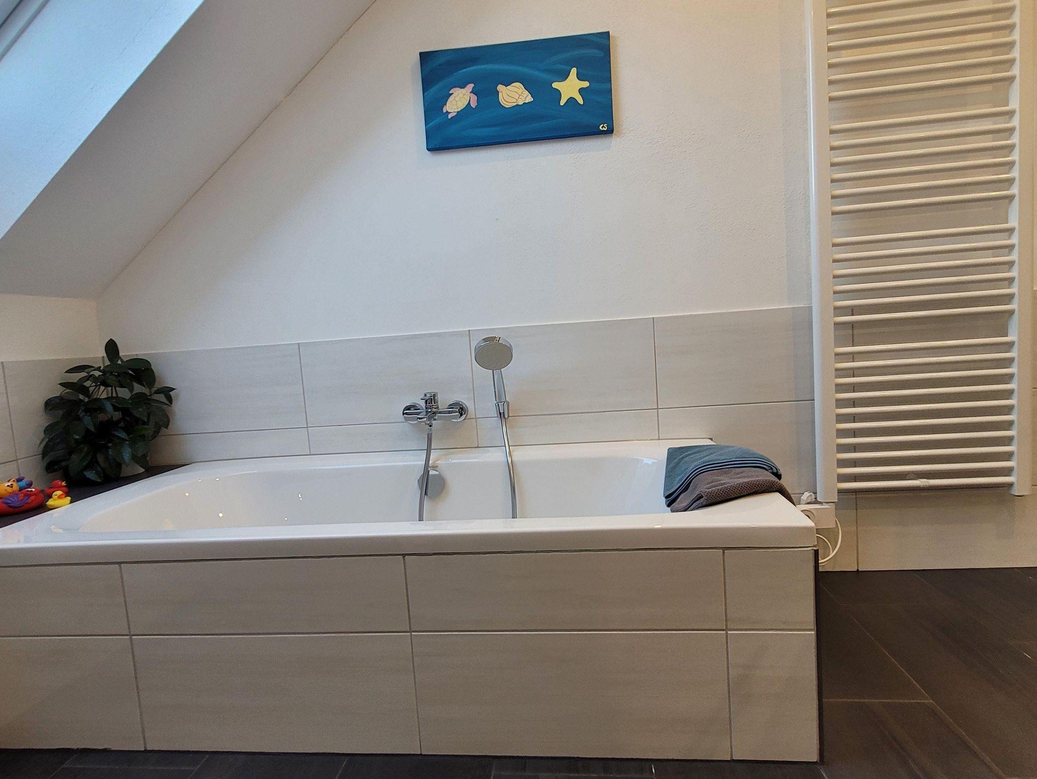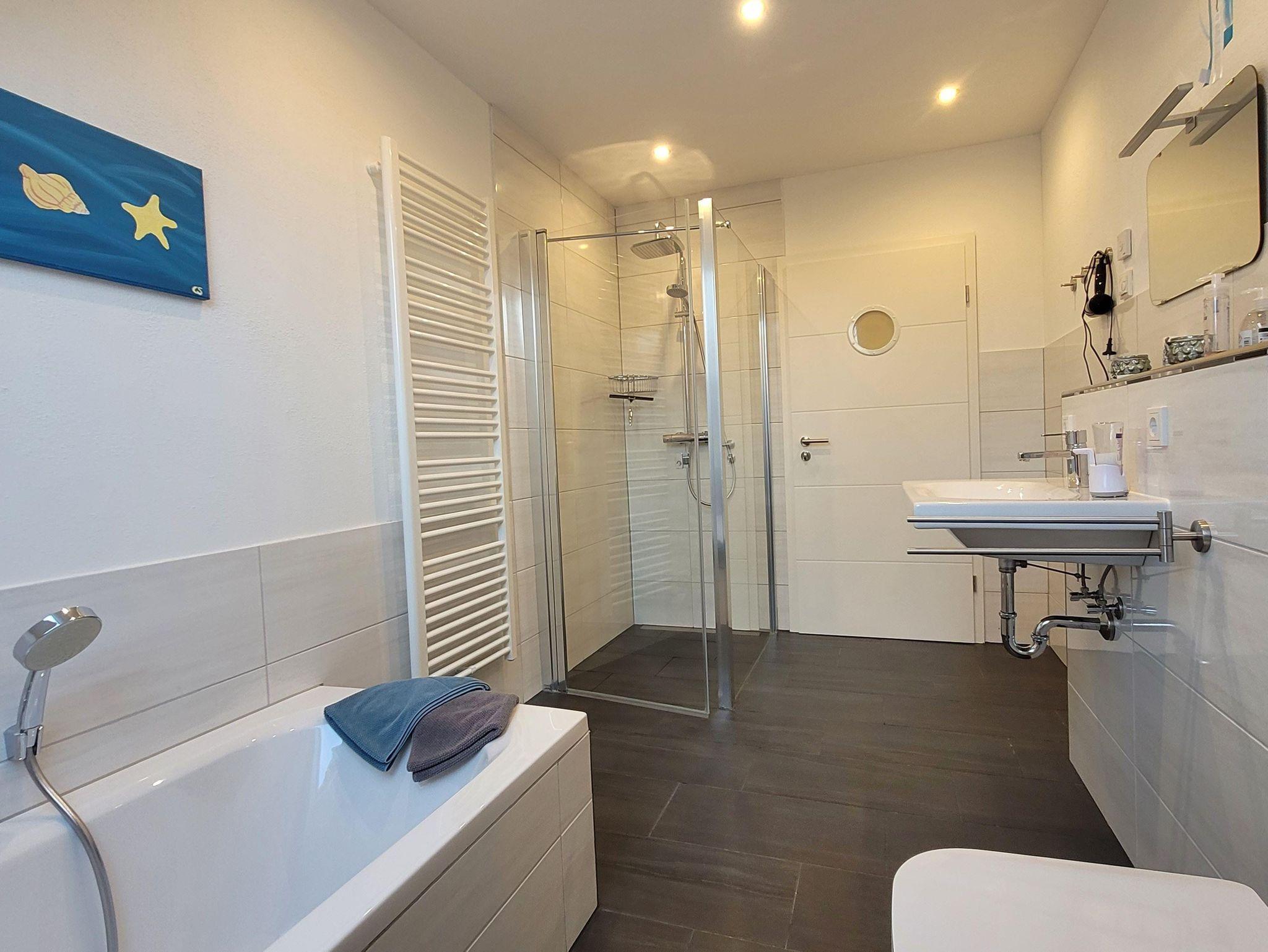 Wegen der große, ebenerdige Dusche und der zusätzlichen Badewanne ist das Badezimmer super für Familien geeignet. Es ist hell und geräumig und bietet Hand- und Duschtücher, sowie Körperreinigungsmittel und natürlich Wasserspielzeuge für die Kinder.