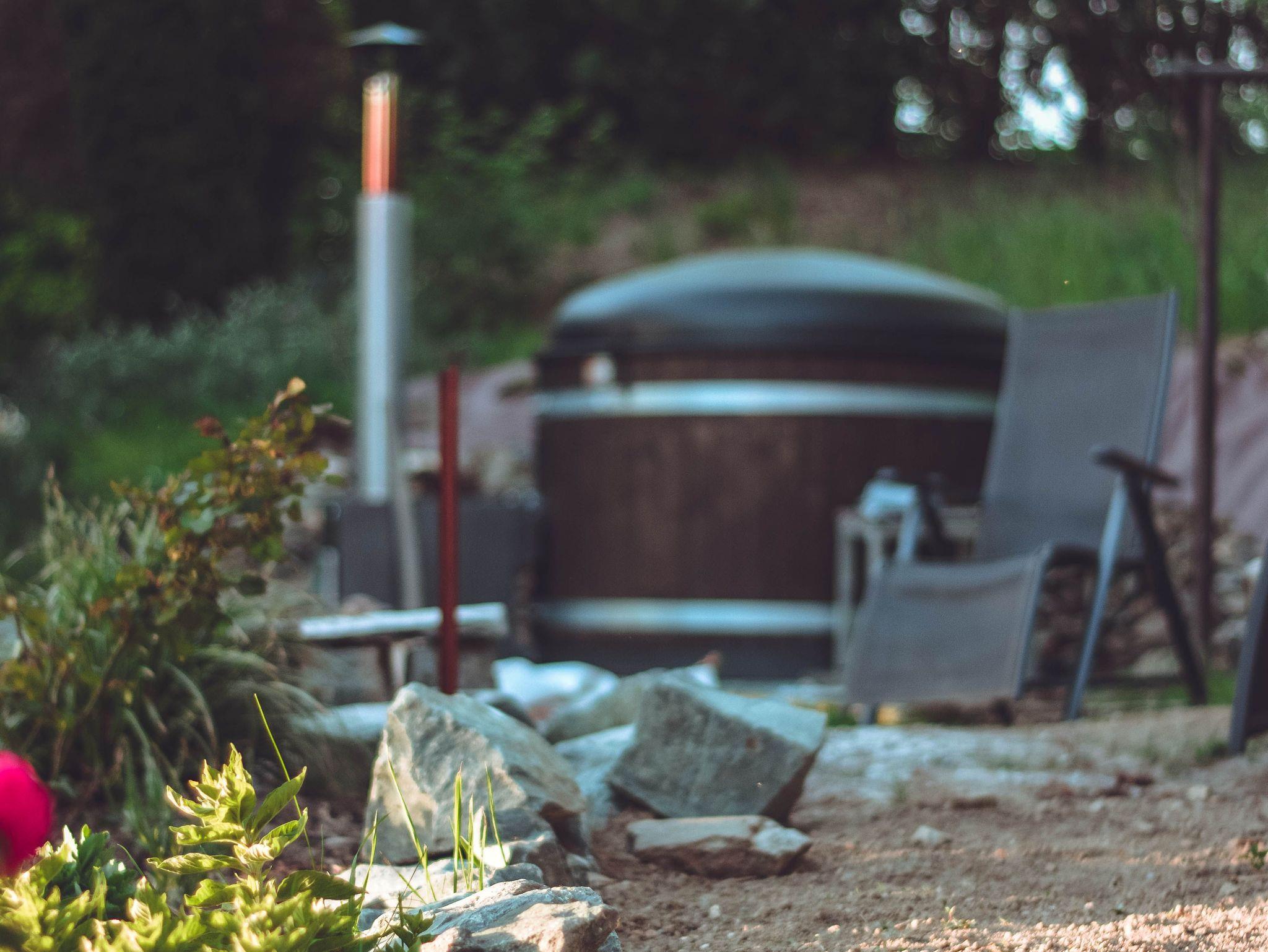 Highlights wie Badezuber, Fasssauna und Solardusche zum Erholen ein. Das Grundstück ist vollständig