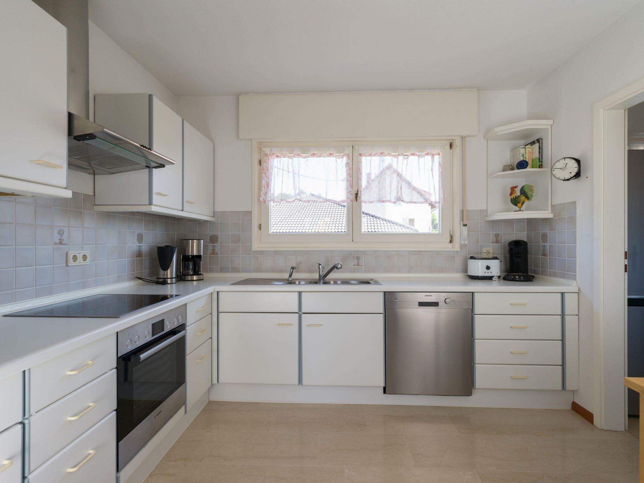 Die Einbauküche ist ausgestattet mit Elektroherd, Backofen, Spülmaschine, Kühlschrank mit Gefrierschrank, Senseo-Kaffeemaschine, Filterkaffeemaschine, Toaster, Wasserkocher und sonstigem Kochgeschirr.
