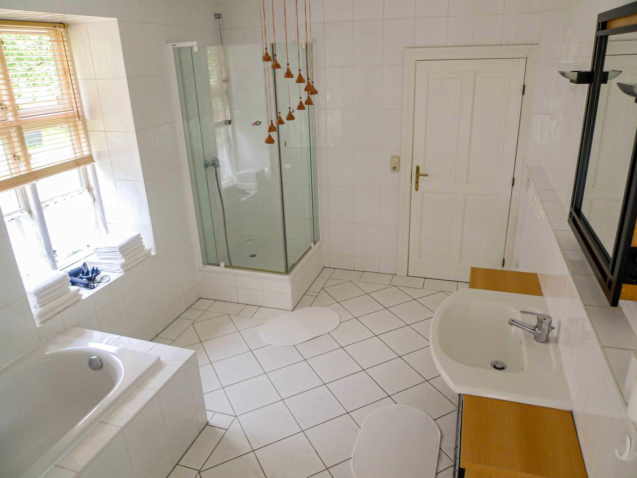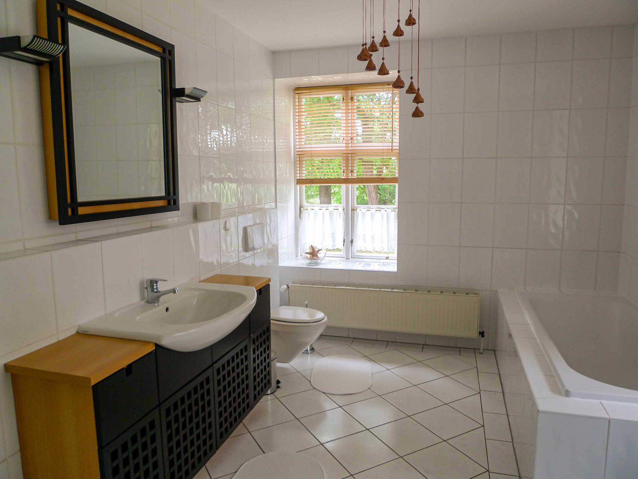 Die Küche ist sehr groß und kann als Wohnküche bezeichnet werden. Die komplett ausgestattete Küchenzeile verfügt neben Herd, Kühlschrank und Spülmaschine auch über eine Waschmaschine. Das Badezimmer ist sehr geräumig und mit Badewanne und Dusche ausgestattet.