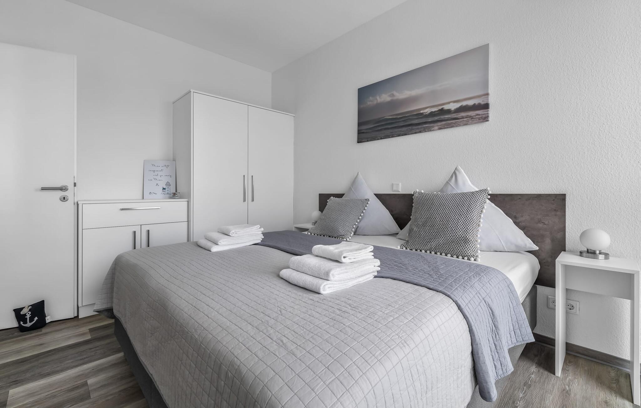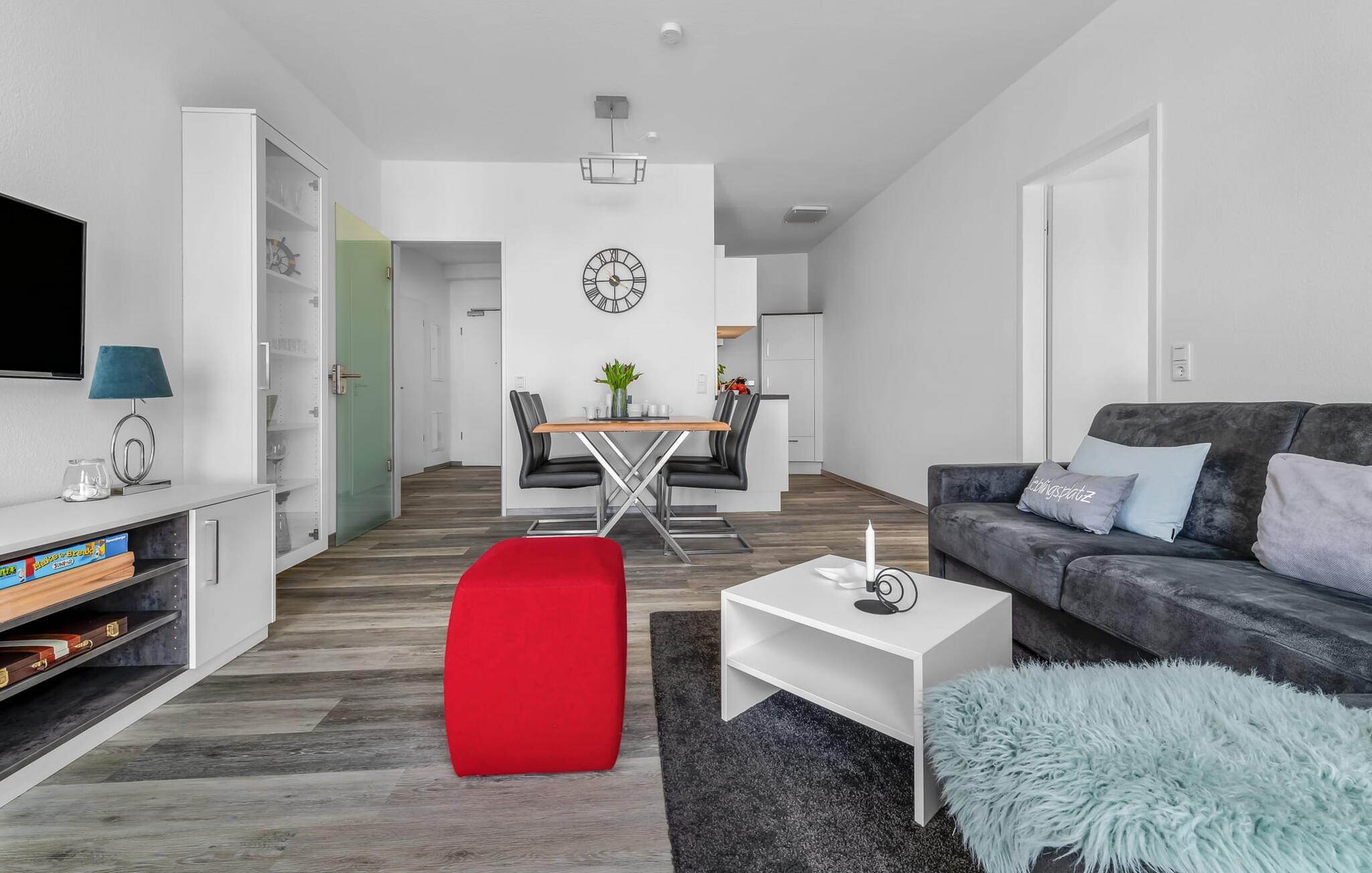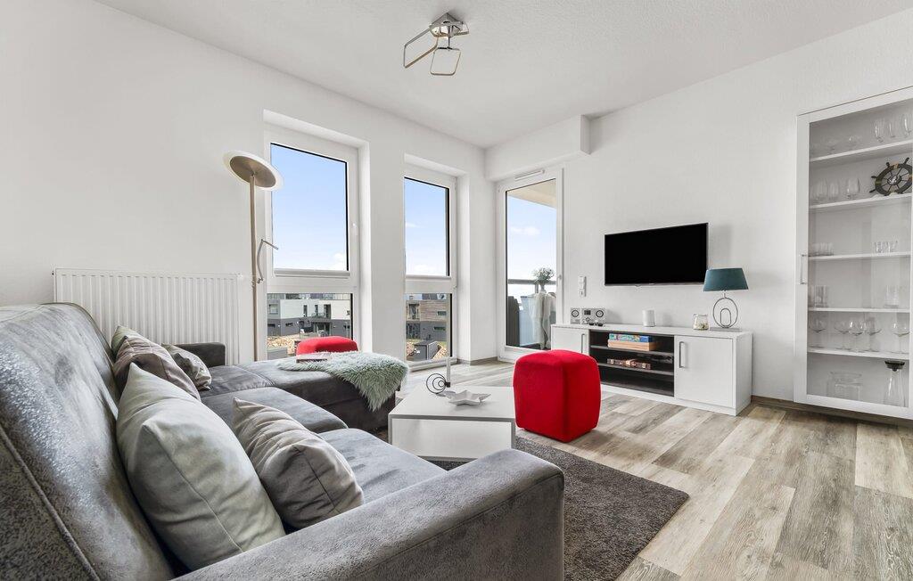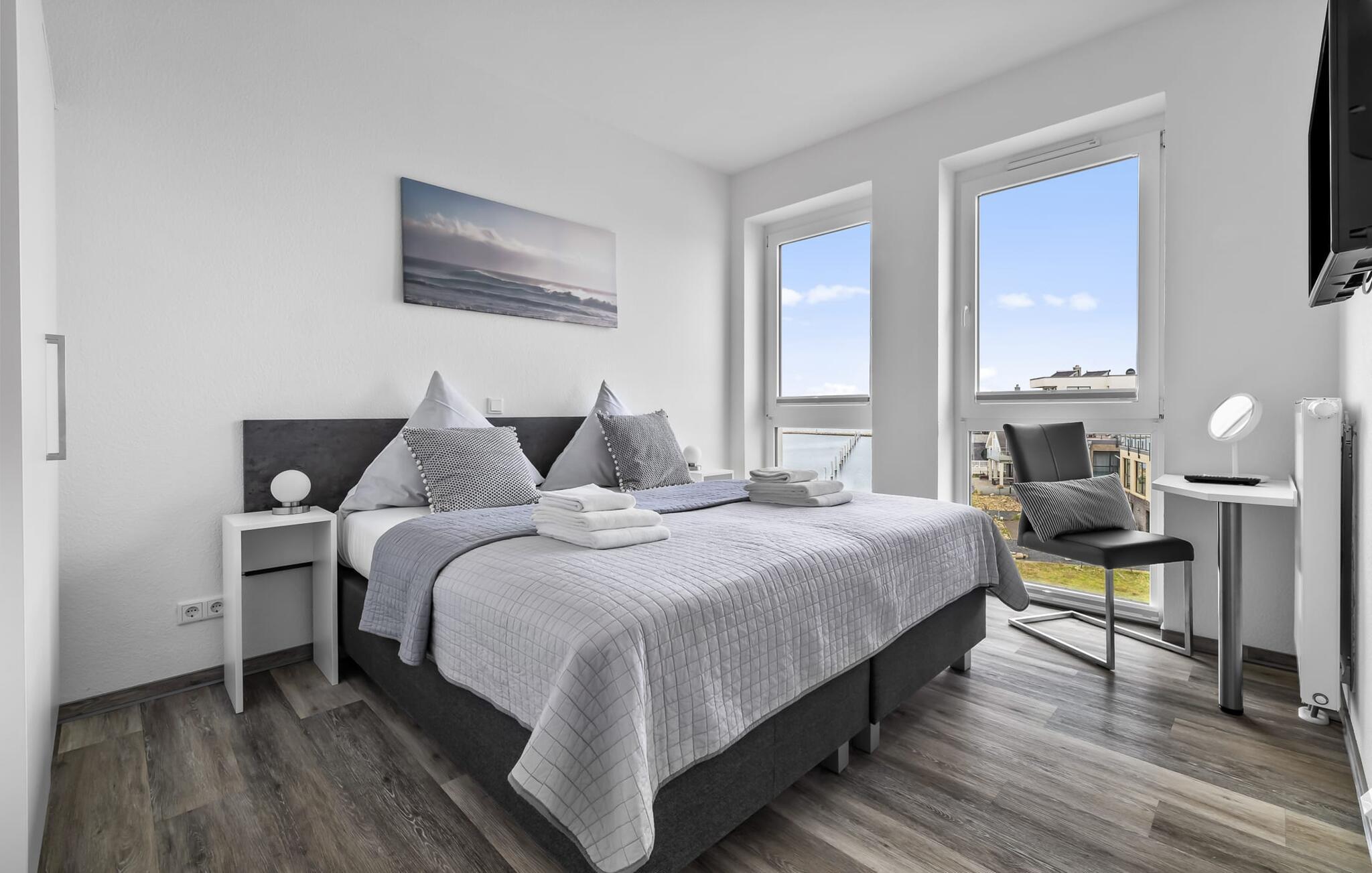 Nyd eksklusiviteten og den betagende panoramaudsigt over ferielejligheden Wellenblick. Den uhindrede udsigt over havnen, Østersøen og mundingen af floden gør dette til et særligt tilflugtssted. Denne charmerende lejlighed er kendetegnet ved en indbydende stue/spisestue, der inviterer jer til at blive hængende og nyde. Det fuldt udstyrede køkken giver jer mulighed for at udvikle jeres kulinariske præferencer og nyde afslappede måltider. Lejligheden har to smagfuldt indrettede soveværelser, det ene med en komfortabel dobbeltseng og det andet med to enkelt boxmadrasser. For ekstra soveplads kan udtrækssofaen i stuen omdannes til to ekstra sovepladser (160x200cm). Der er et moderne smart-tv i hvert soveværelse og i stuen for at give jer underholdning. Ud over møbler af høj kvalitet byder ferielejligheden på gratis WiFi til at forbinde jer med verden. Der er to bruserum til rådighed, så alle gæster kan nyde en afslappende ferie. Den smagfulde indretning af lejligheden formidler en moderne, venlig, varm og indbydende atmosfære. Altanen fører direkte til vandet og giver jer en idyllisk mulighed for at nyde den friske havluft og beundre udsigten. Den praktiske side af boligen omfatter en underjordisk parkeringsplads med en maksimal højde på 2,05 meter, som giver jer bekvem parkering. Et cykelrum i kælderen står til rådighed for alle husets beboere til at udforske det omkringliggende område på to hjul. En elevator gør det også nemmere for jer at komme ind i lejligheden. Oplev en uforglemmelig ferie i den moderne, venlige og komfortable ferielejlighed Wellenblick. jeres perfekte tilflugtssted med en førsteklasses udsigt og alle faciliteterne til et afslappende ophold ved Østersøen. Vores favoritsted: Vandudsigten fra næsten alle sider er virkelig uforlignelig I kælderen er der en vaskemaskine og en tørretumbler til fælles brug. Betaling sker via en møntautomat. I sidebygningen af komplekset venter der gæsterne et eksklusivt pool- og wellnessområde, som naturligvis kan benyttes gratis. Dyk ned i det behageligt tempererede vand, og lad blikket glide ud over Østersøens vidder – en oplevelse for alle sanser. Velgørende saunature indbyder til ophold og giver jer dyb afslapning. Giv jer selv disse små pauser og læg hverdagens stress bag jer – til en ferie fuld af ro, nydelse og ny energi. Bemærk venligst: OstseeResort Olpenitz er meget populært, og der bygges fortsat i parken. Ikke desto mindre kan I se frem til en 5-stjernet standard og et førsteklasses ophold. Byggeaktiviteterne kommer ikke til at forstyrre jer på ferien, og derfor gives der ikke yderligere afslag i prisen.