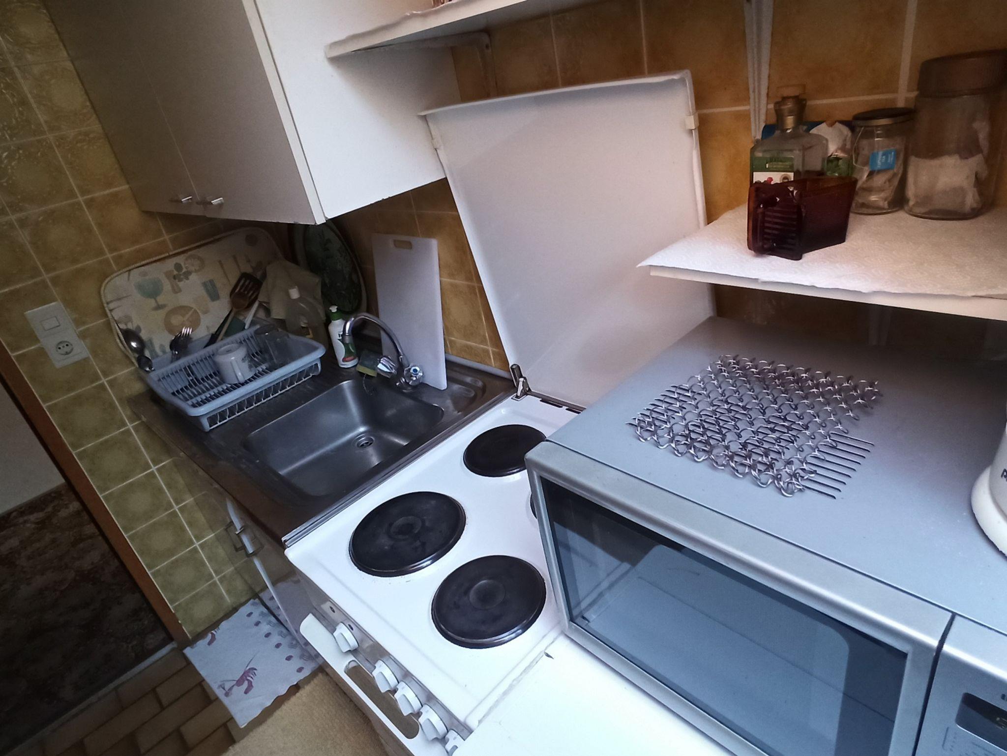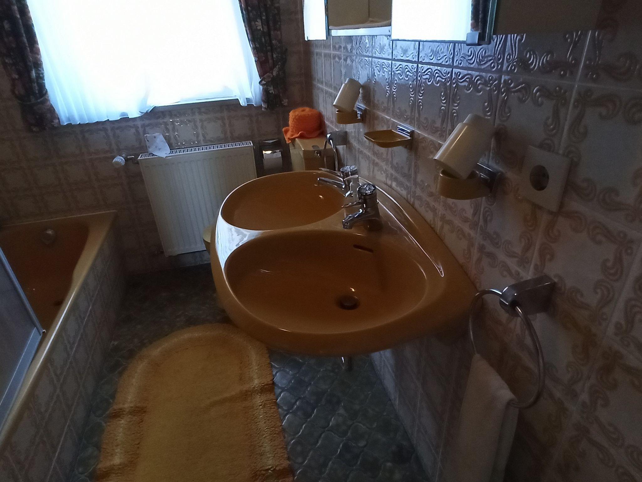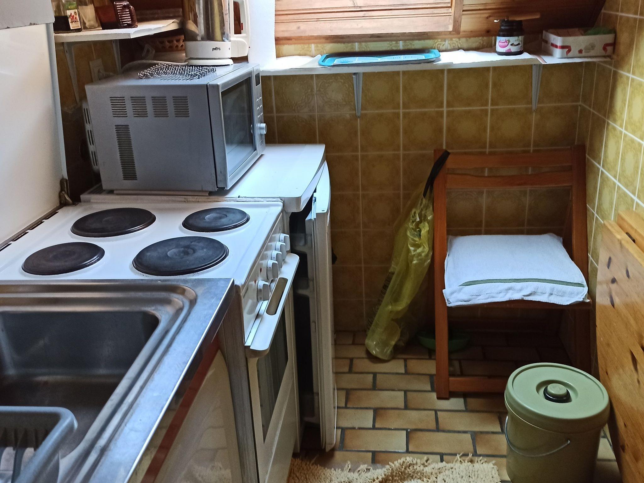 Das Gemeinschaftsbad mit Badewanne und Toilette befindet sich genau gegenüber. Daneben rechts eine zusätzliche Gemeinschaftstoilette. Neben dem Bad links ist die Gemeinschaftsküche mit Kühlschrank, Backofen, Mikrowelle, 4 Kochplatten, Wasserkocher, Kaffeemaschine, Geschirr, Töpfe, Pfannen, Besteck etc.