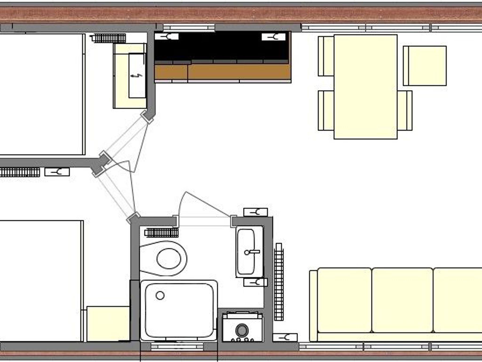 Im Inneren des Hausbootes finden Sie neben dem Wohnraum mit Fußbodenheizung für kalte Tage zwei Schlafräume mit je einem Doppelbett sowie ein modernes Duschbad. Zwei weitere Schlafmöglichkeiten befinden sich auf der ausziehbaren Couch im Wohnraum. Genügend Stauraum finden Sie in den Schränken sowie in den Schubladen unter den Betten.