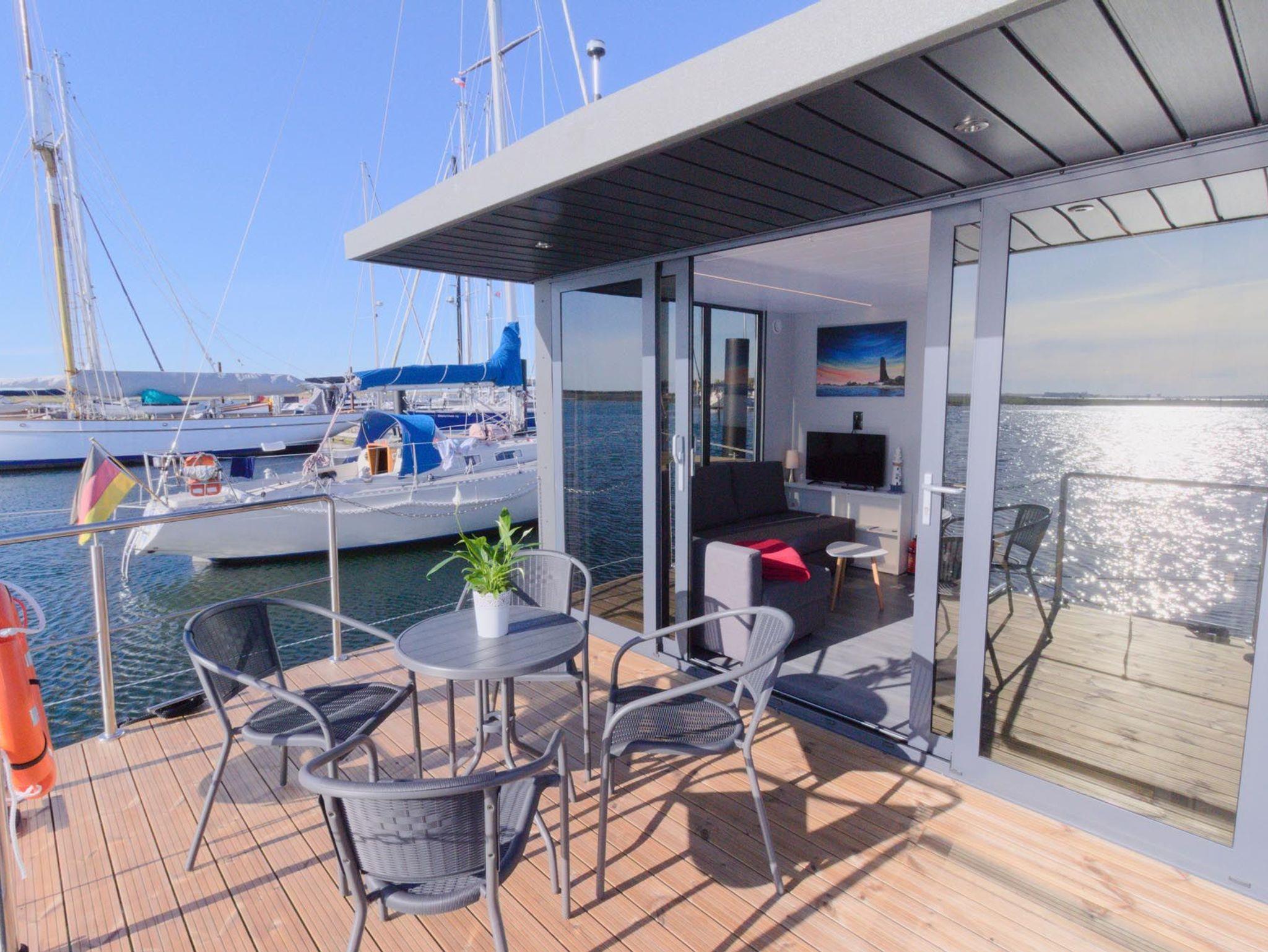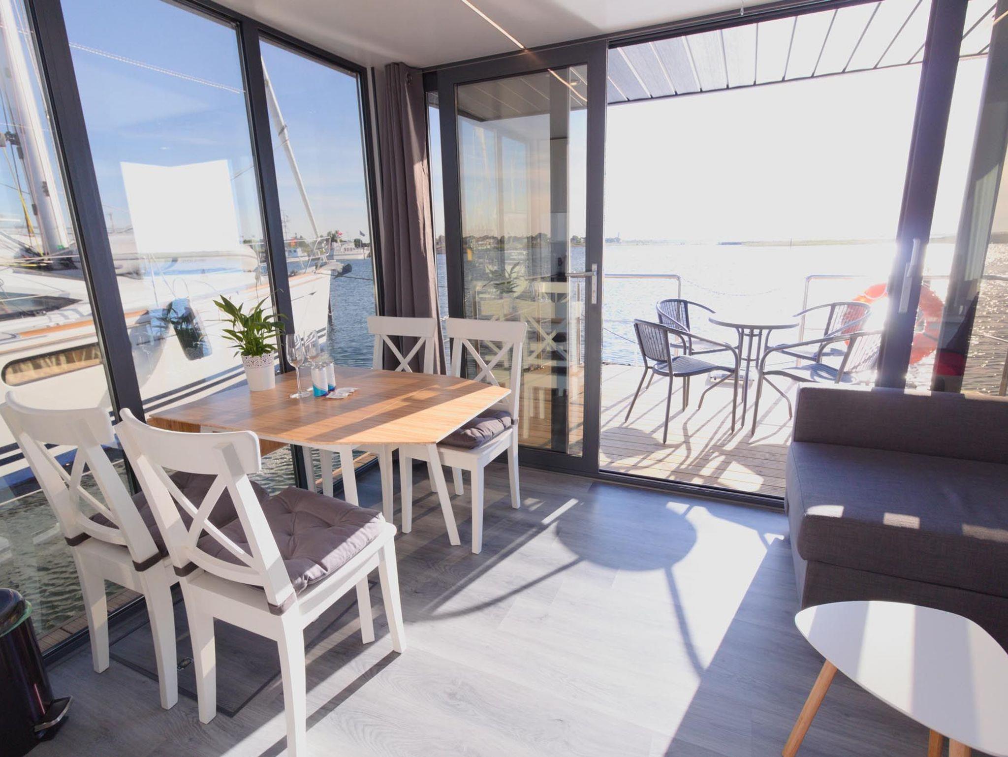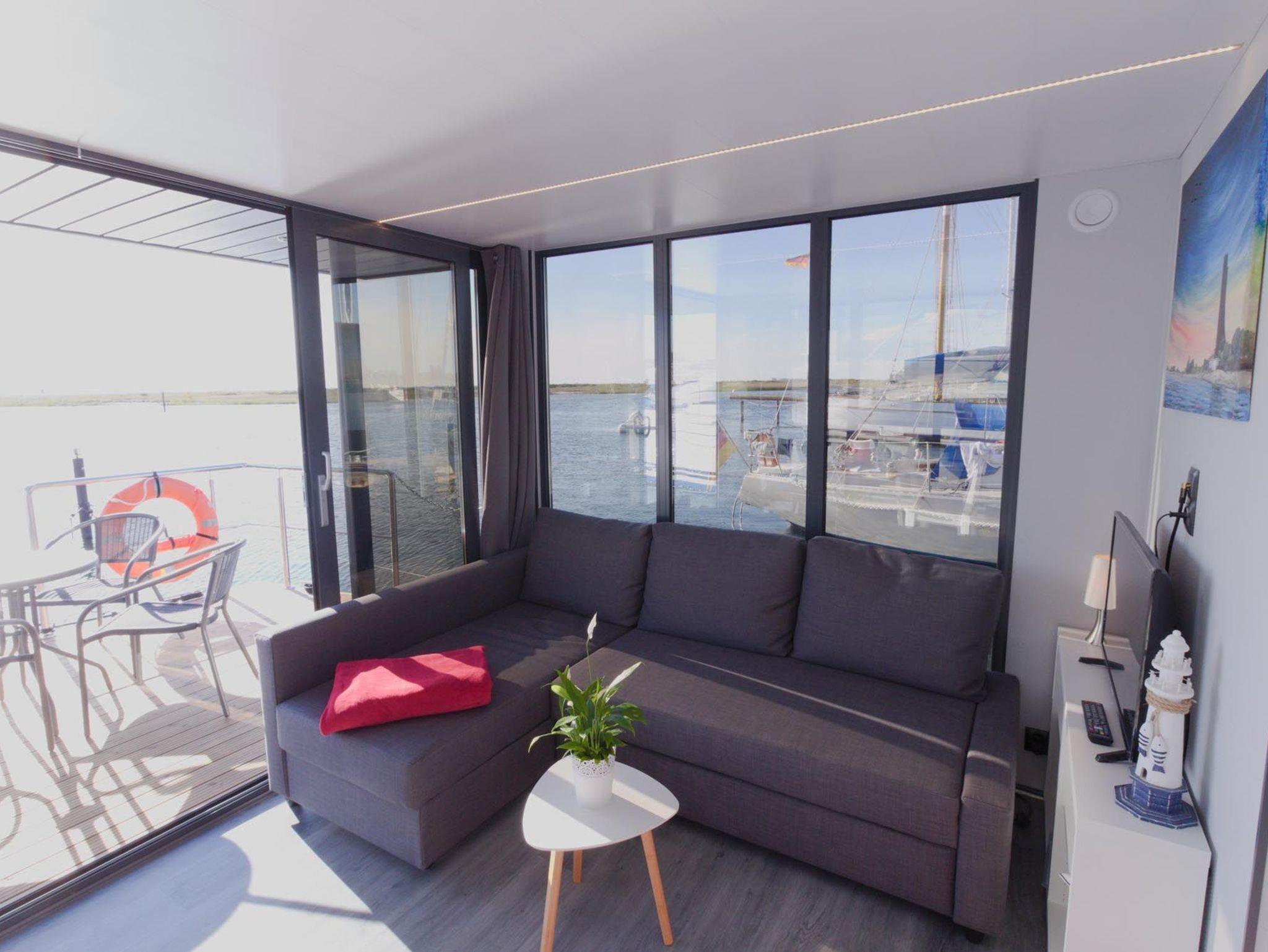 Dieses großzügige mobile Hausboot bietet Ihnen auf 46 qm Bootsfläche den ganzen Komfort vergleichbar mit einer modernen und hochwertigen Ferienwohnung mit Sonnen- und Dachterrasse. Im gemütlichen Wohnraum mit Wohnküche lässt es sich entspannt auf der ausziehbaren Couch verweilen oder Sie kommen am großzügigen Tisch zu einem leckeren Essen oder Spieleabend zusammen.