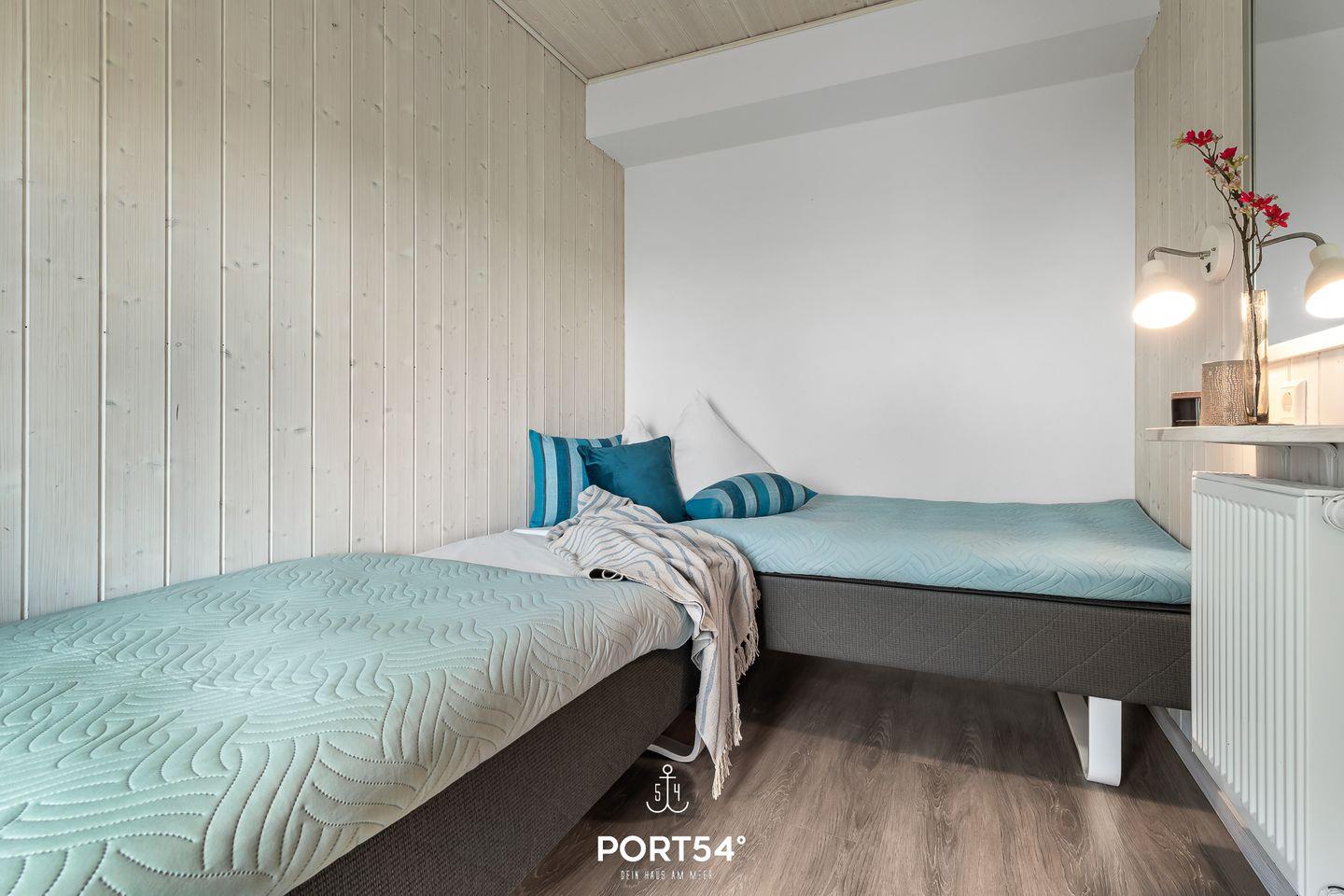 Im Erdgeschoss befinden sich zwei Schlafzimmer, wovon eins mit zusammengeschobenen Einzelbetten (zusammen 180x200cm) und das andere mit zwei Einzelbetten (je 90x200cm) ausgestattet ist. Eines der Schlafzimmer verfügt über einen TV, sowie beide über verdunkelbare Fenster. Ebenfalls im Erdgeschoss gelegen: das Badezimmer mit ebenerdiger Dusche, WC, Waschbecken und Trockensauna.
