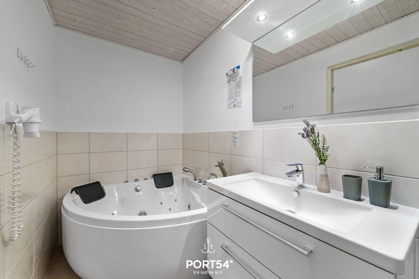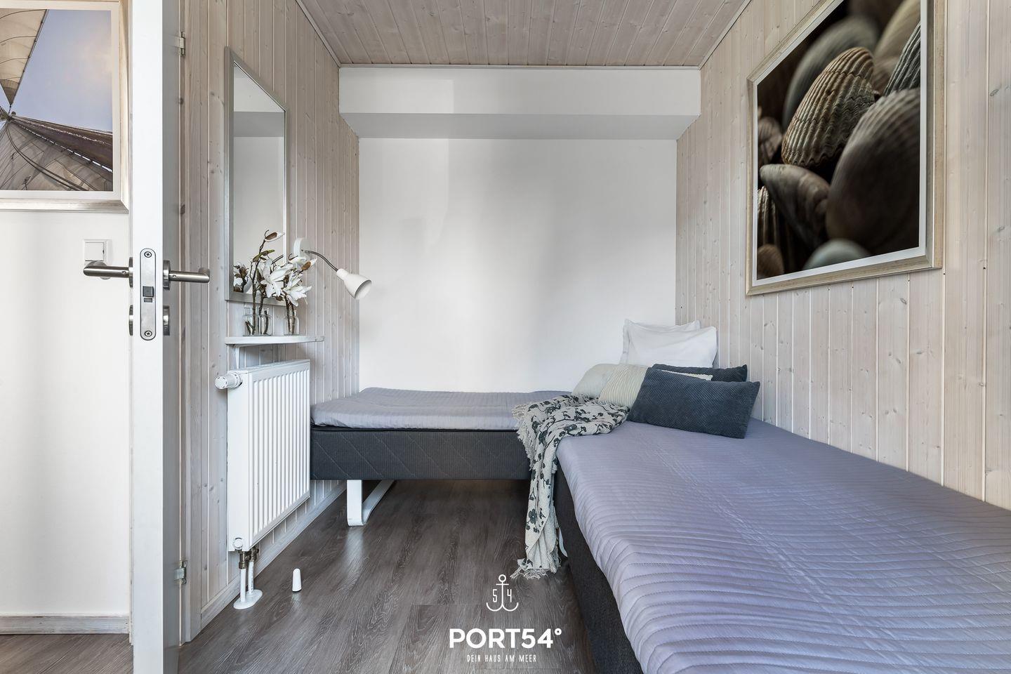 Im Erdgeschoss befinden sich zwei Schlafzimmer. Eines davon bietet zwei zusammengeschobene Einzelbetten (zusammen 180x200cm) und das andere zwei Einzelbetten (je 90x200cm). Eines der Schlafzimmer verfügt über einen TV, sowie beide über verdunkelbare Fenster. Ebenfalls im Erdgeschoss gelegen: das Badezimmer mit angenehmer Fußbodenheizung, ebenerdiger Dusche, WC, Waschbecken und Whirlpool.