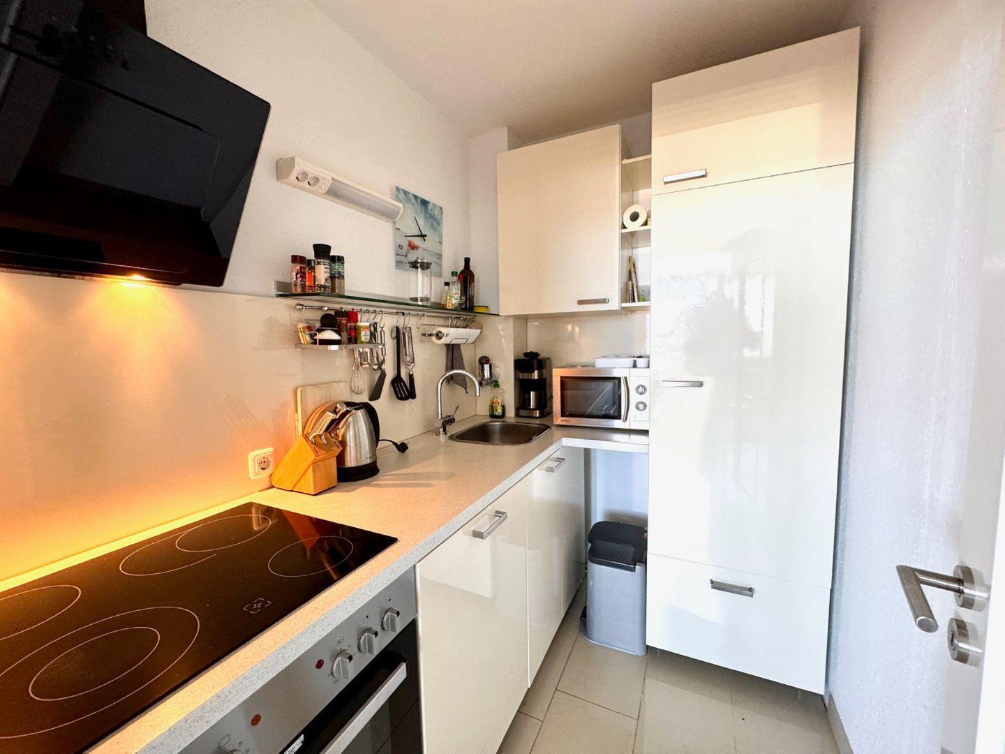 Im offenen Wohn- und Essbereich erwartet Sie eine gemütliche Sofaecke, an die sich der Esstisch anschließt. Die Fensterfront viel Tageslicht hinein und bietet einen herrlichen Ausblick auf die Ostsee und den Yachthafen. Vom angrenzenden Balkon aus können Sie die frische Meeresluft und das maritime Flair genießen – perfekt für einen entspannten Start in den Tag oder einen stimmungsvollen Ausklang am Abend.