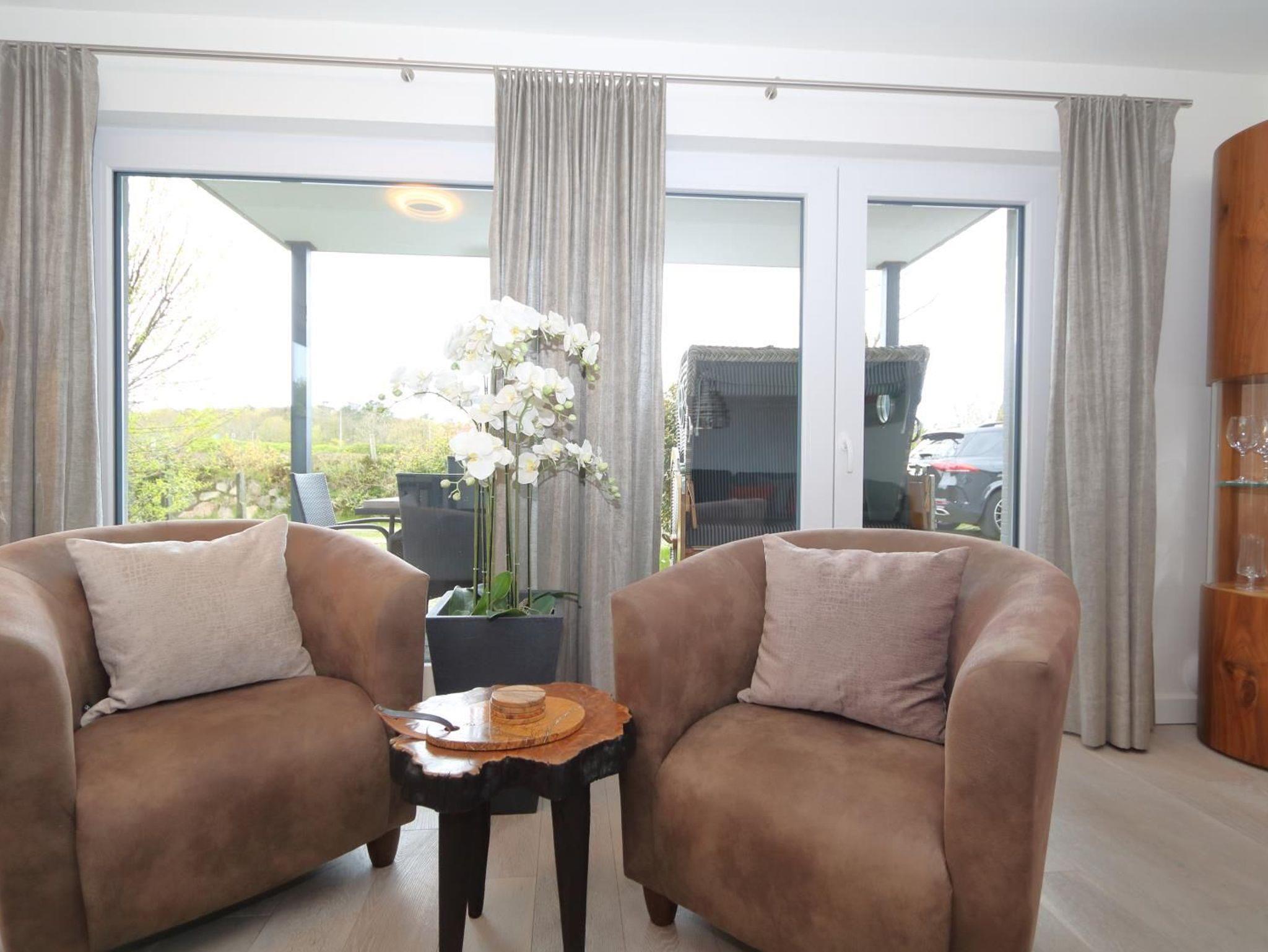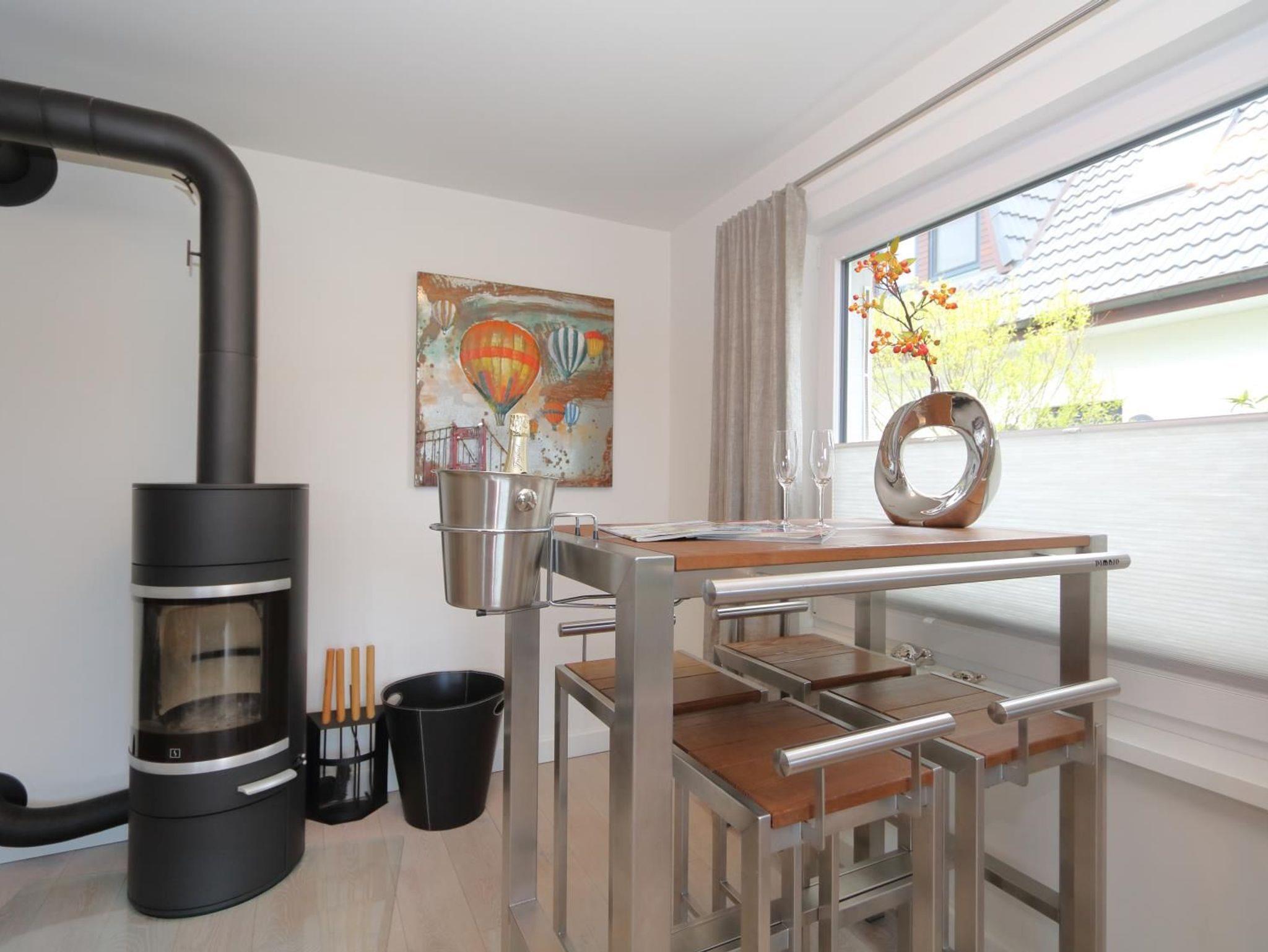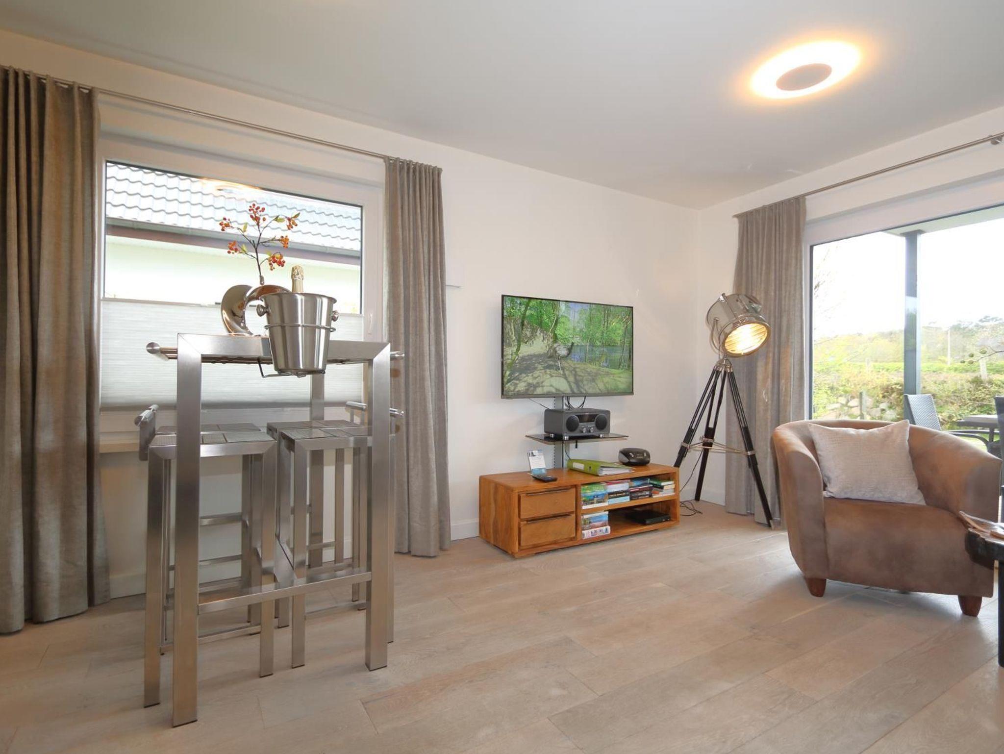 Ein helles Wohnzimmer mit großer Fensterfront zur möblierten Terrasse, Kaminofen. TV SAT/Kabel, Radio, Sofa.Bartresen.