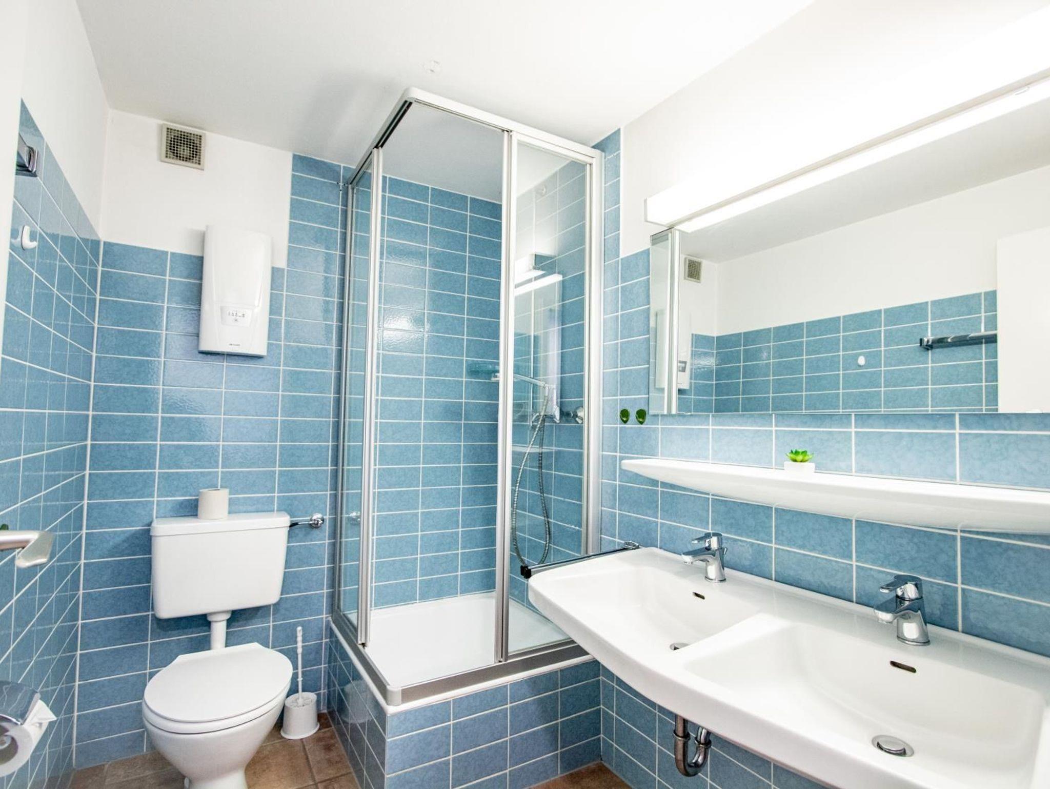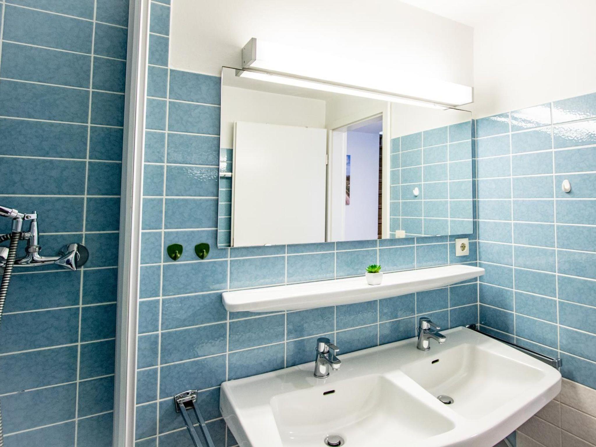 Badezimmer mit Dusche, WC, Waschtisch. Ausreichend Handtücher und Vorleger.