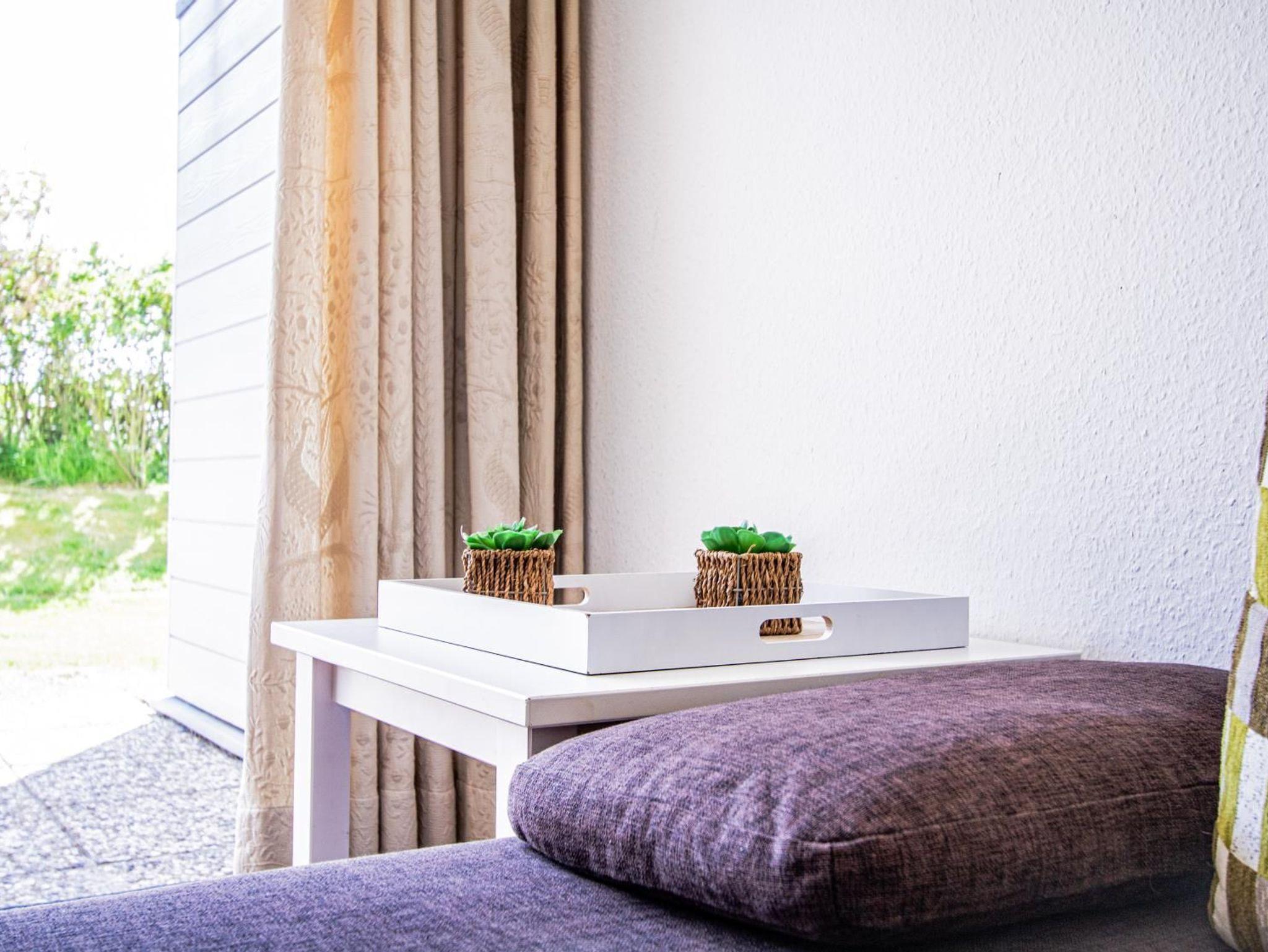 Ein helles Wohnzimmer mit großer Fensterfront zum möblierten Garten mit Sitzecke und Strandkorb. Großer Smart-Tv mit Sat-Anschluß, Eßecke und Couchgarnitur.