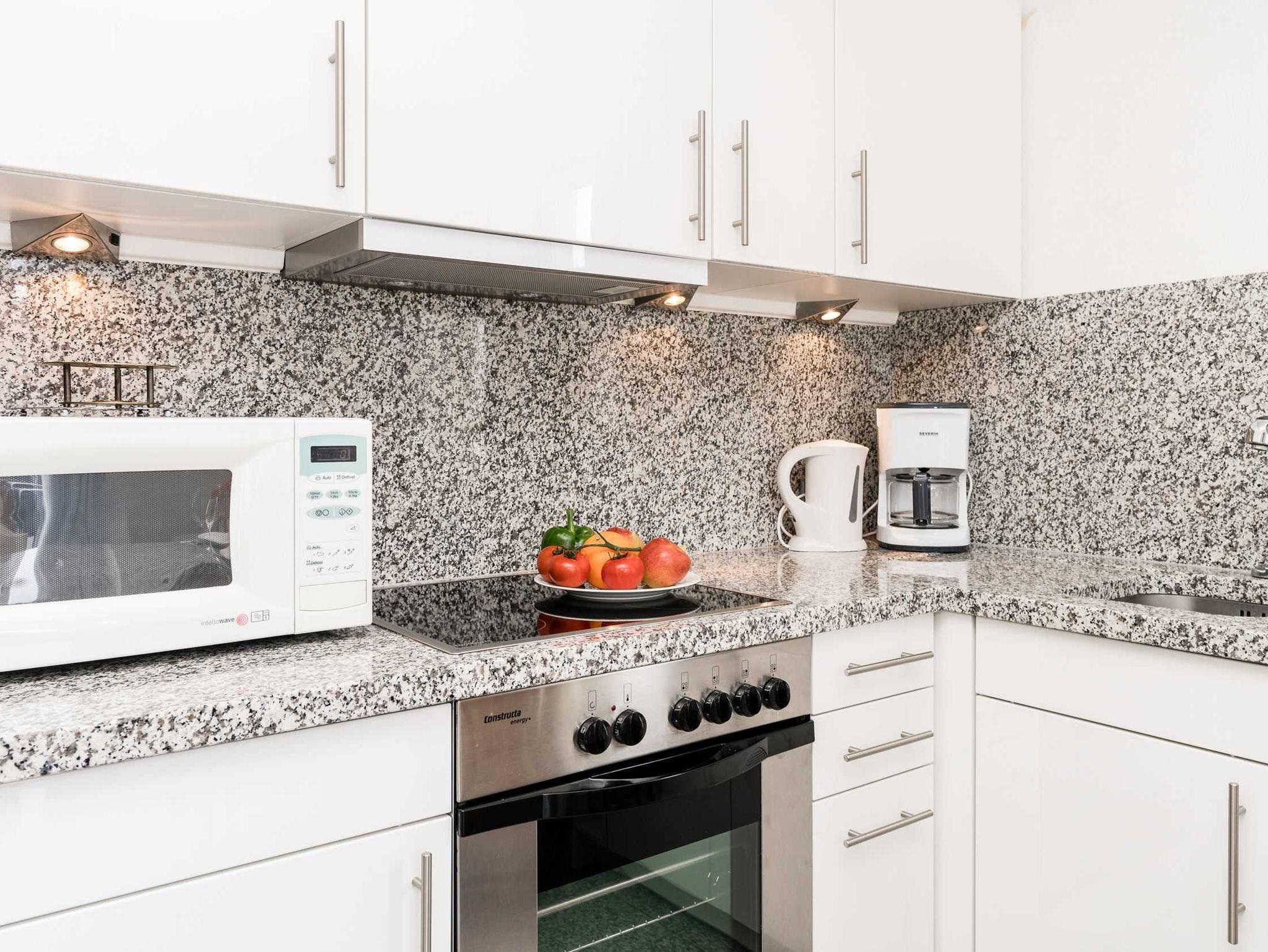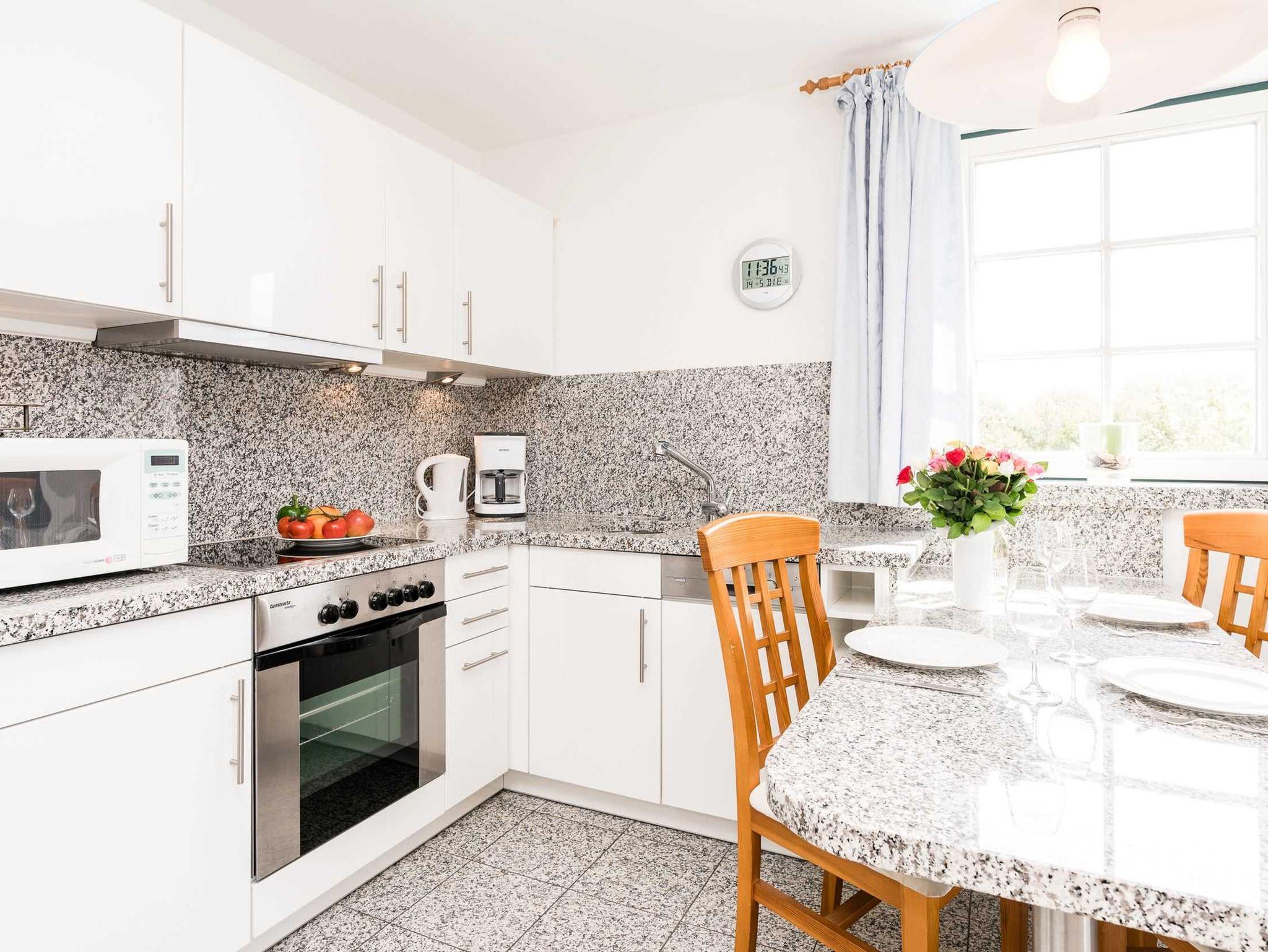 Das Wohnzimmer mit Küchenzeile ist ebenfalls mit Natursteinboden und sonstigen Natursteinbelegen (Tisch und Küchenarbeitsplatte)) versehen. Die Einrichtung im Friesenstil bietet ein behagliches Ambiente, eine kleine Bibliothek sorgt für Abwechslung an Regentagen. Der Balkon mit Sichtschutz zur Nachbarwohnung ist nach Süden ausgerichtet.
