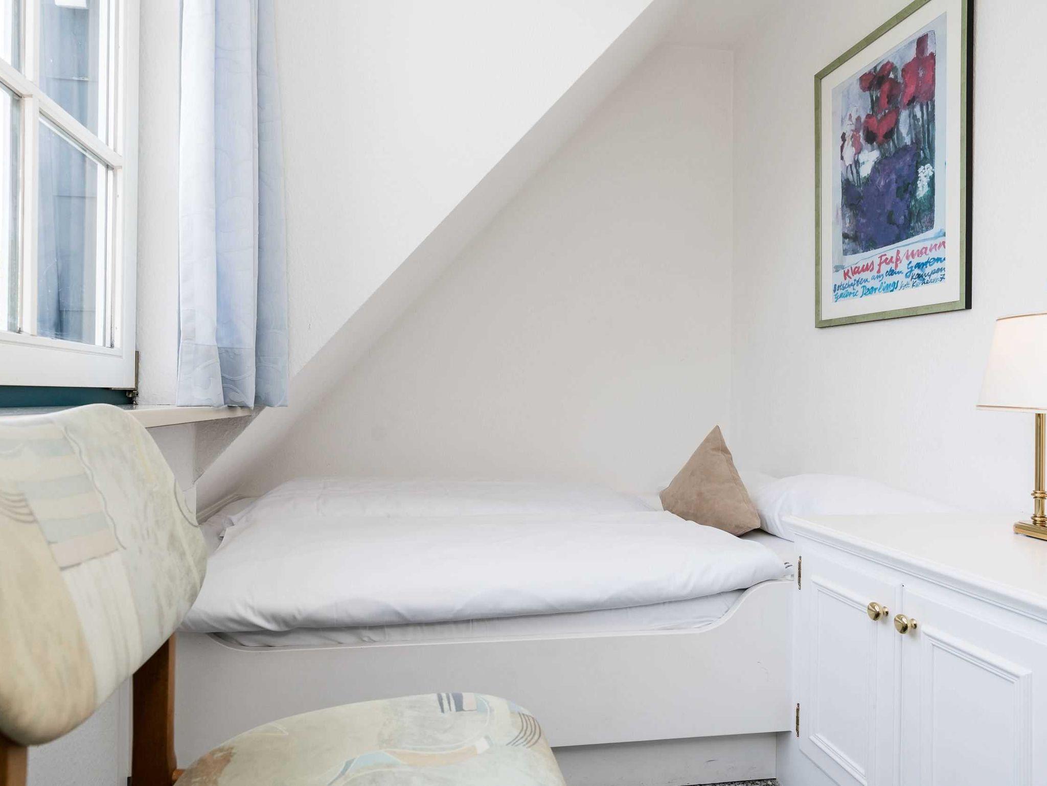 Die Unterkunft verteilt sich über 1. OG und DG. Im 1. OG. finden Sie das lichtdurchflutete Badezimmer, einen Schlafraum mit eingebautem großen Bett und einem Einbauschrank. Der Blick aus diesem Zimmer zeigt am Horizont den Kampener Leuchtturm.