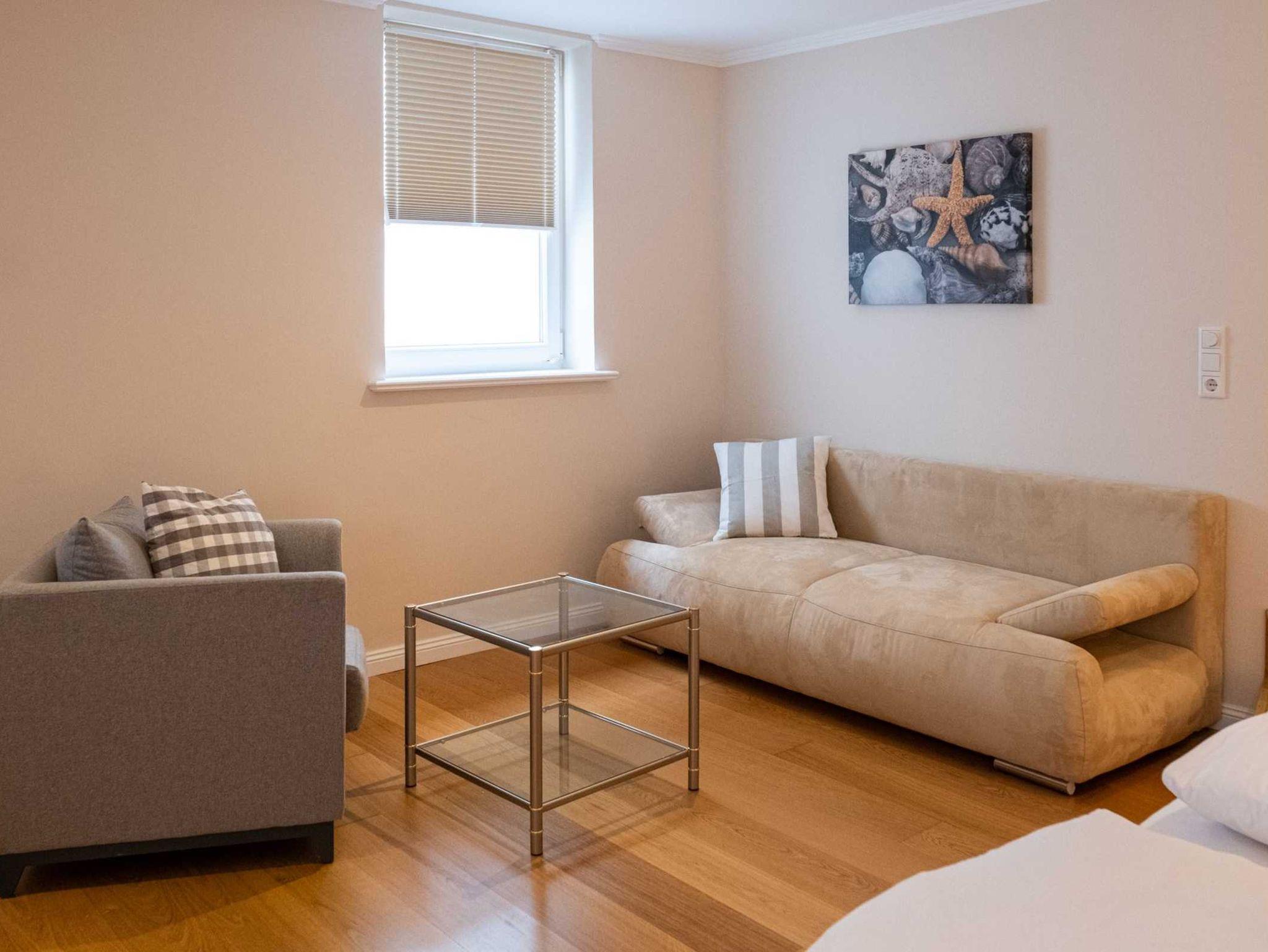 Zur Wohnung gehört ein großzügiger Garten Teil mit Terrasse. Dieser ist mit Strandkorb und Gartenmöbeln ausgestattet. Im Untergeschoss können Sie Waschmaschine und Trockner kostenfrei nutzen. Ein eigener Stellplatz befindet sich vor dem Haus.