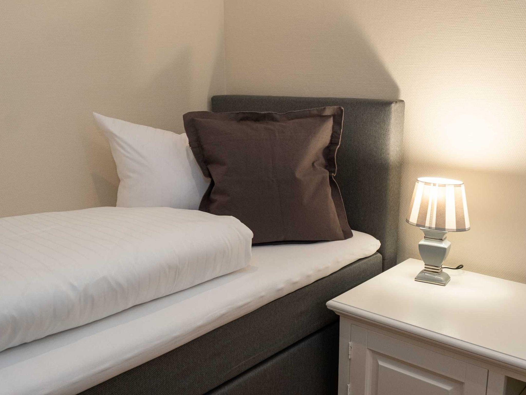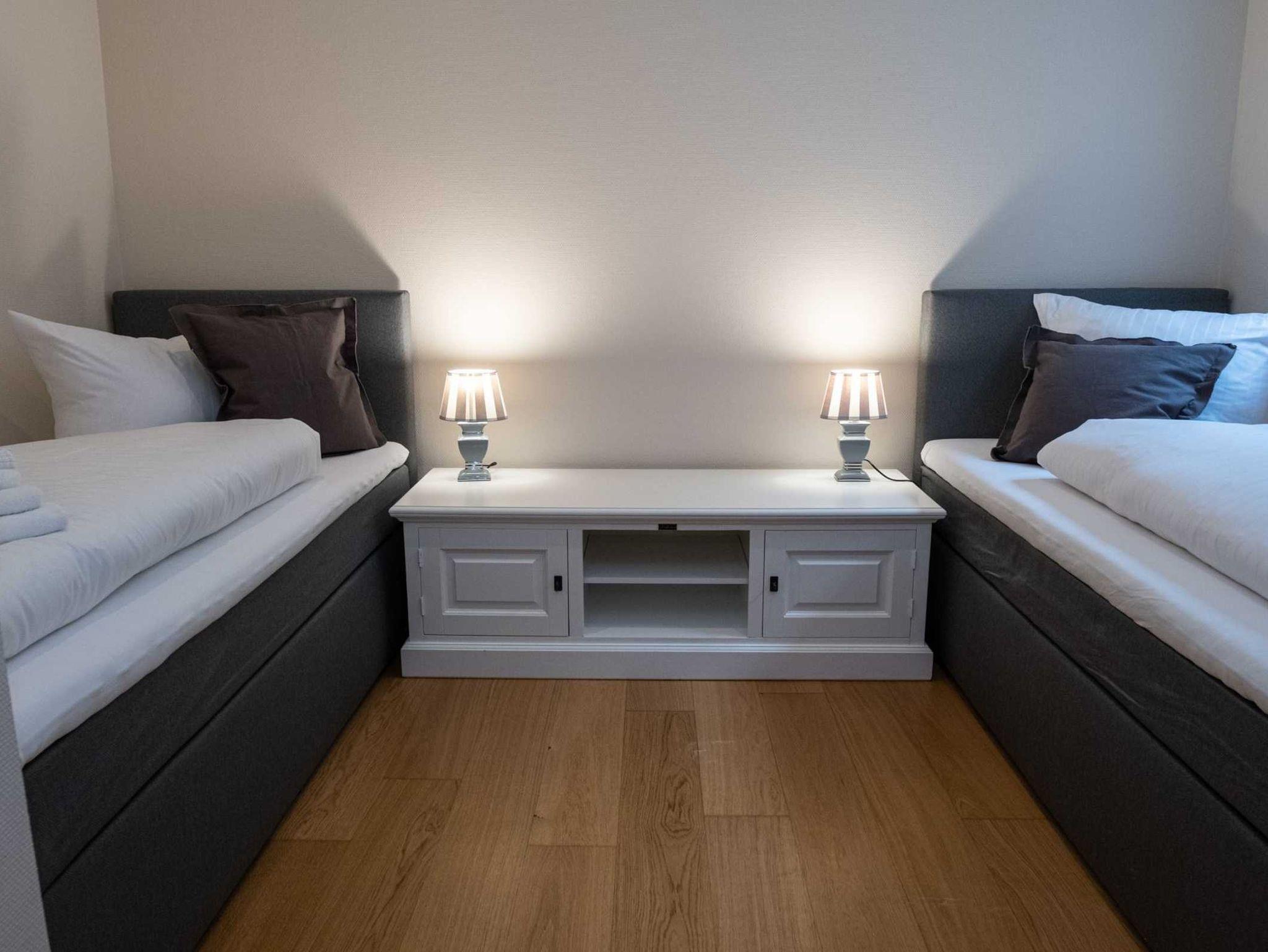Sie finden zwei Schlafzimmer im Untergeschoss vor, eines mit einem Doppelbett ( 180 x 200 ) und eines mit zwei getrennten Boxspringbetten, die aber bei Bedarf auch zusammen gestellt werden könnten.