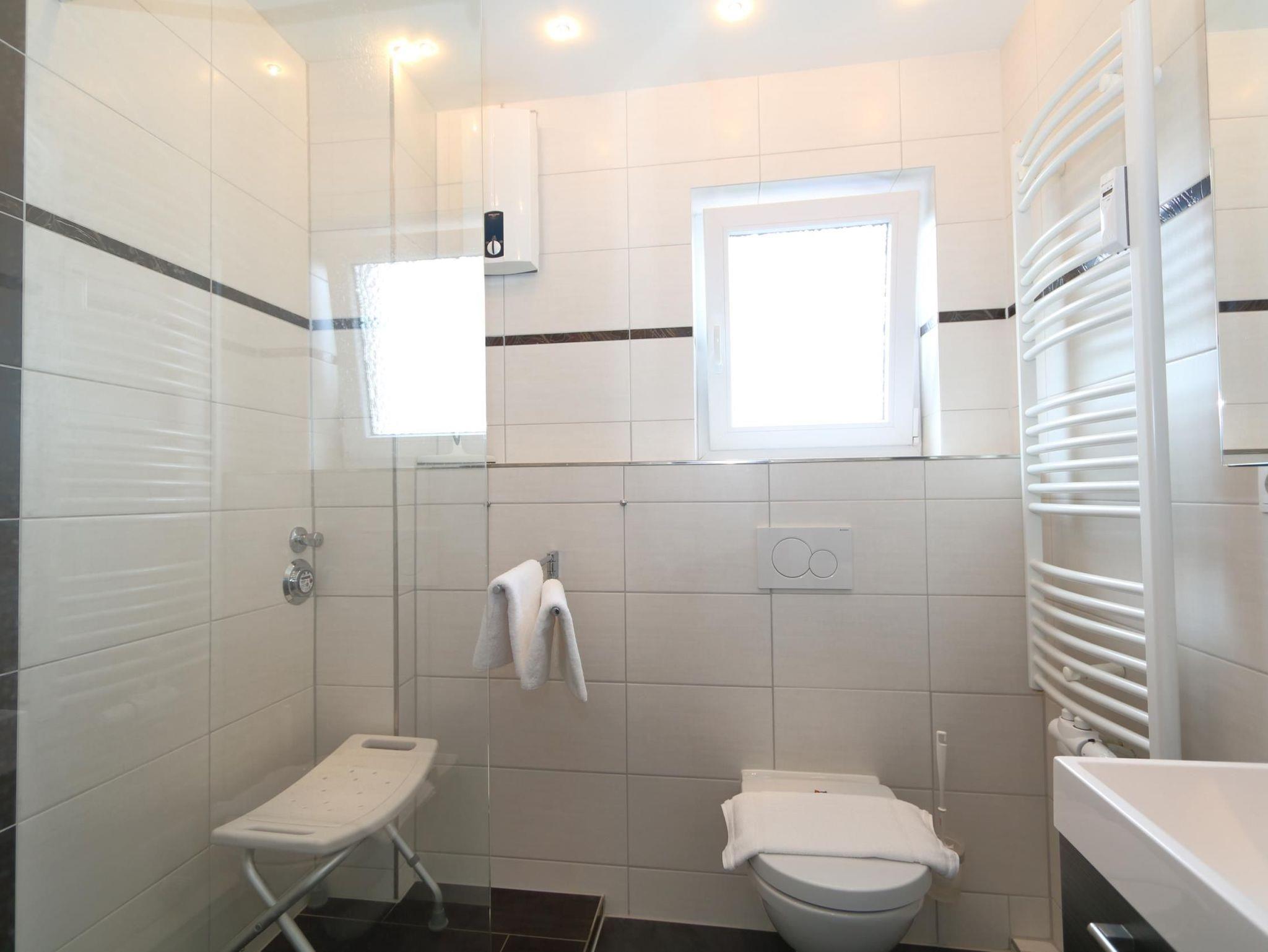 WC, Dusche, Waschbecken, Spiegel, Fenster. Ausreichend Handtücher und Vorleger.
