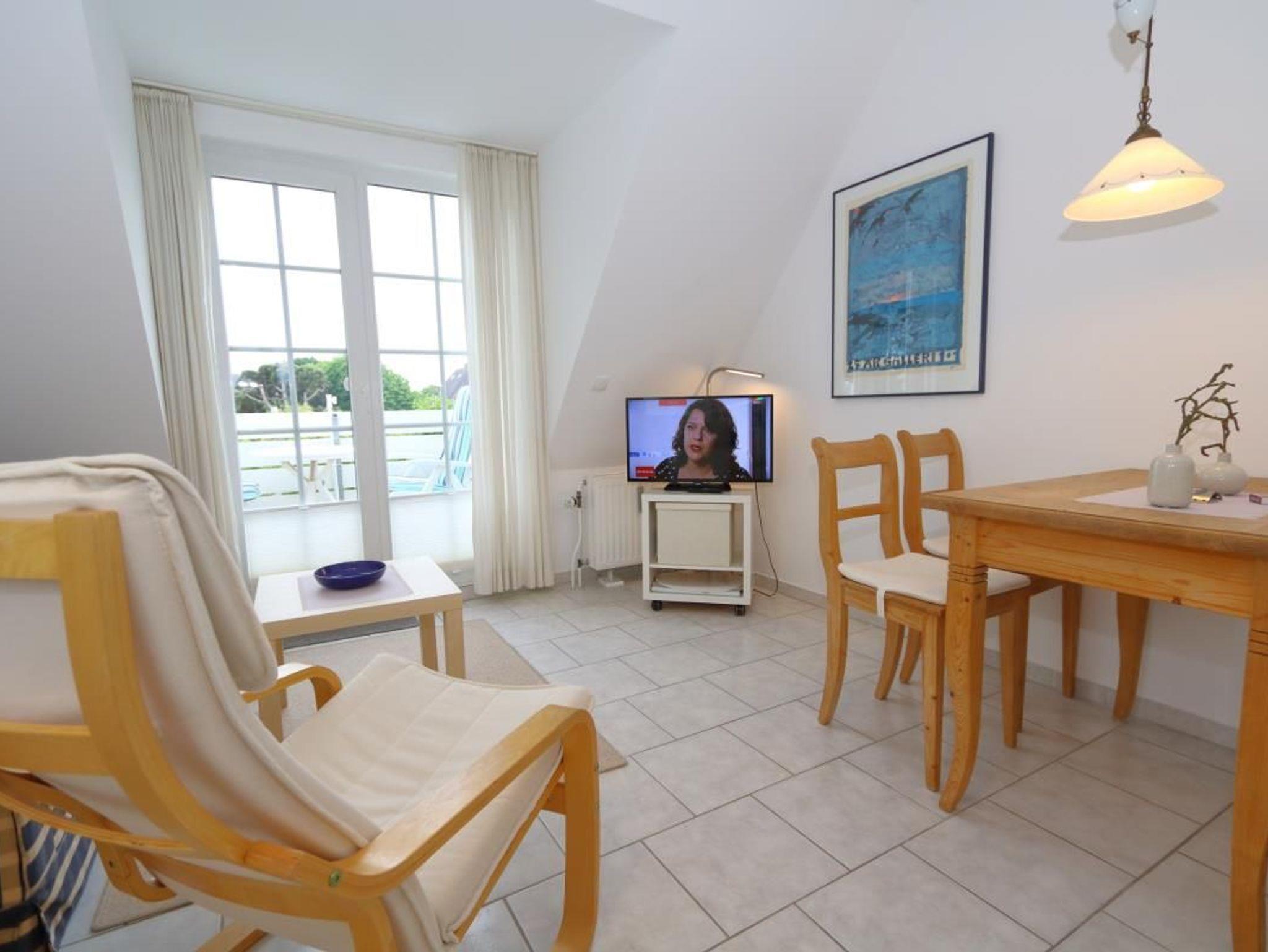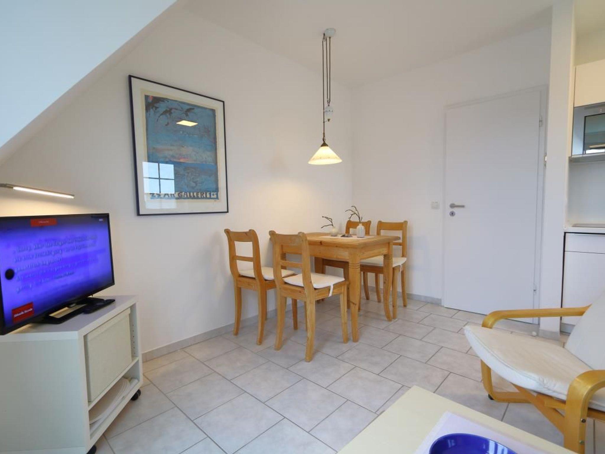 Ein gemütlicher Einrichtungsstiel in hellenm Farben erwartet Sie. Wohnzimmer mit bequemer Sitzgarnitur und Esstisch. Flachbildschirm sowie kostenloses W'Lan