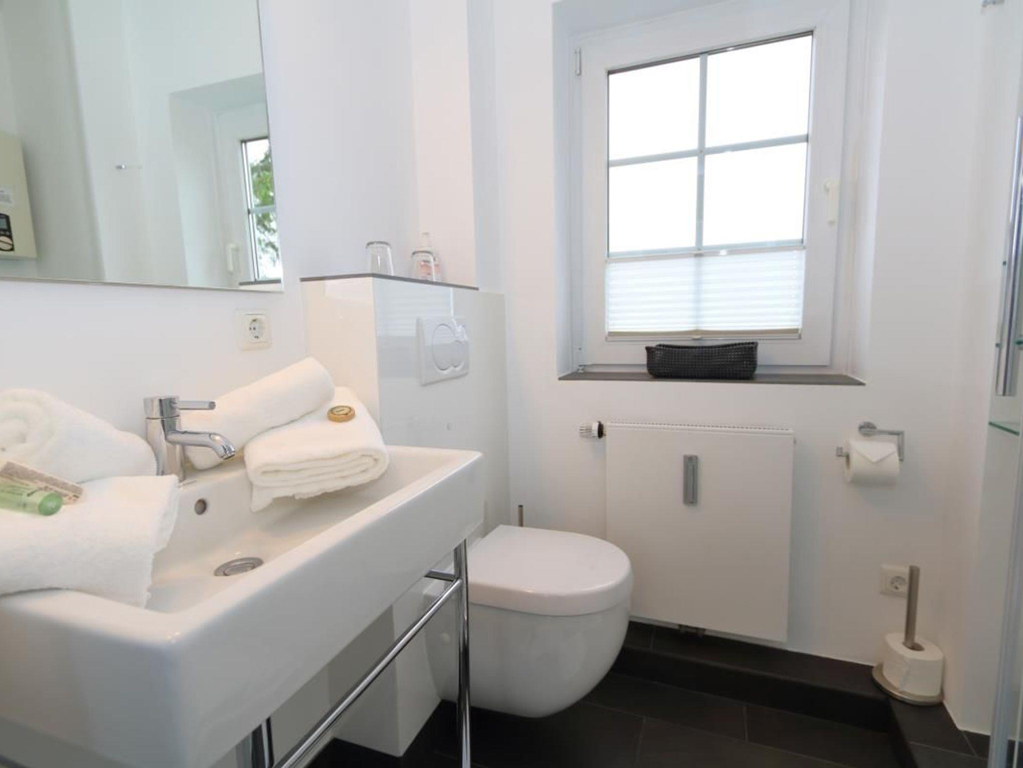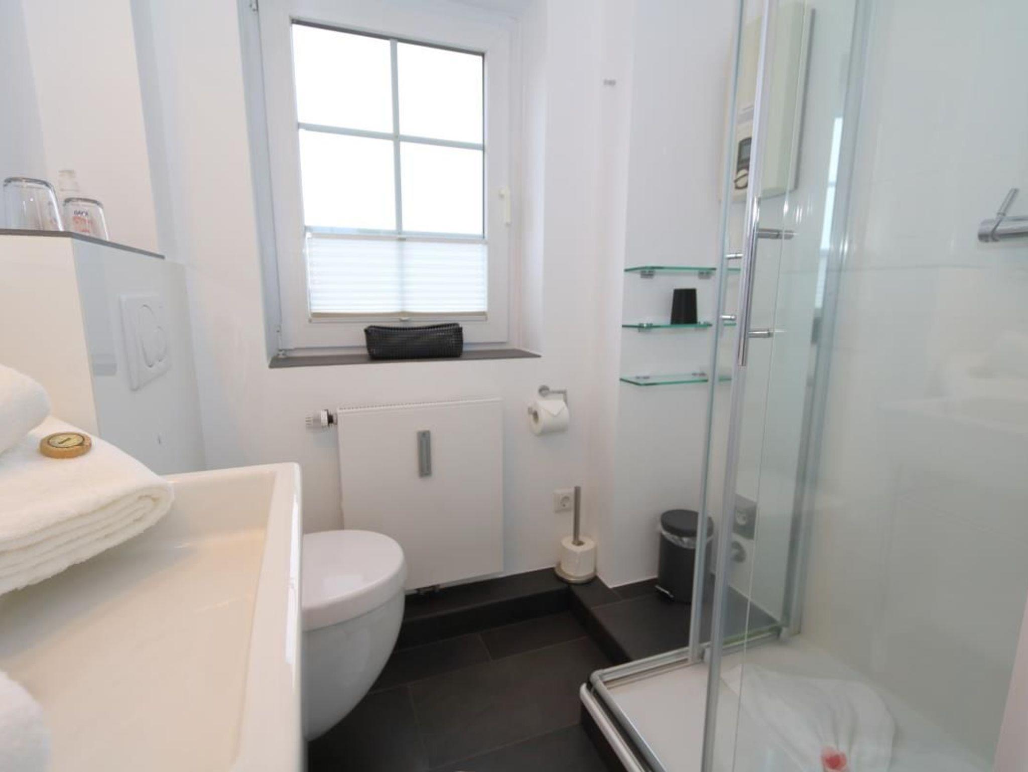Badezimmer mit Dusche, WC, Waschtisch, Waschmaschine. Ausreichend Handtücher und Vorleger.