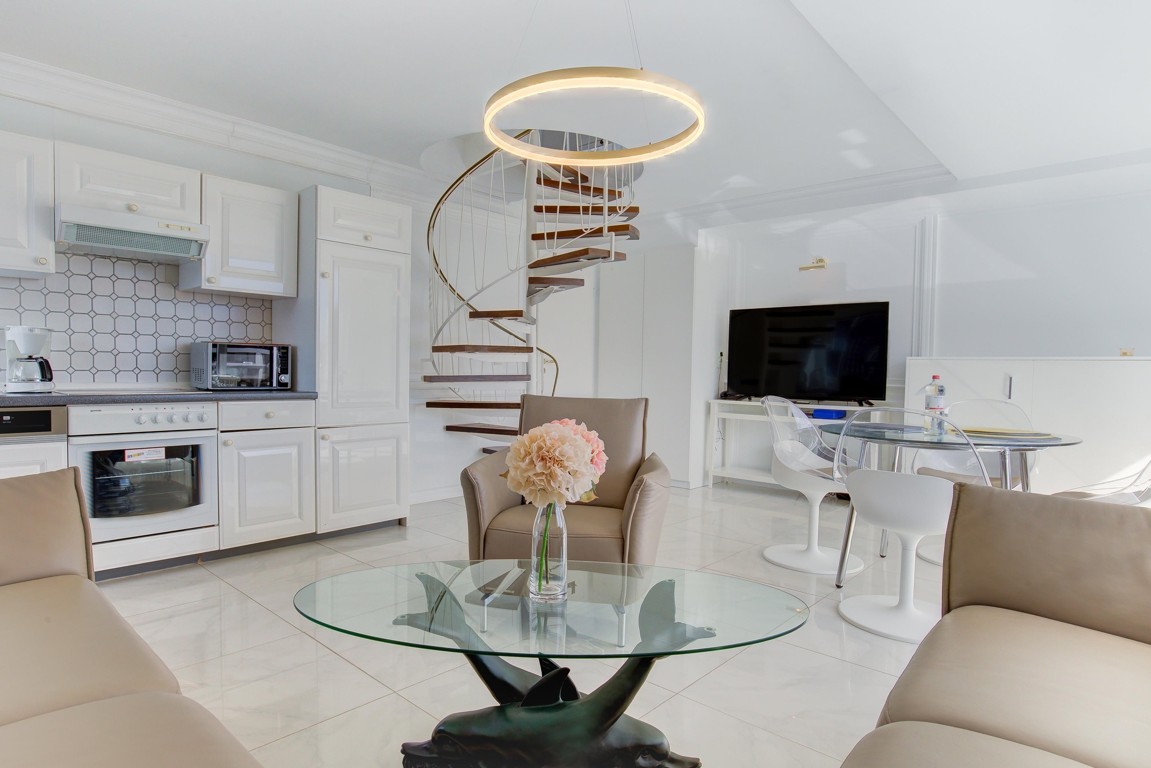 Die komplett ausgestattete Küche mit Geschirrspüler und Backofen lässt keine Wünsche offen. Beide Schlafzimmer (das erste mit Boxspringbett und TV, das zweite mit einem Einzelbett) sowie das Bad mit Whirlpool befinden sich oberhalb des Wohnzimmers.