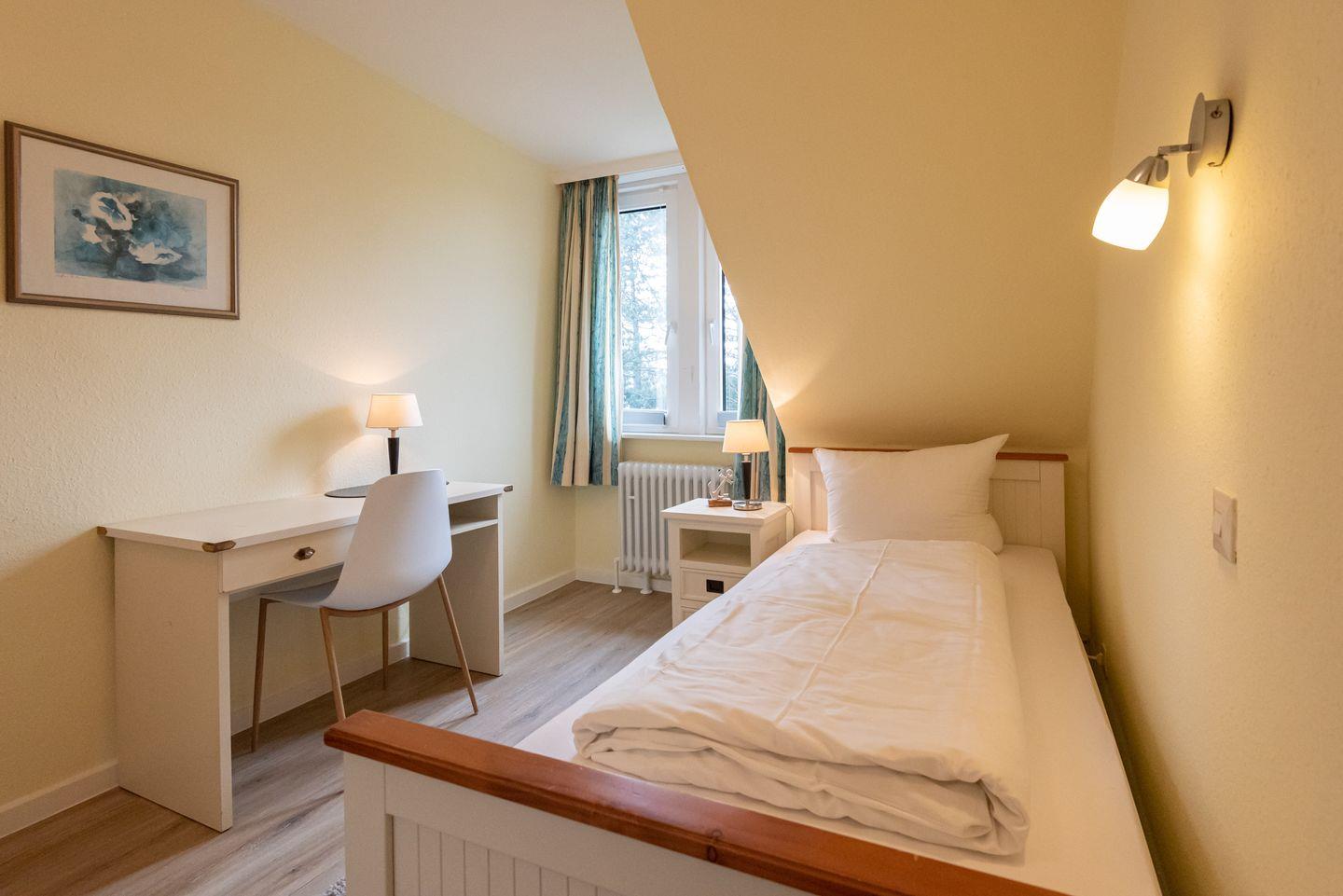 Schlafzimmer 3: Einzelbett, Kleiderschrank und Fenster.