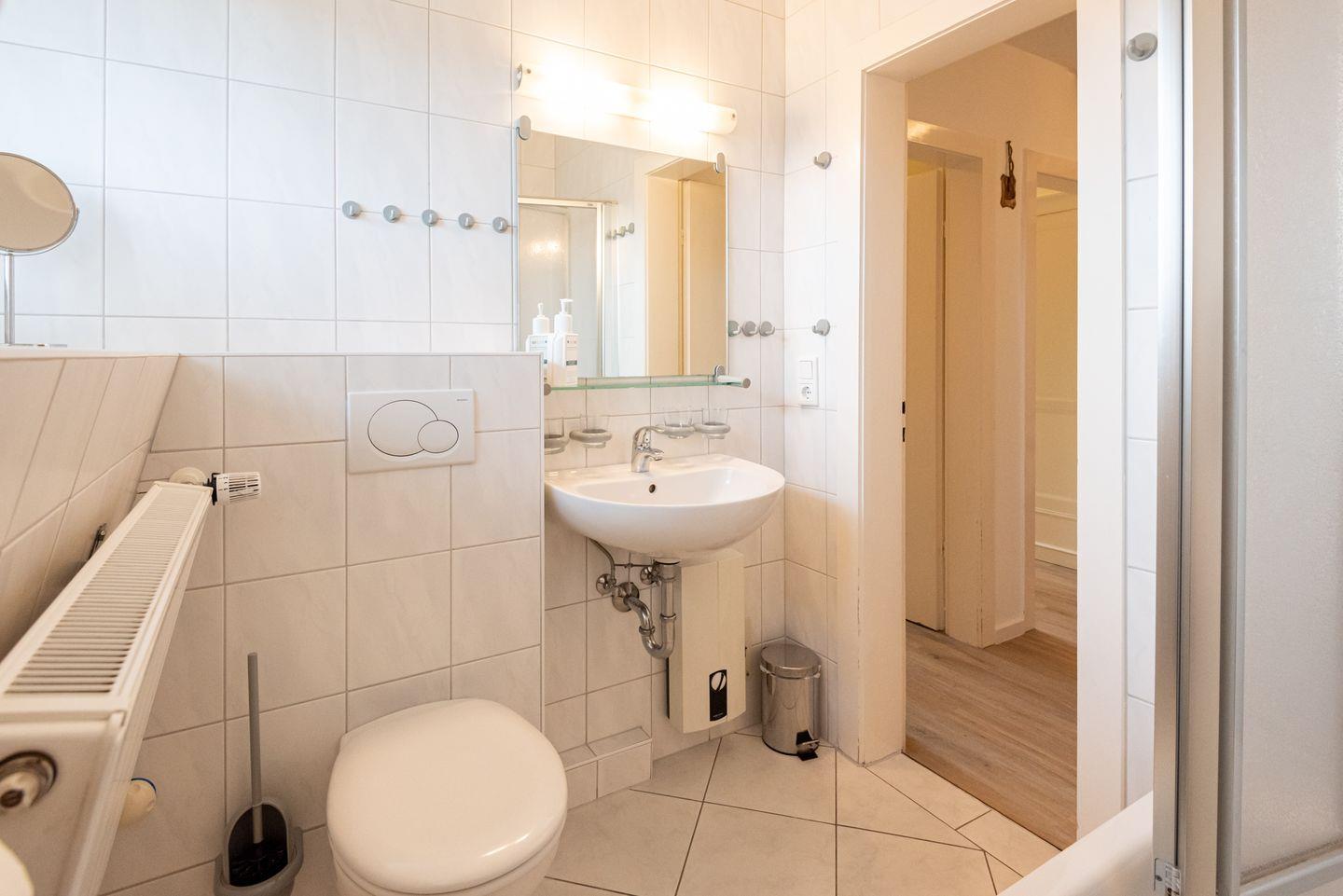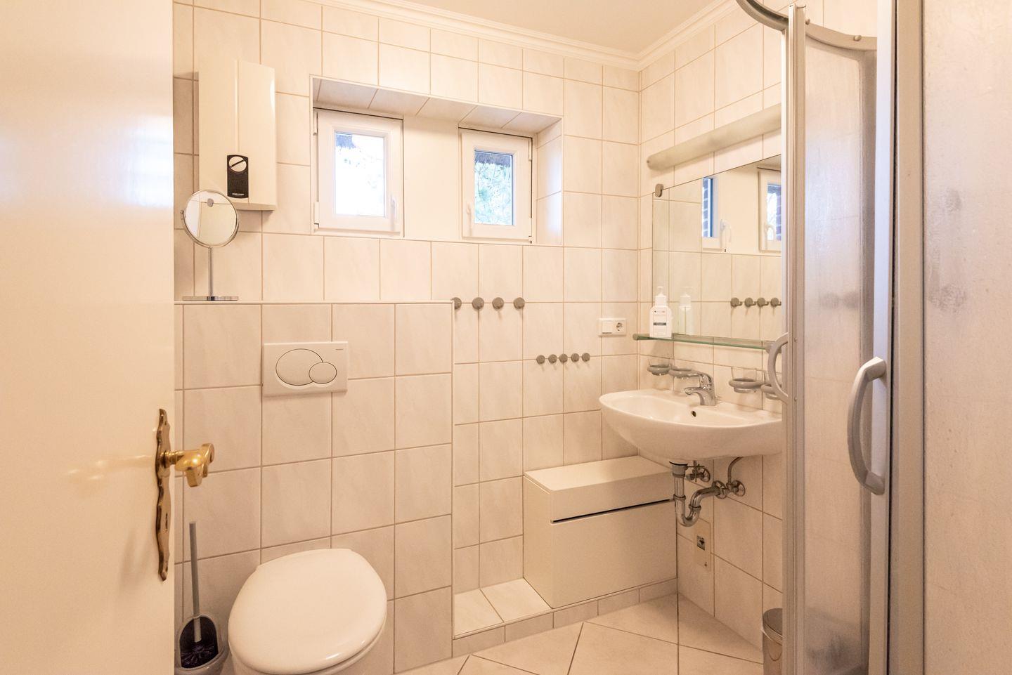 Badezimmer 1: Helles Duschbad mit WC und Fenster.