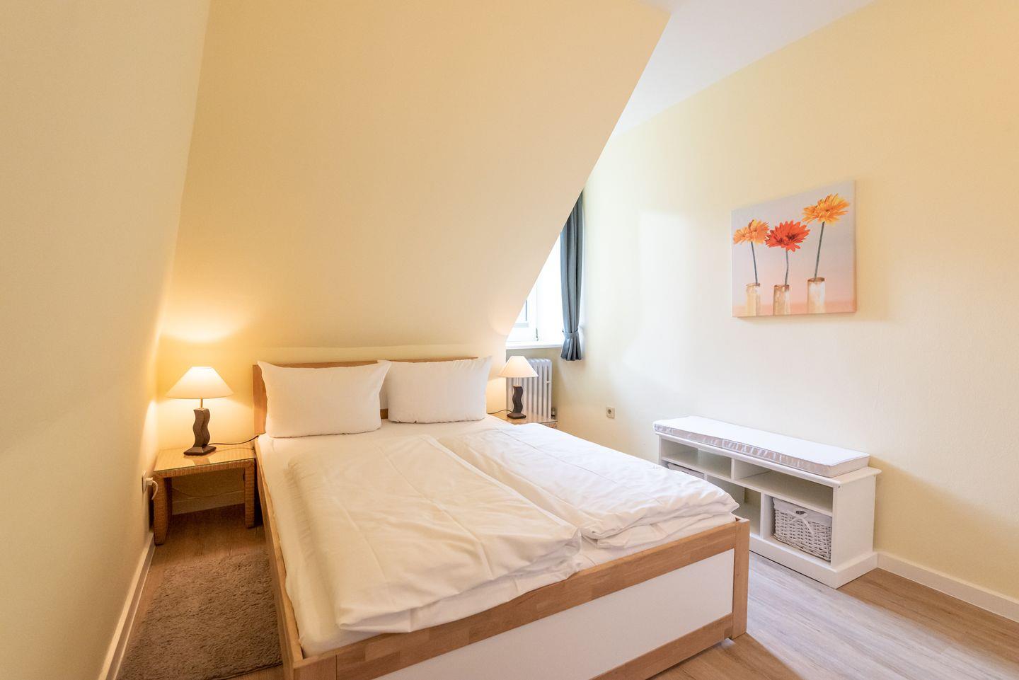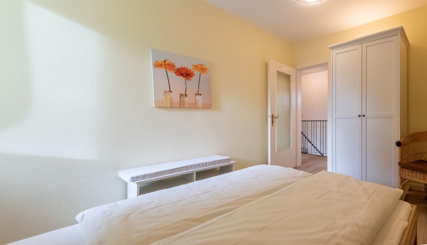 Schlafzimmer 1: Doppelbett, großer Kleiderschrank und Fenster.