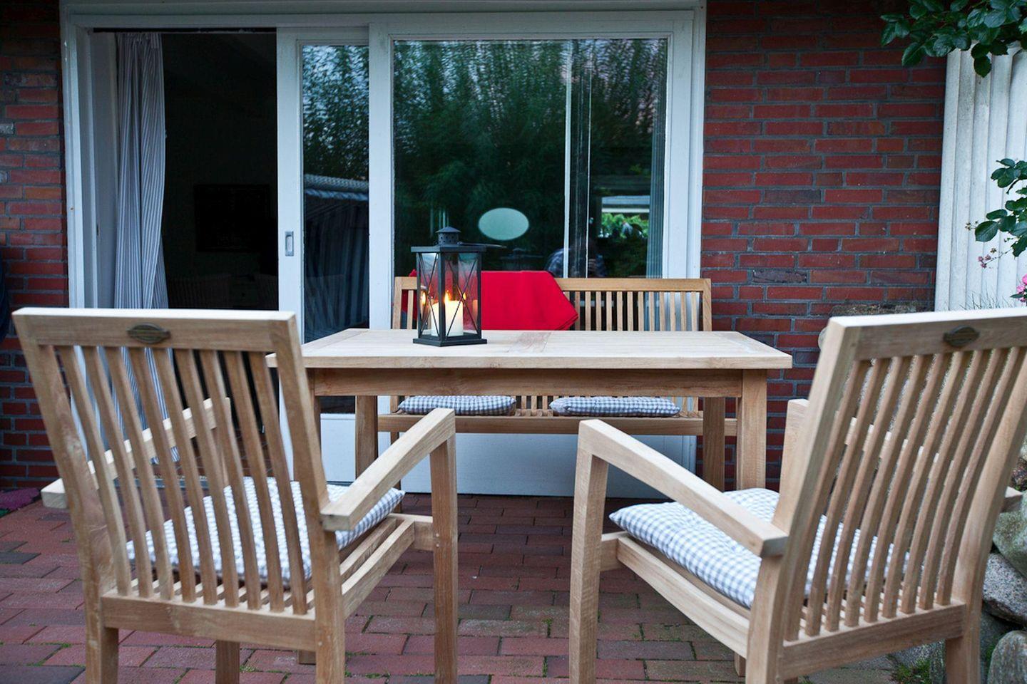 Koch-/Ess-/Wohnbereich: Heller und gemütlicher Wohnbereich mit integrierter Einbauküche und einladendem Essplatz. Die Küche ist mit einem elektrischen Espressokocher der Firma Cloer ausgestattet. Hier finden Sie alles, was Sie zum Ausspannen im Urlaub benötigen. An das Wohnzimmer schließt die herrliche Terrasse mit schönem Mobiliar und Strandkorb sowie der Garten an.