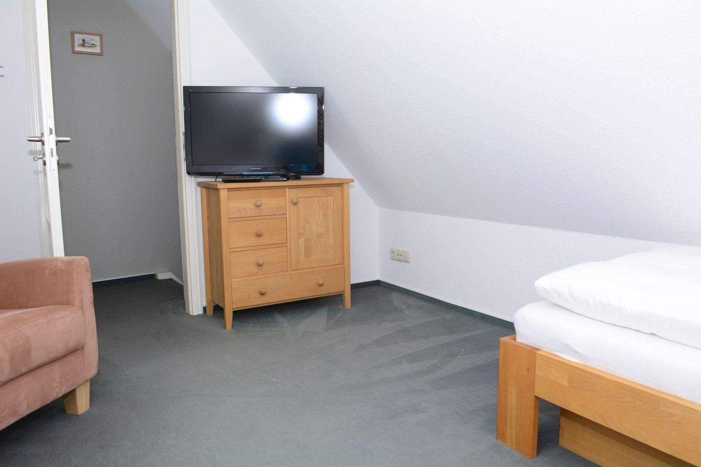 Schlafzimmer 2: Behagliches Schlafzimmer mit zwei Einzelbetten, TV und Fenster.