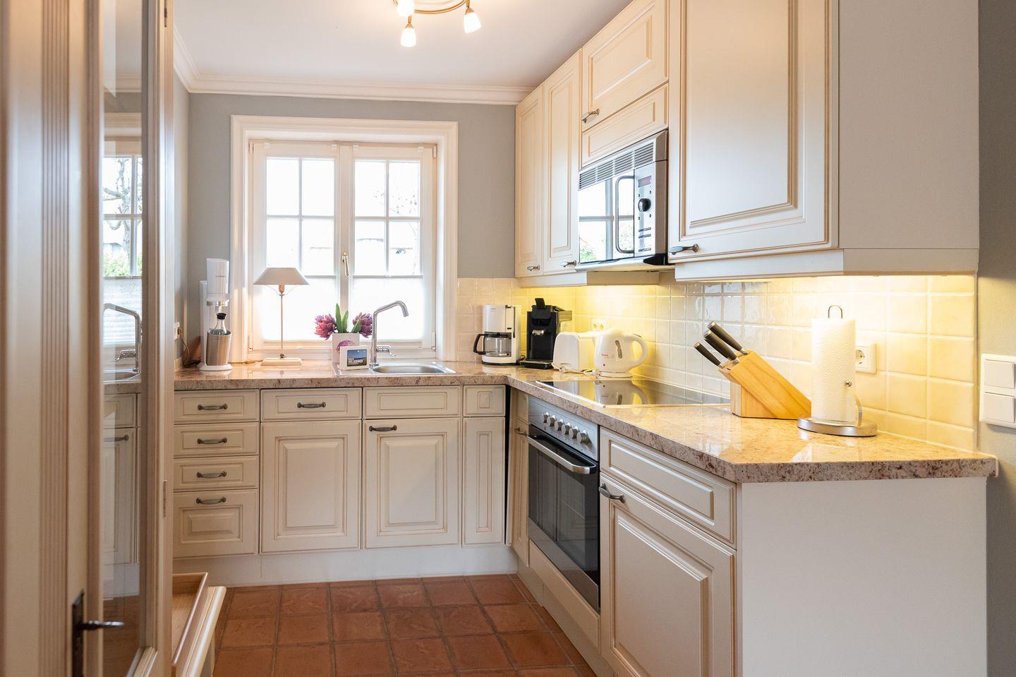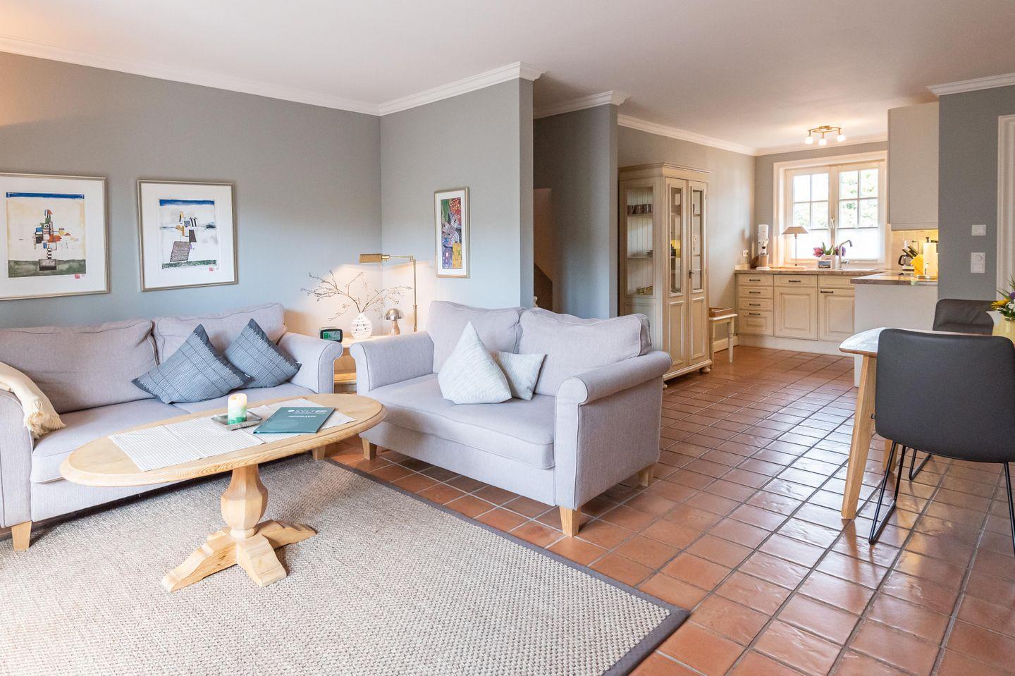 Wohn-/Koch-/Essbereich: Die moderne Landhausküche bietet Ihnen jeglichen Komfort, genau wie die bequeme Essgruppe. Die schöne Wohnlandschaft mit modernen Möbeln und TV laden zum Verweilen ein. Direkt vom Wohnzimmer erreichen Sie die großflächige Terrasse, die mit einem Strandkorb und hochwertigen Gartenmöbeln ausgestattet wurde.
