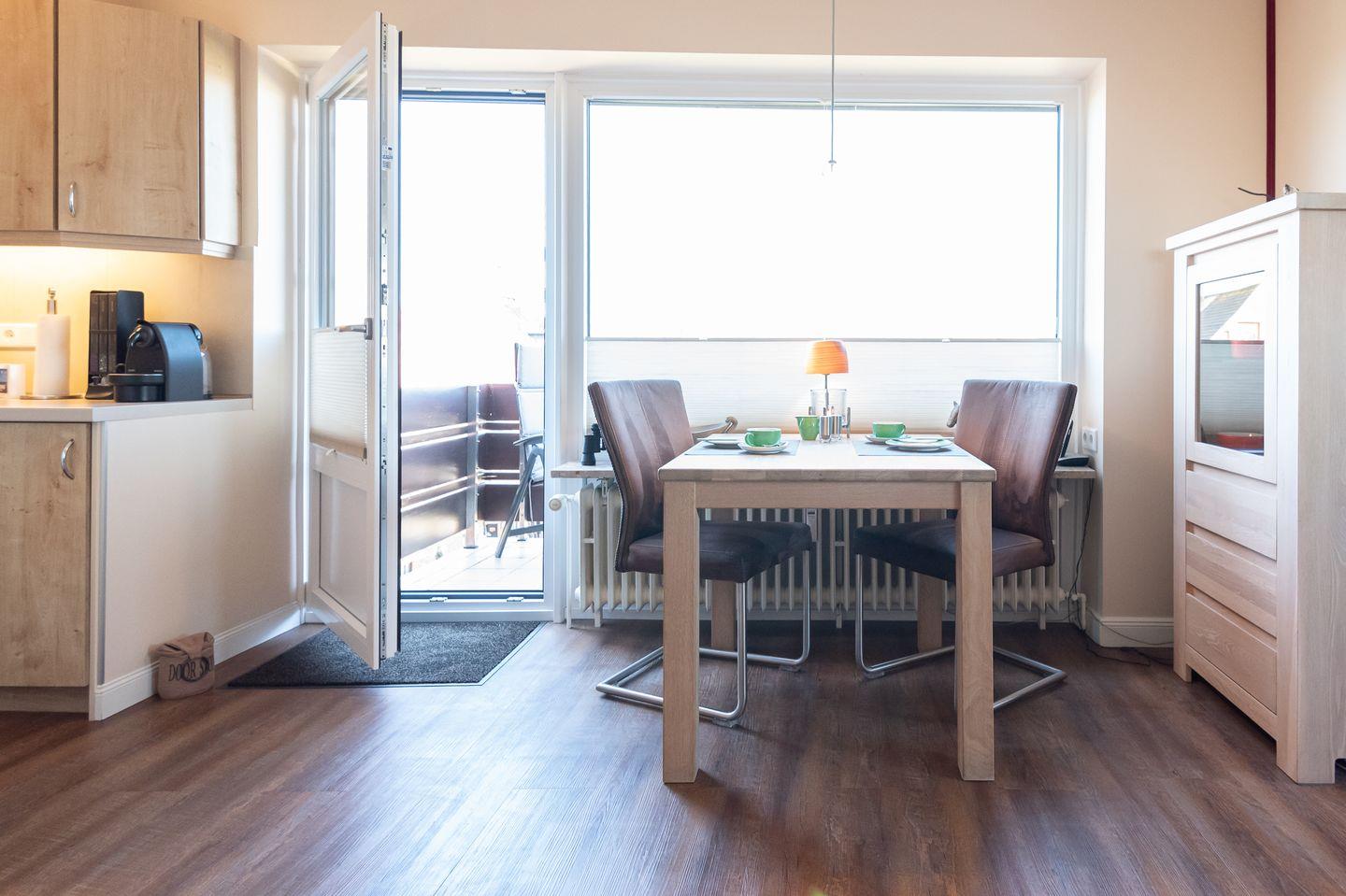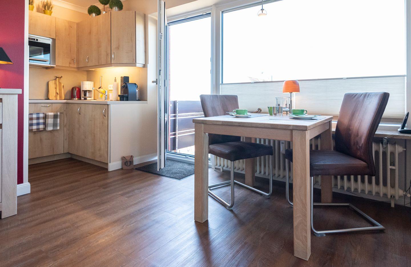 Koch-/Wohn-/Essbereich: Der Wohnraum bietet eine bequeme Wohnlandschaft mit großem Flachbild TV und einer Bose-Musikanlage sowie einen gemütliche Essplatz am Fenster. Die geräumige Einbauküche mit sehr guter Ausstattung wurde geschickt separiert. Auf dem geräumigen, möblierten Balkon können Sie bis zum späten Abend die Sonne genießen.