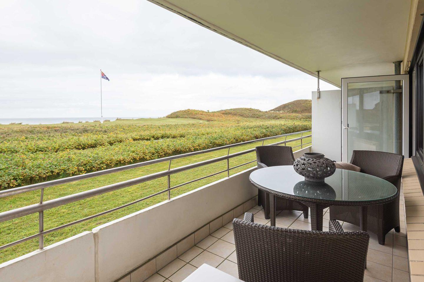 Wohn-/Koch-/Essbereich: Die geräumige, offene Einbauküche und der gemütliche Esstisch laden zu einem ausgiebigen Frühstück mit Meeresblick ein. Zum Entspannen und Lesen stehen zwei bequeme Sofas und ein Flachbild TV bereit. Über die gesamte Wohnbreite liegt der wunderbare Westbalkon mit Blick auf Dünengras, Heckenrosen und die Nordsee.