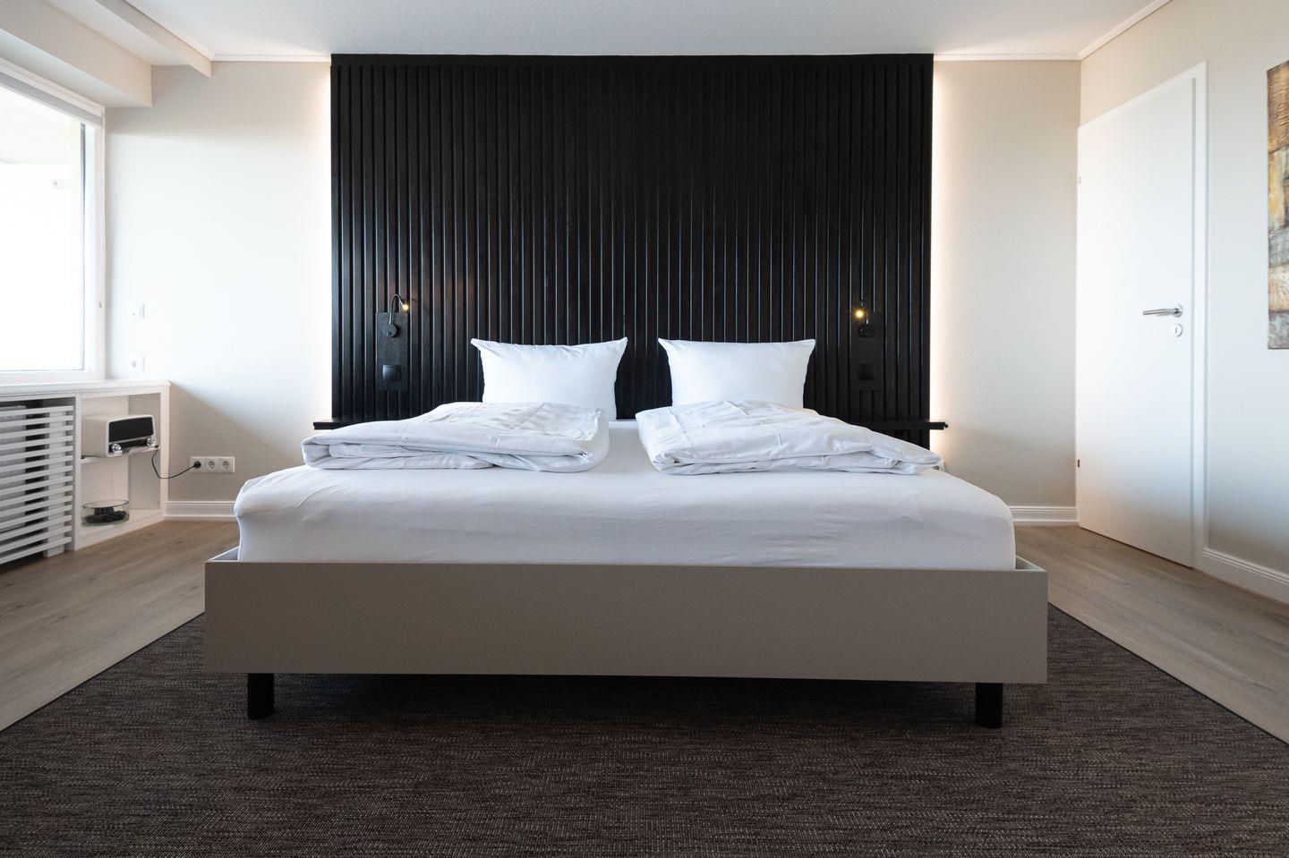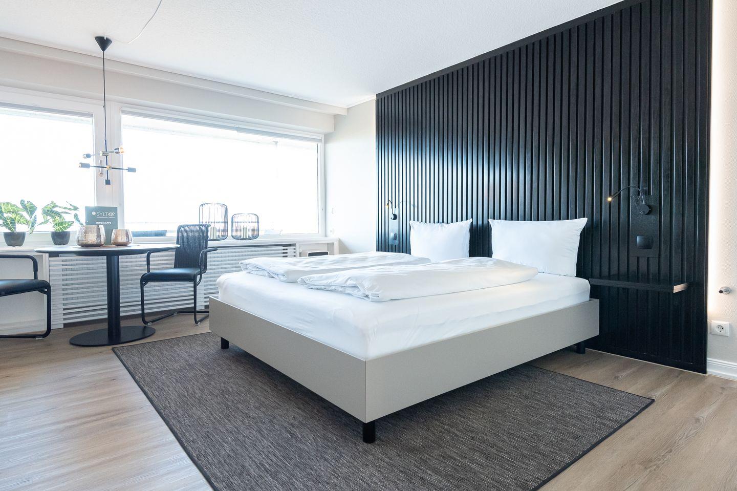 Eine weitere Schiebetür verbindet sie mit dem Wohn-/Schlaf- und Essbereich: Der helle Raum ist mit Flatscreen-TV, gemütlicher Sitzgruppe und einem schönen Essbereich ausgestattet, der mit Blick auf das Meer zum Verweilen einlädt. Ein modernes und hochwertiges Doppelbett für 2 Personen bietet höchsten Schlaf-Komfort. Über die gesamte Wohnungsbreite erstreckt sich der große und möblierte West-Balkon mit dem atemberaubenden Blick auf die Nordsee, wunderschöne Sonnenuntergänge inklusive.