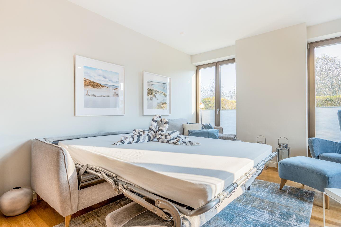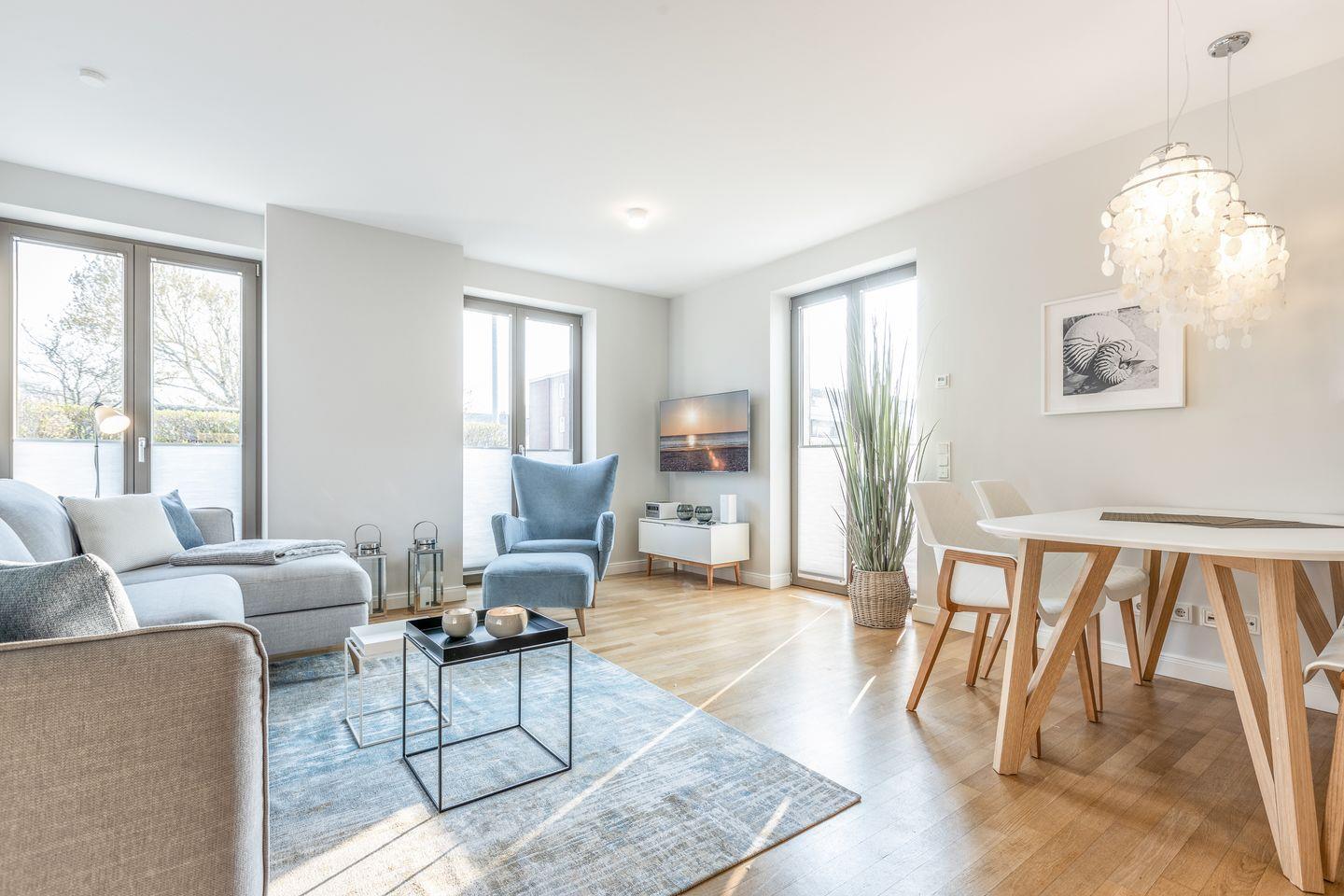 Die modernen "Strandhäuser" bieten eine einzigartige Wohn- und Raumatmosphäre. Die einladende Architektur wurde auch in dem geräumigen Erdgeschossdomizil über zwei Ebenen fortgeführt.