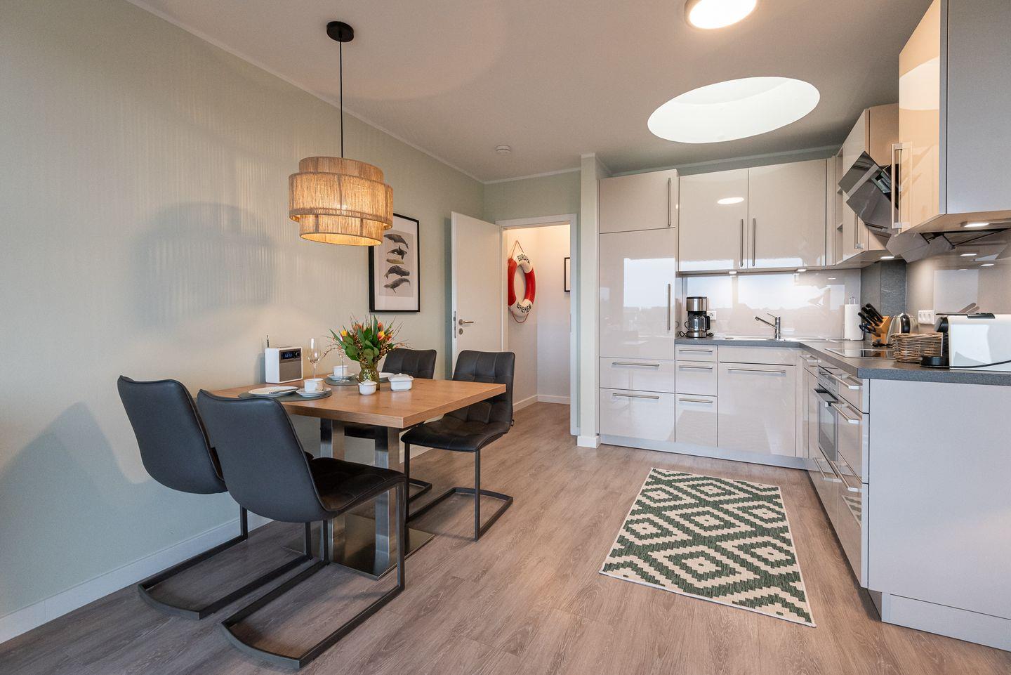 Koch-/Wohn-/Essbereich: Das großzügige Wohnzimmer mit Entertain TV bietet neben einer gemütlichen Sitzecke und schönem Essbereich, einen großen Südbalkon mit Strandkorb und seitlichem kleinen Meerblick. Die offene, hochwertig ausgestattete Küche lädt zum genüsslichen Kochen ein. Eine Glaskuppel direkt über der Küchenzeile verleiht dem Wohnbereich zusätzliches Tageslicht.