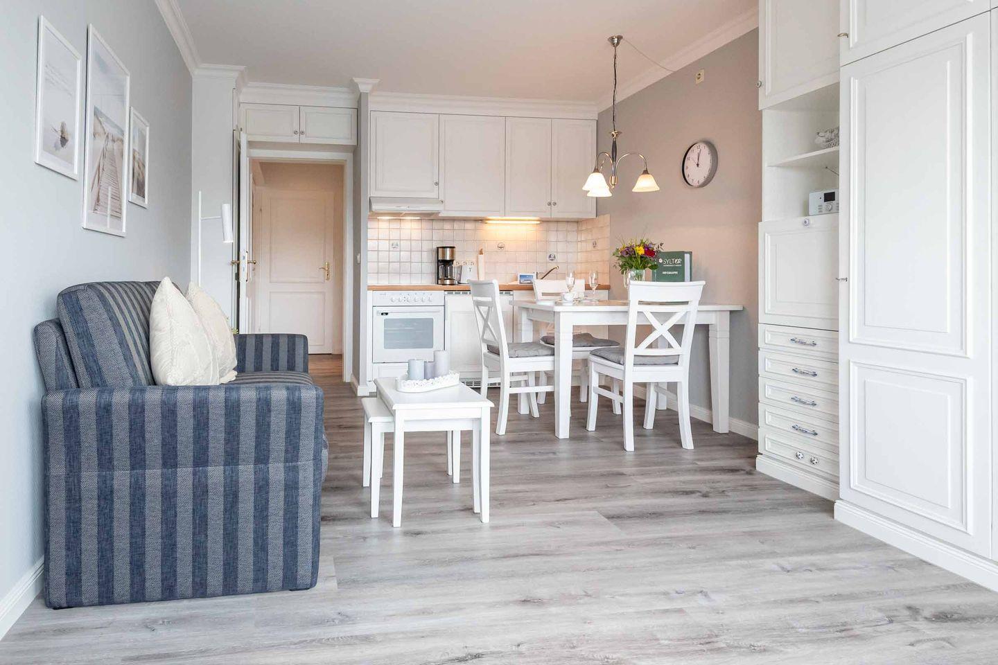 Koch-/Wohn-/Essbereich: Die Küchenzeile mit guter Ausstattung wurde geschickt integriert und grenzt an den gemütlichen Essbereich. Der helle Wohnraum verfügt über ein bequemes Sofa, einen Sessel, TV, Stereo-Musikanlage und viel Stauraum. Von hier gelangen Sie auf den geräumigen Ost-Balkon, auf dem Sie beim Frühstück die Morgensonne genießen können.