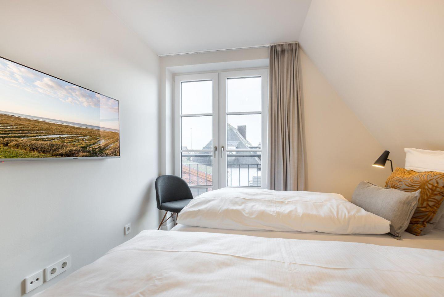 Schlafzimmer: Doppelbett, hochwertige Möbel, TV sowie ein großes Fenster.