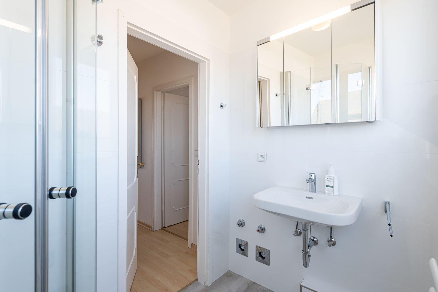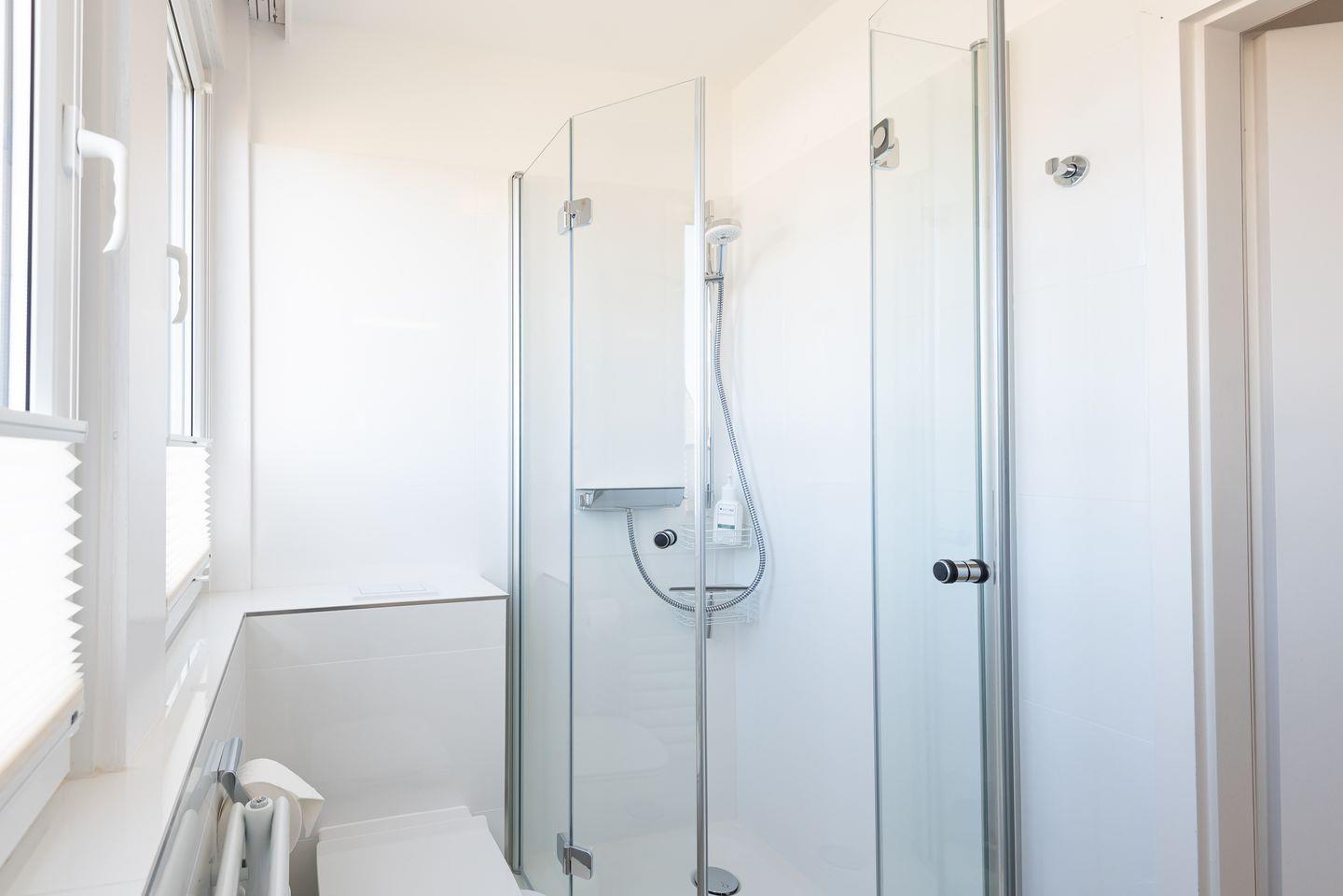 Badezimmer: Helles, modernes Duschbad mit WC und Fenster.